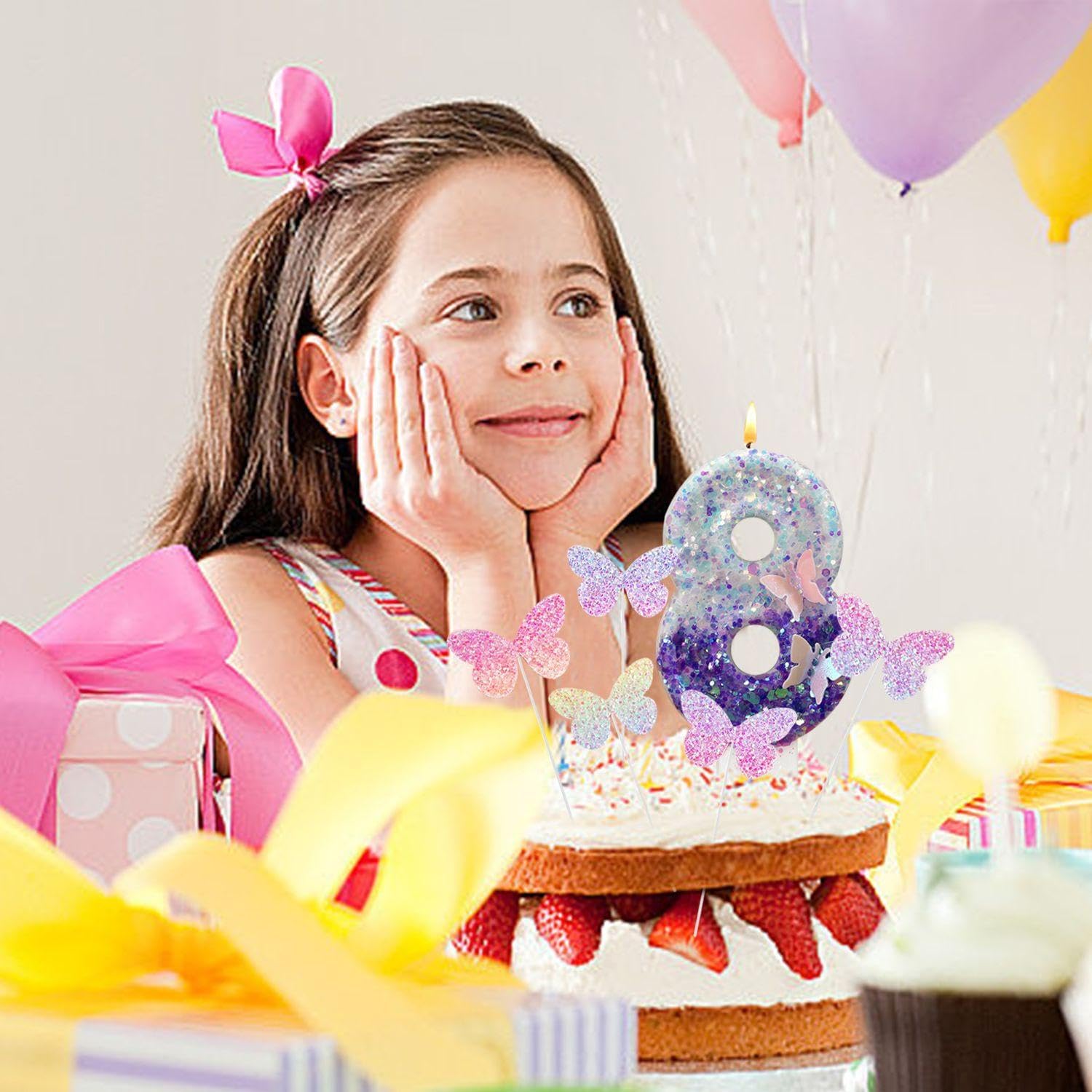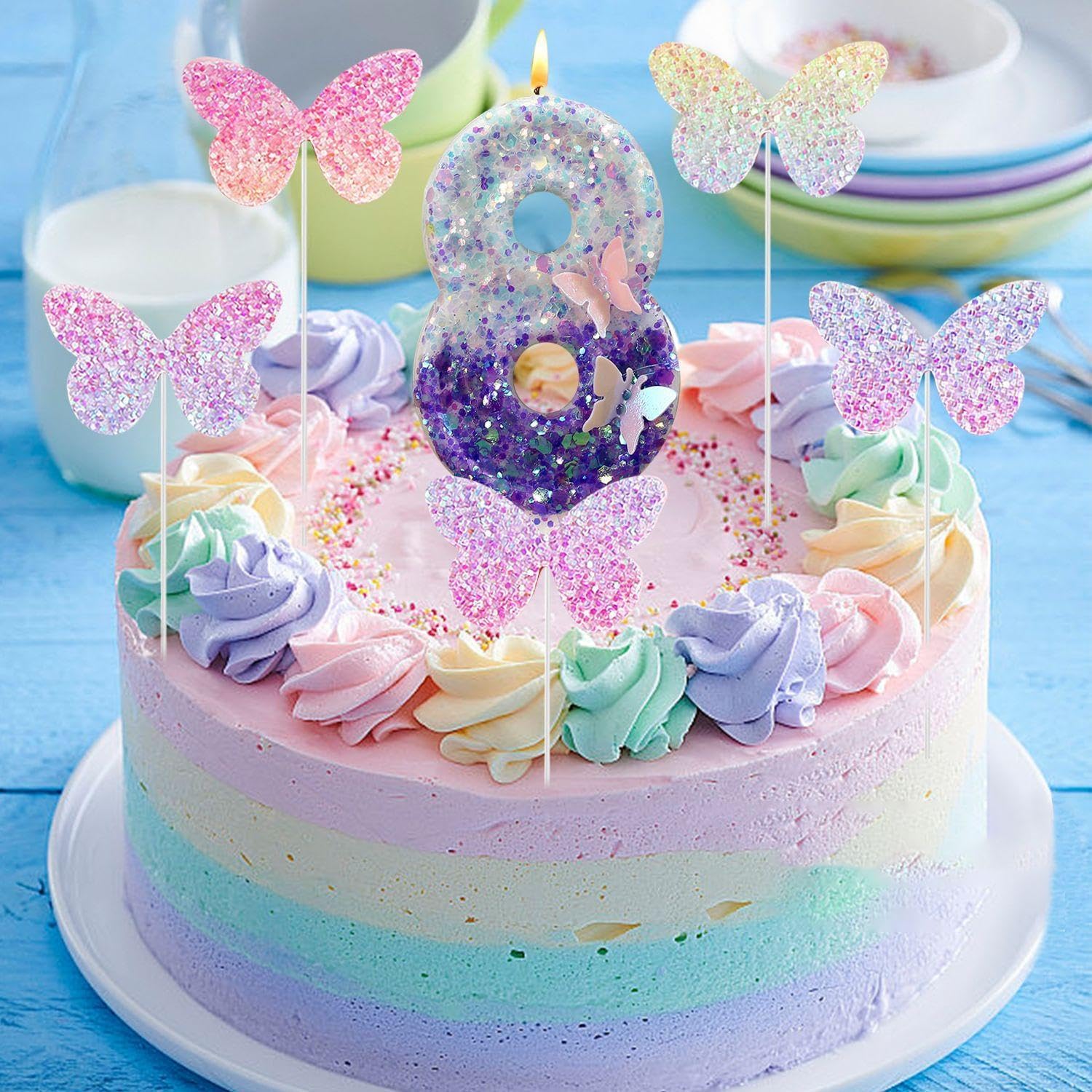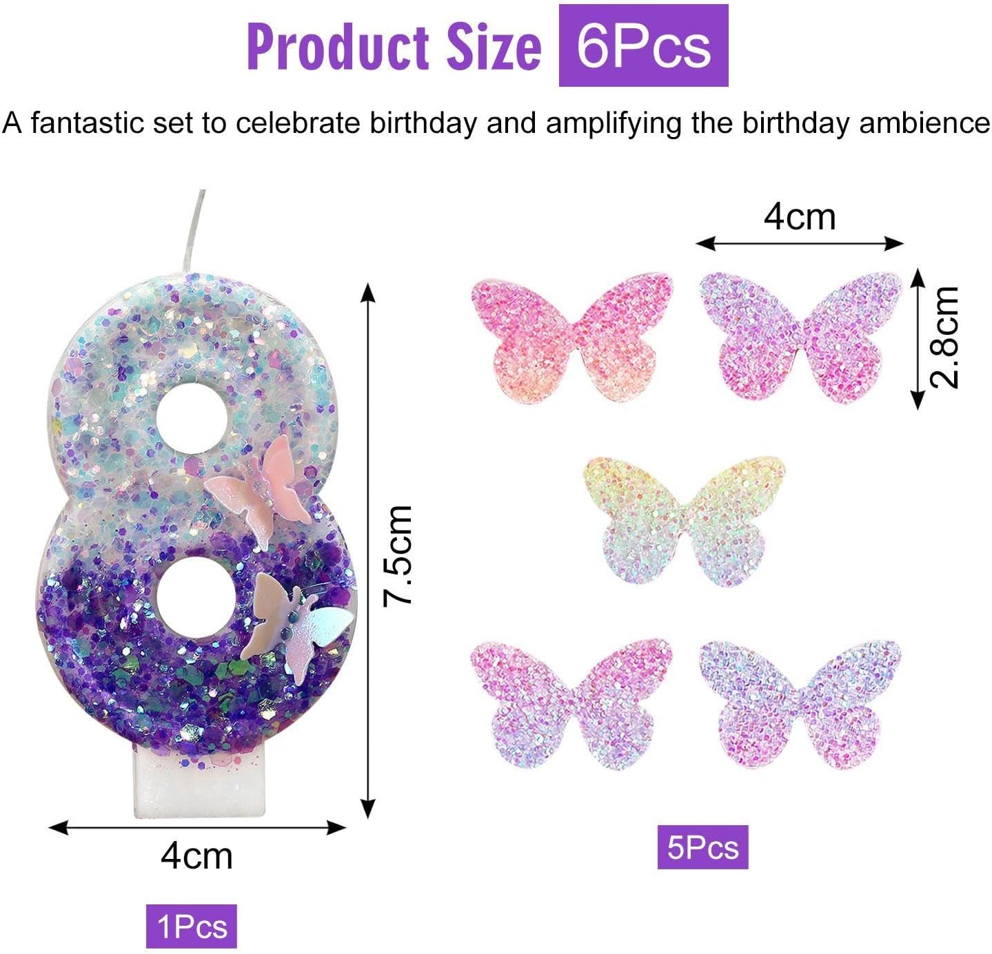 【Contenuto Del Prodotto】 Riceverai 1 Candela Numero 8 E 5 Inserti A Farfalla Sfumati. La Dimensione Della Candela Con Il Numero 8 È Di Circa 7, 5 X 4 Cm Ed Il Colore È Viola E Bianco; La Dimensione Del Biglietto Con Farfalla Sfumata È 4 X 2, 8 Cm E Il Colore È Sfumato, Adatto Per La Decorazione Della Torta Di Compleanno. 【Materiale Del Prodotto】 La Candela Di Compleanno Numero 8 Di Questo Prodotto È Realizzata In Cera, Che È Sicura E Pratica. La Carta Con Farfalla Sfumata È Realizzata In Materiale Cartaceo, Leggero E Facile Da Usare. Il Colore È Brillante E Non Sbiadisce Facilmente. 【Design Unico】 Questo Prodotto Ha Un Design Unico E La Candela Numero 8 Ha Una Bella Forma, Adatta A Varie Feste Di Compleanno. L'Inserto A Farfalla Sfumata È Squisitamente Progettato E Ha Un Notevole Effetto Sfumato, Aggiungendo Divertimento E Bellezza Alla Torta. 【Applicazione Multifunzionale】 Questo Articolo Non È Adatto Solo Per Decorare Torte Di Compleanno, Ma Anche Per Altri Dolci E Prodotti Da Forno. Che Si Tratti Di Una Riunione Di Famiglia O Di Una Grande Festa, Può Aggiungere Una Decorazione Unica Alla Tua Tavola. 【Facile Da Usare】 Questo Prodotto È Facile Da Usare, Le Candele Digitali Possono Essere Facilmente Accese Posizionandole Sulla Torta E Gli Inserti A Farfalla Possono Anche Essere Facilmente Inseriti Nei Pasticcini Per Aggiungere Effetti Decorativi Ai Tuoi Dessert.