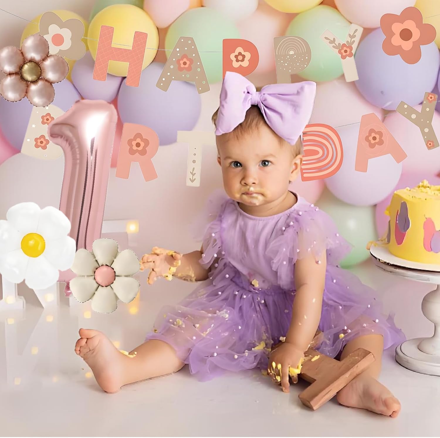 Decorazione di compleanno con margherite: riceverete 1 palloncino in oro rosa per 1 anno, 2 palloncini con margherite bianche, 2 palloncini con margherite cachi e 2 palloncini con margherite in oro rosa. 1 ghirlanda di margherite di compleanno e 1 rotolo di nastro, decorazione per il 1° compleanno, perfetta per decorazioni per feste di compleanno.