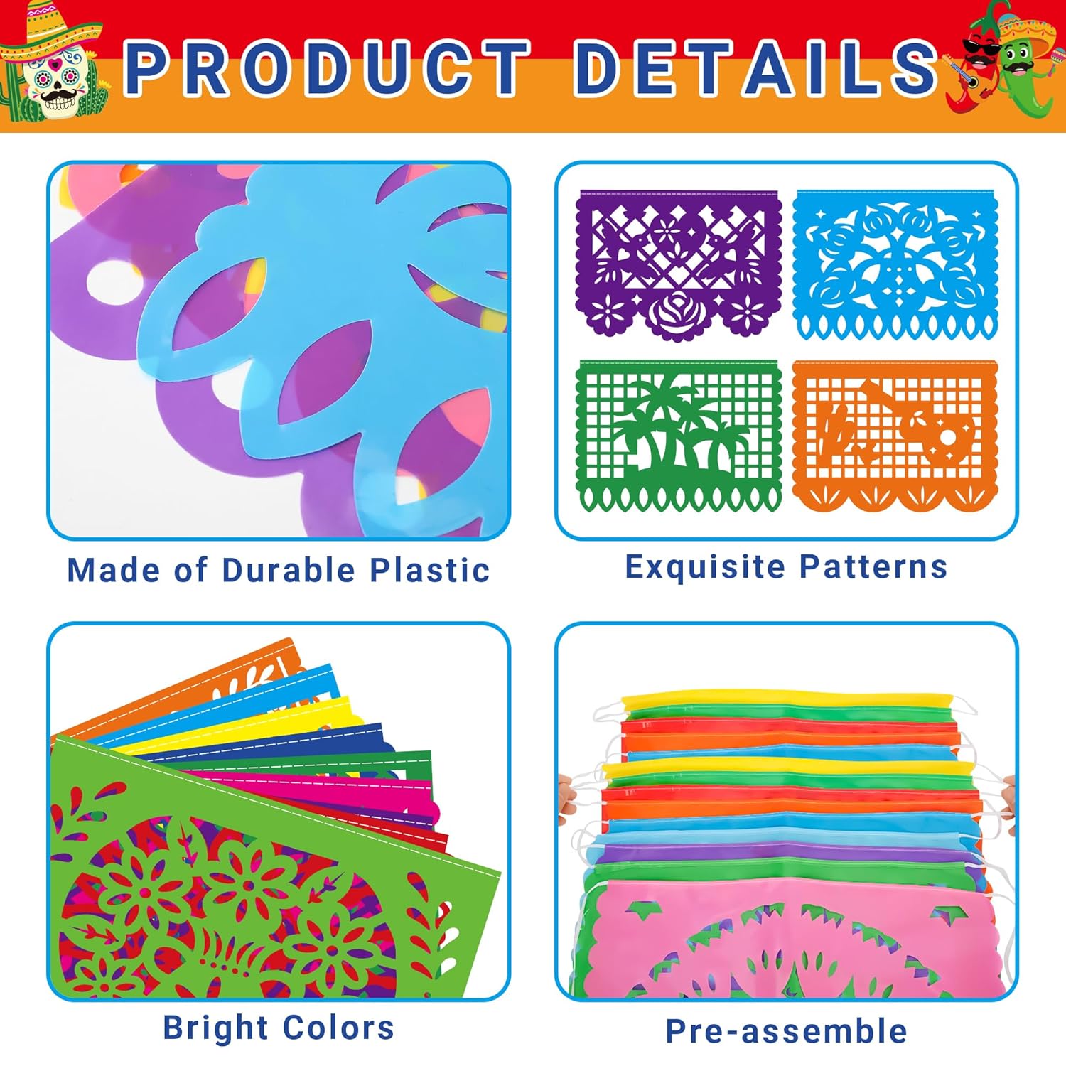 Il pacchetto include: riceverai 1 confezione di striscioni Cinco De Mayo con una lunghezza totale di 4,7 m, inclusi 9 pezzi di bandiere in plastica, ogni pezzo misura 41 x 30 cm. DESIGN SQUISITO - Il nostro striscione picado in plastica è progettato con colori vivaci e 9 squisiti motivi messicani come cactus, chitarra, sole, fiore, ecc. Può essere perfettamente visualizzato da qualsiasi angolazione grazie al design fronte-retro. Fantastiche decorazioni per feste Cinco De Mayo per più atmosfera. Corda per striscioni preassemblati: ogni confezione di striscioni per feste messicane è preassemblata, puoi appendere questi striscioni messicani direttamente dove desideri decorarli. MATERIALE DI ALTA QUALITÀ - Realizzate in materiale plastico di alta qualità, queste decorazioni Cinco De Mayo sono costruite per durare e offrono proprietà di resistenza e impermeabilità adatte sia per decorazioni per feste messicane interne che esterne. Ampia applicazione: queste decorazioni Fiesta sono adatte per feste a tema messicane, feste a tema Cinco De Mayo, feste a tema Fiesta, Dia De Los Muertos, Giorno dei Morti, ecc. Decorazioni messicane perfette per casa, ufficio, cortile, recinzione, veranda, soffitto, parete, ecc.