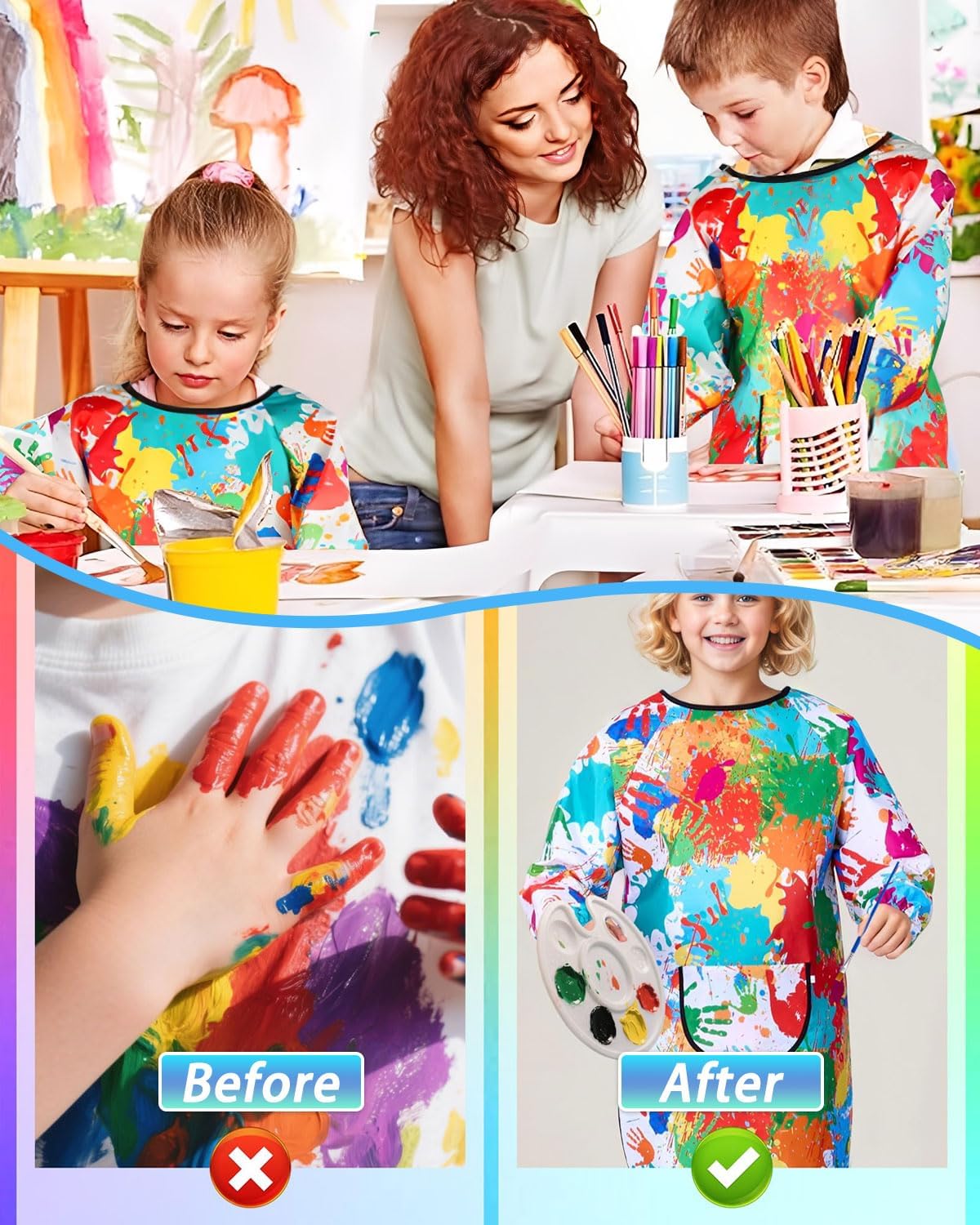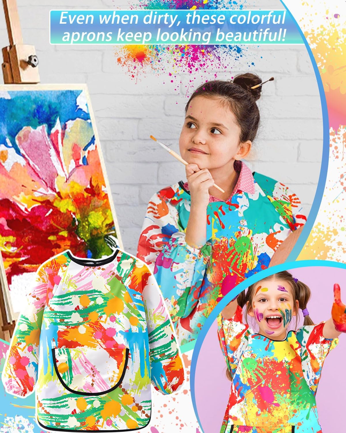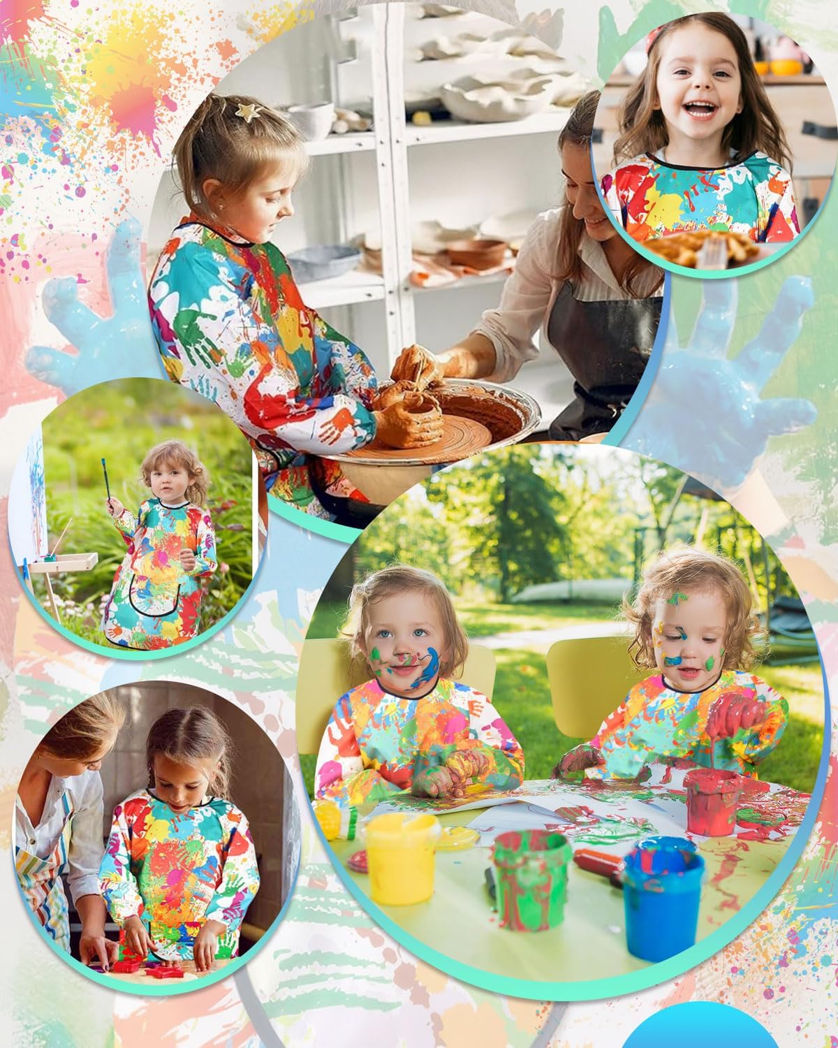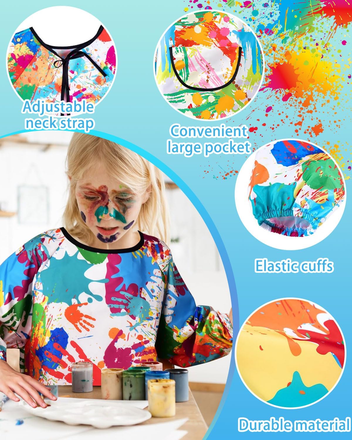 Grembiule da pittura per bambini: questo grembiule artistico misura 55 cm di lunghezza con un'altezza del torace di 46 cm. Dotato di maniche lunghe per una maggiore protezione, offre un'eccellente copertura, mentre i polsini aderenti consentono di arrotolare facilmente le maniche per lavarsi le mani. Design pratico: la chiusura regolabile garantisce un utilizzo intuitivo. Una tasca frontale consente ai bambini di riporre pennelli ad acqua, colori, snack, fazzoletti e altri oggetti essenziali. Protezione completa: realizzato in materiale impermeabile, mantiene puliti i vestiti del bambino. Qualità e sicurezza: realizzati in poliestere liscio e impermeabile, questi grembiuli da pittura per bambini sono leggeri e resistenti. Riutilizzabili, si puliscono con un panno o possono essere facilmente lavati con acqua e sapone. Indispensabili per la vita quotidiana: adatti a bambini di età compresa tra 2 e 4 anni durante la pittura, la cucina, i pasti, i lavori manuali (come la pittura con le dita) e altre attività ricreative. Regalo ideale: caratterizzati da bellissimi colori e da una sartoria raffinata, questi grembiuli per bambini sono regali perfetti per feste di compleanno, Pasqua e Natale. Perfetti per i bambini che si dedicano a lavori manuali, pittura o altri progetti che comportano sporcarsi.