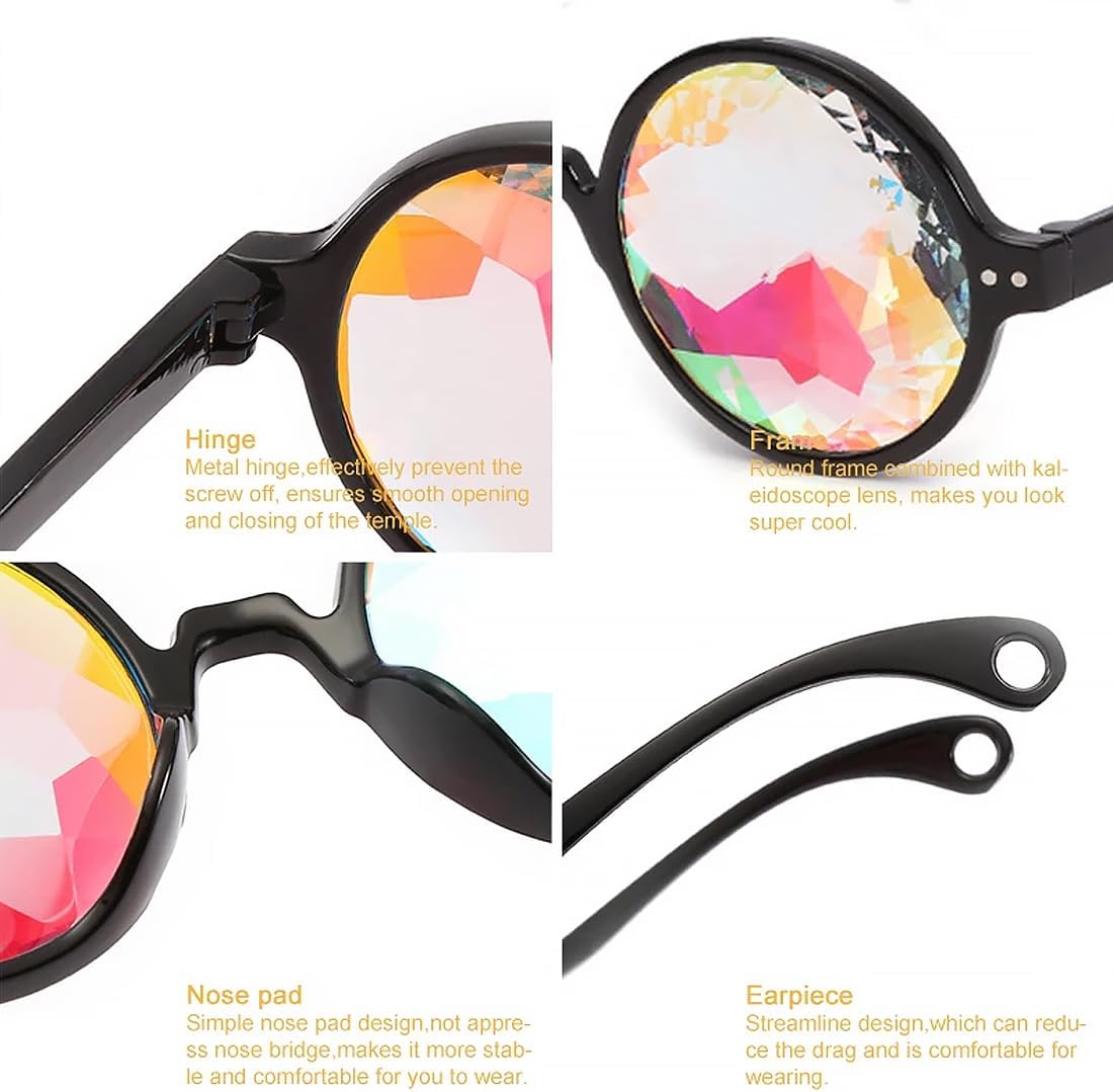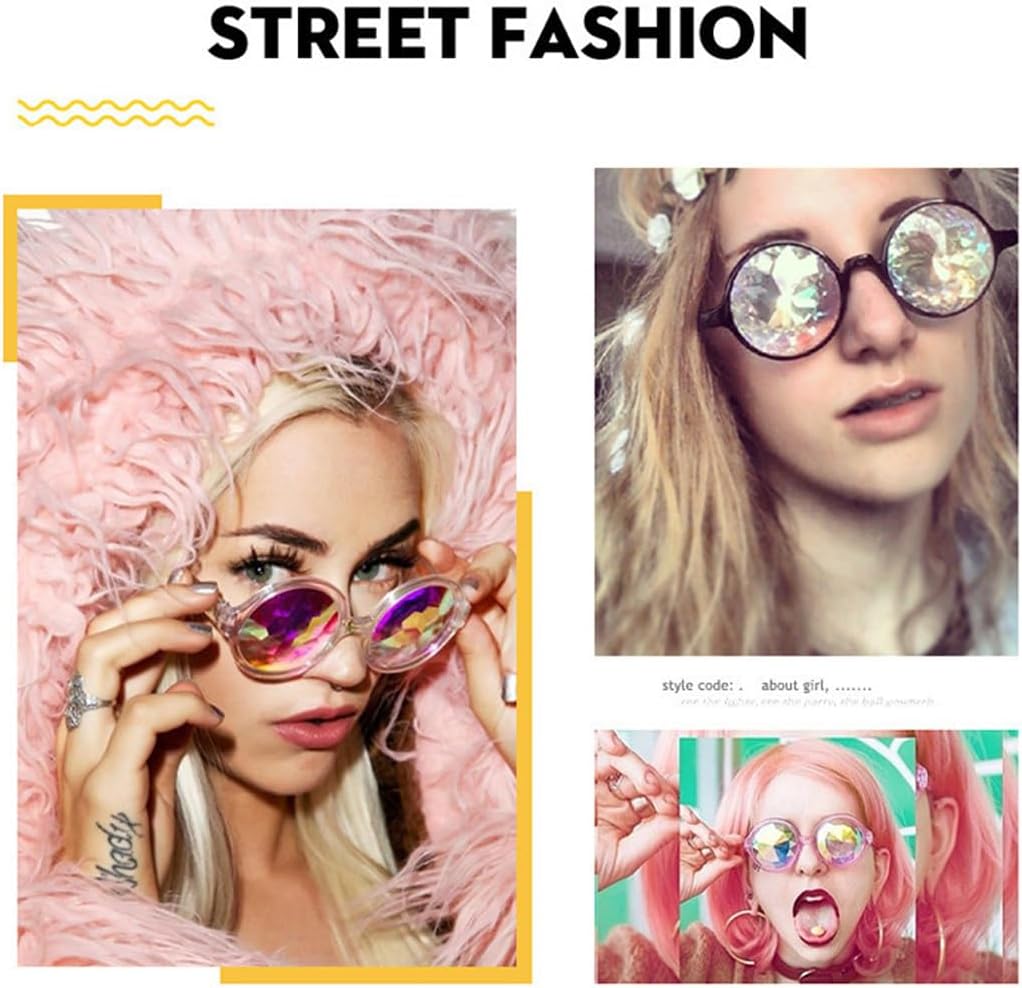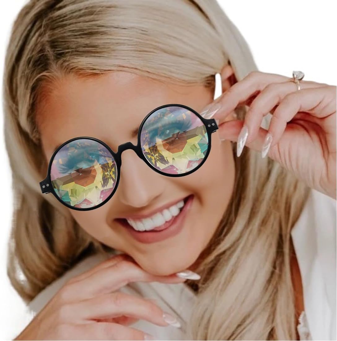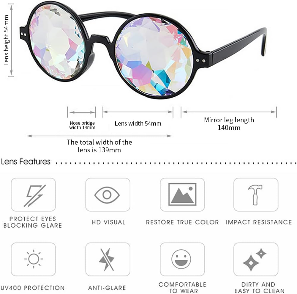 Materiale resistente: Realizzati con una montatura in PC robusto e lenti in resina di alta qualità, questi occhiali offrono un intenso effetto caleidoscopio. Il design elegante e compatto li rende durevoli e facili da pulire, perfetti per festival o feste Effetto caleidoscopio arcobaleno: Le lenti sfaccettate di questi occhiali da festival creano un sorprendente effetto caleidoscopio arcobaleno. Ideali per brillare con colori scintillanti durante spettacoli di luci, festival musicali o feste rave Comodità garantita: Grazie al design leggero e alla misura standard, questi occhiali si adattano comodamente alla maggior parte degli adulti. Si posano delicatamente sul naso, rendendoli ideali per essere indossati per ore durante eventi o festival Versatilità d'uso: Perfetti per rave, cosplay, spettacoli di luci, feste con fuochi d'artificio e discoteche. Nota: non sono adatti come occhiali da sole tradizionali e non devono essere indossati durante la camminata o la guida Misure precise: Altezza della montatura di circa 54 mm, larghezza delle lenti 54 mm, larghezza totale circa 139 mm, lunghezza delle aste circa 140 mm e larghezza del ponte nasale 14 mm. Queste dimensioni garantiscono una vestibilità ottimale e un comfort eccellente