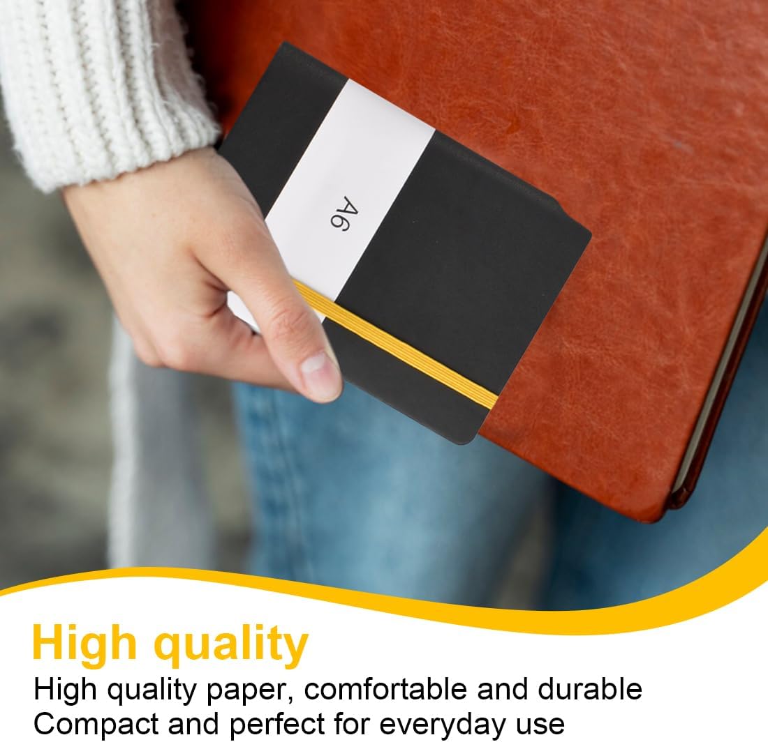 NOTEBOOK LINEA A6 - Questo notebook da 192 pagine misura 14,8 x 10,5 cm ed è di colore nero. È molto elegante e perfetto da portare in giro. CARATTERISTICHE - Questo taccuino è dotato di carta spessa di alta qualità, una tasca interna, una copertina in ecopelle liscia e una fascia elastica. CARTA PREMIUM - Carta da 100 g/m² priva di acidi, nessun rischio di fuoriuscita di inchiostro o ristampa. Le pagine color avorio impediscono il riflesso della luce e proteggono gli occhi. COPERTURA ELEGANTE - La copertura è realizzata in ecopelle di alta qualità, molto comoda e resistente. La copertina è nobile ed elegante, adorerai questo taccuino. POTENTE - Questo quaderno a righe è perfetto per l'uso quotidiano e consente di prendere appunti, inserire nel diario o colorare.