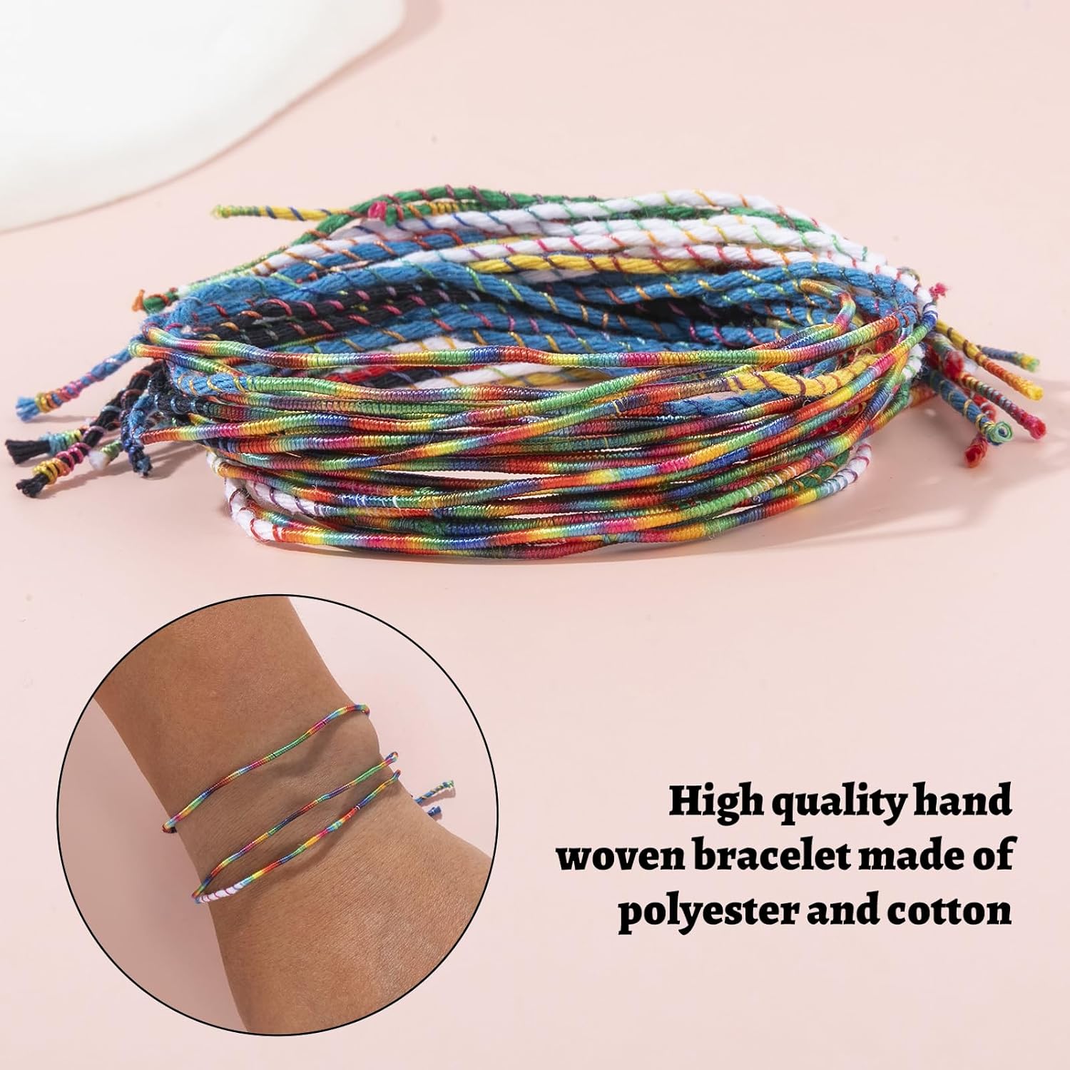 Diversi braccialetti dell'amicizia intrecciati: include 100 braccialetti intrecciati arcobaleno (6 colori diversi) per soddisfare diverse esigenze. I colori vivaci e il ricco design arcobaleno portano allegria e sono molto apprezzati da bambini, adolescenti, ragazze e ragazzi, offrendo un'ampia scelta. Materiale di alta qualità: i braccialetti intrecciati a mano sono realizzati in poliestere e cotone. Leggeri e comodi, sono sicuri da indossare e non causano alcun fastidio al polso. Inoltre, sono atossici e innocui e non danneggiano la pelle. I braccialetti sono molto resistenti, non si scoloriscono, non si rompono e non si consumano, quindi sono adatti per essere indossati a lungo dai bambini. Design regolabile: il braccialetto dell'amicizia è regolabile da 18 a 33 cm, adatto alla maggior parte dei bambini e degli adolescenti. Questo braccialetto dell'amicizia intrecciato è regolabile in lunghezza, può essere facilmente stretto o allentato per adattarsi al polso. È comodo da indossare, facile da mettere e da togliere e non si stacca facilmente. Versatile: questi braccialetti colorati sono perfetti per decorare sacchetti di caramelle, scatole regalo, piccoli regali per feste e premi scolastici, ma sono anche adatti per balli, feste, compleanni e cerimonie di ogni tipo. Sono bellissimi accessori da indossare ogni giorno e alle feste, che aiutano le ragazze a creare look dolci. Regalo ideale: questi braccialetti dell'amicizia colorati sono un'ottima scelta come regalo di compleanno per i bambini, regalo per le feste, regalo per le feste, regalo di Capodanno, regalo di Natale, regalo di ricompensa per il gioco, ecc. I braccialetti dell'amicizia per bambini sono anche un simbolo di amicizia. Indossarli insieme è anche un ottimo modo per coltivare l'amicizia.