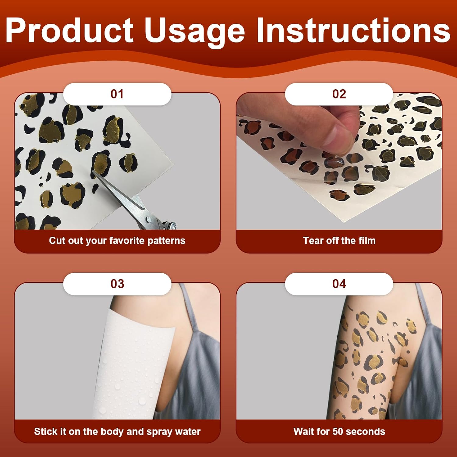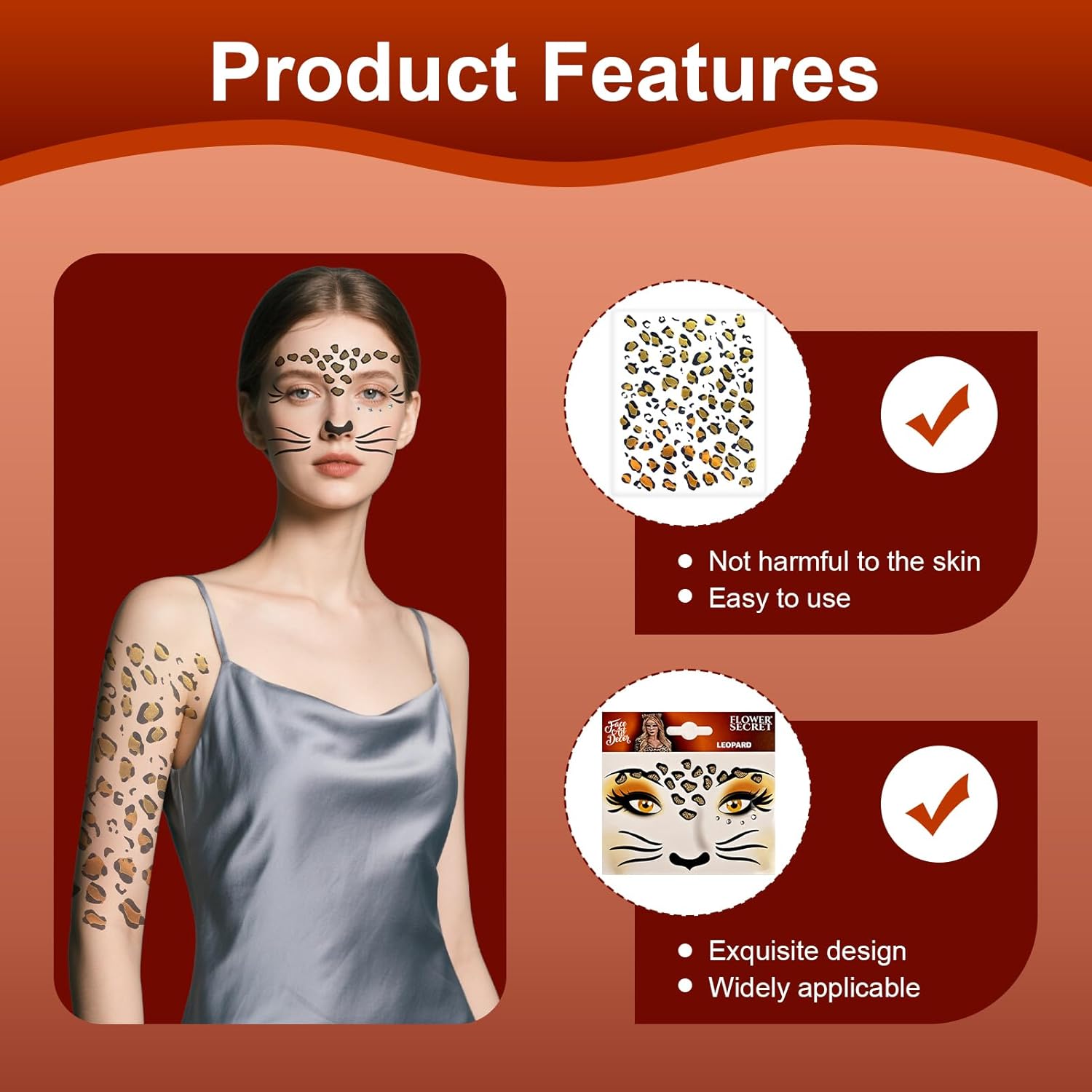 【Kit Leopardo Completo】Ricevi 2 fogli di tatuaggi per bambine con disegni unici: 1 per il viso + 1 per il corpo. Ideale per creare audaci look in costume da animali dalla testa ai piedi. Perfetto per fai da te creativi e personalizzazioni originali. 【Resistenza professionale】 I motivi leopardati mantengono la loro lucentezza per 12 ore senza trasferirsi o screpolarsi. Dermatologicamente testato per pelli sensibili (adatto dai 3 anni). 【Applicazione rapida】Stack-wet-peel in 30 secondi! Si rimuove indolore con acqua micellare. Nessun segno residuo o irritazione, anche su zone delicate come il contorno occhi. 【Accessorio magico di carnevale】 Trasformati in una bestia selvaggia per un accessorio di carnevale, serate cosplay o festival. L'89% degli utenti crea più di 3 look diversi (combinabili corpo/viso/capelli). 【Servizio clienti】 Forniamo il miglior servizio ai nostri clienti. Se riscontri problemi con i nostri prodotti, non esitare a contattarci in tempo e ti forniremo una soluzione ragionevole.