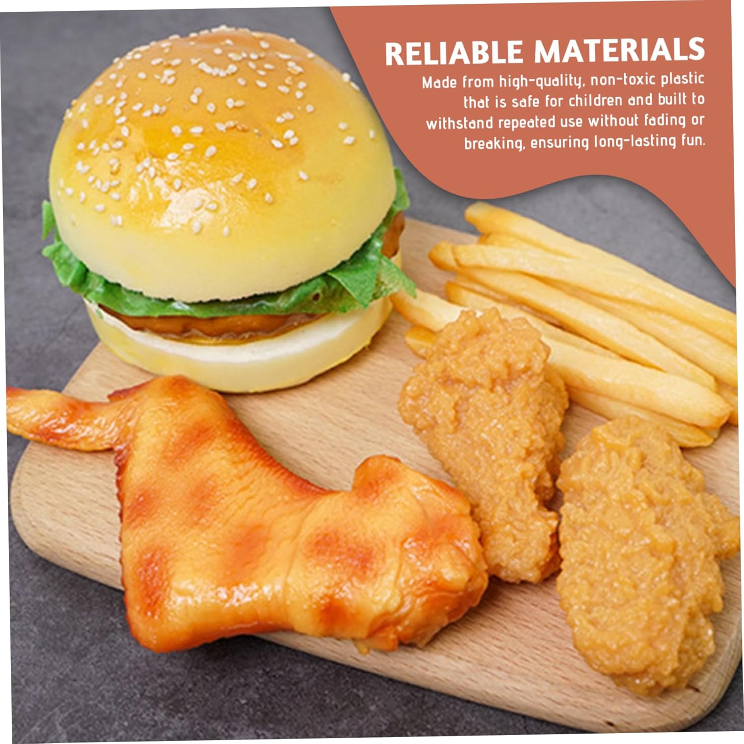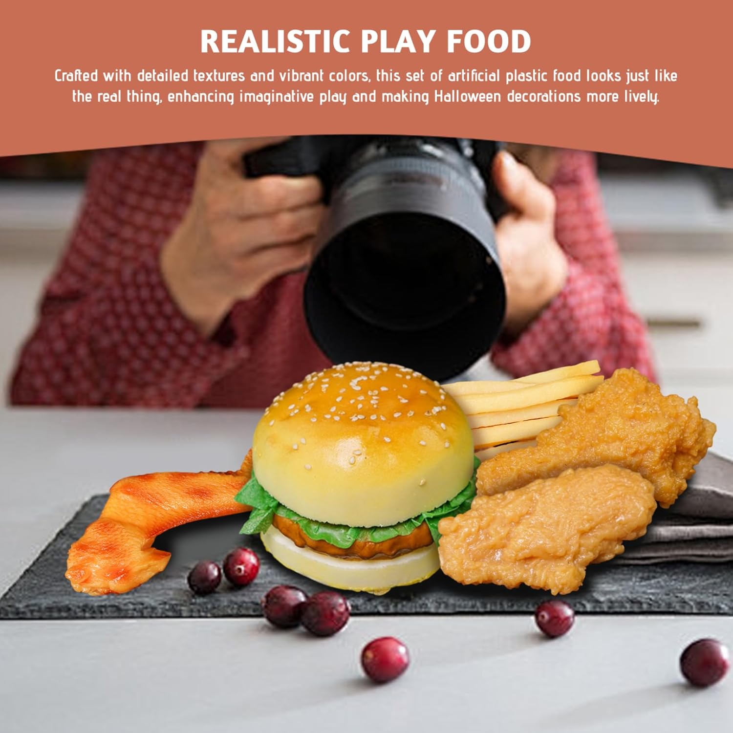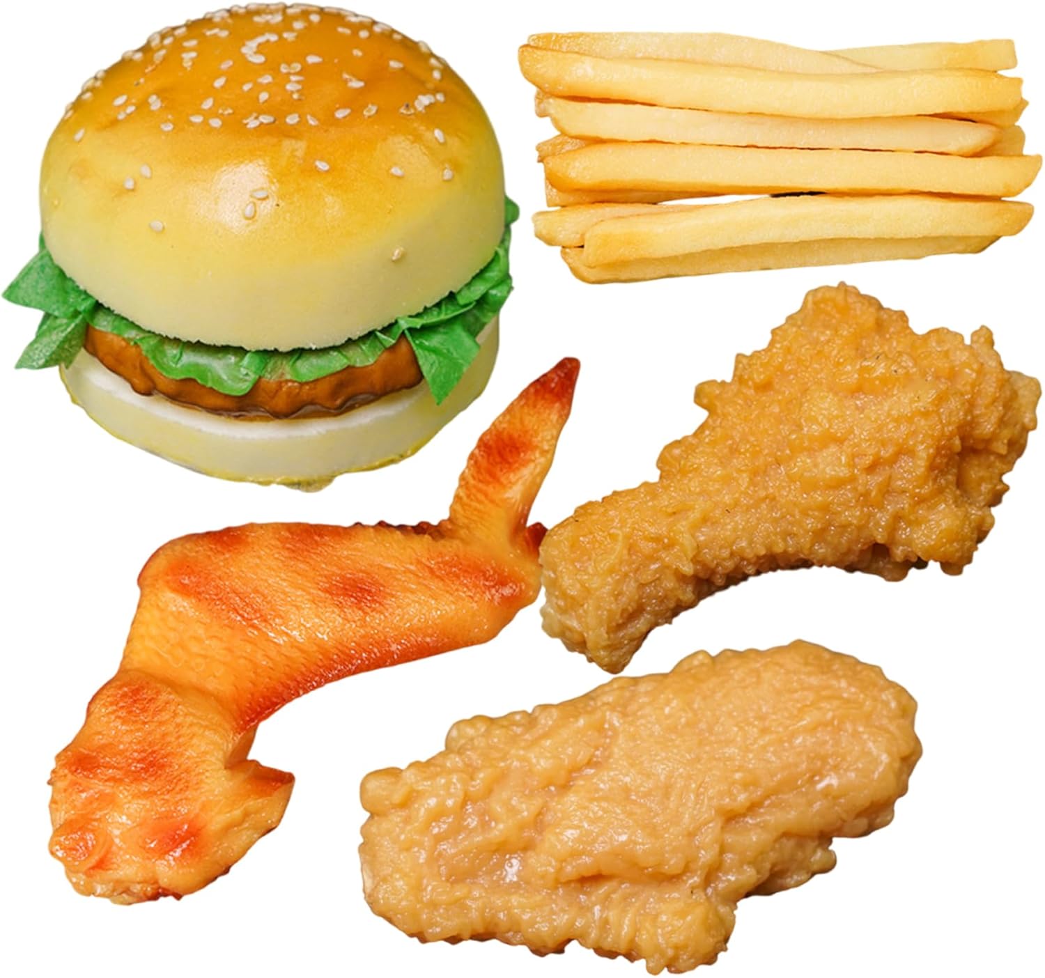 Set pasto completo: include piatti popolari come hamburger, pollo fritto e patatine fritte, aiutando i bambini a conoscere le categorie di alimenti e incoraggiando al tempo stesso il gioco di ruolo e l'interazione sociale. Per pulire e riporre: le superfici lisce consentono una pulizia rapida dopo il gioco e le dimensioni compatte garantiscono un comodo stoccaggio, rendendo questo set senza problemi per i genitori e ideale per l'uso quotidiano. Opzioni di utilizzo versatili: perfette per cucine da gioco, giocattoli alimentari, decorazioni per feste o oggetti di scena, offrendo valore multifunzionale sia per il gioco creativo dei bambini che per gli allestimenti festivi. Cibo da gioco realistico: realizzato con trame dettagliate e colori vivaci, questo set di cibo in plastica artificiale sembra proprio quello reale, migliorando il gioco fantasioso e rendendo le decorazioni di Halloween più vivaci. Materiali affidabili: realizzati in plastica atossica di alta qualità, sicura per i bambini e costruita per resistere a un uso ripetuto senza sbiadire o rompersi, garantendo un divertimento duraturo.