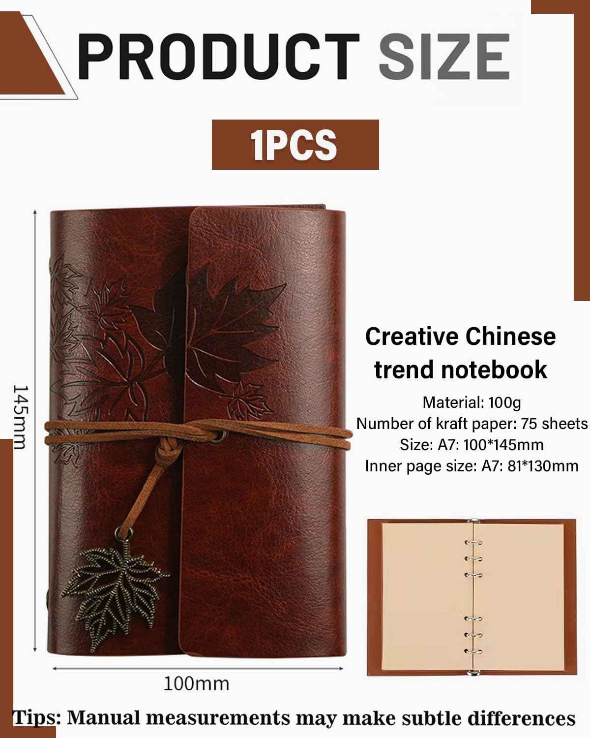 Diario vintage di alta qualità: la copertina in pelle PU resistente ed elegante è perfetta per i viaggi o le avventure all'aria aperta. Questo robusto quaderno a tema foglia d'acero è un regalo unico per tutti gli amici che amano le foglie d'acero e la natura! Carta spessa e resistenza all'inchiostro: carta A7 ricaricabile (75 fogli) realizzata con carta spessa da 100 g/m2. La carta priva di acidi è leggera e resistente all'aria. È ideale per penne stilografiche, penne unisex, penne a sfera, evidenziatori, matite, ecc. Quaderni vuoti e ricaricabili: nessuna riga, nessun limite! Puoi disegnare mappe mentali, abbozzare idee o prendere appunti su pagine bianche. Gli anelli di rilegatura fissi facilitano la rimozione delle pagine e la loro sostituzione con pagine bianche per riempirle di più! Ampio utilizzo: perfetto come quaderno da disegno, quaderno, diario di viaggio, agenda, organizzatore di coupon, libro per collezione di francobolli e album fotografico Ottima scelta regalo: stile senza tempo e semplice versatilità si uniscono in questa scelta popolare per l'uso quotidiano. È il regalo ideale per compleanni, Natale e altre festività memorabili.