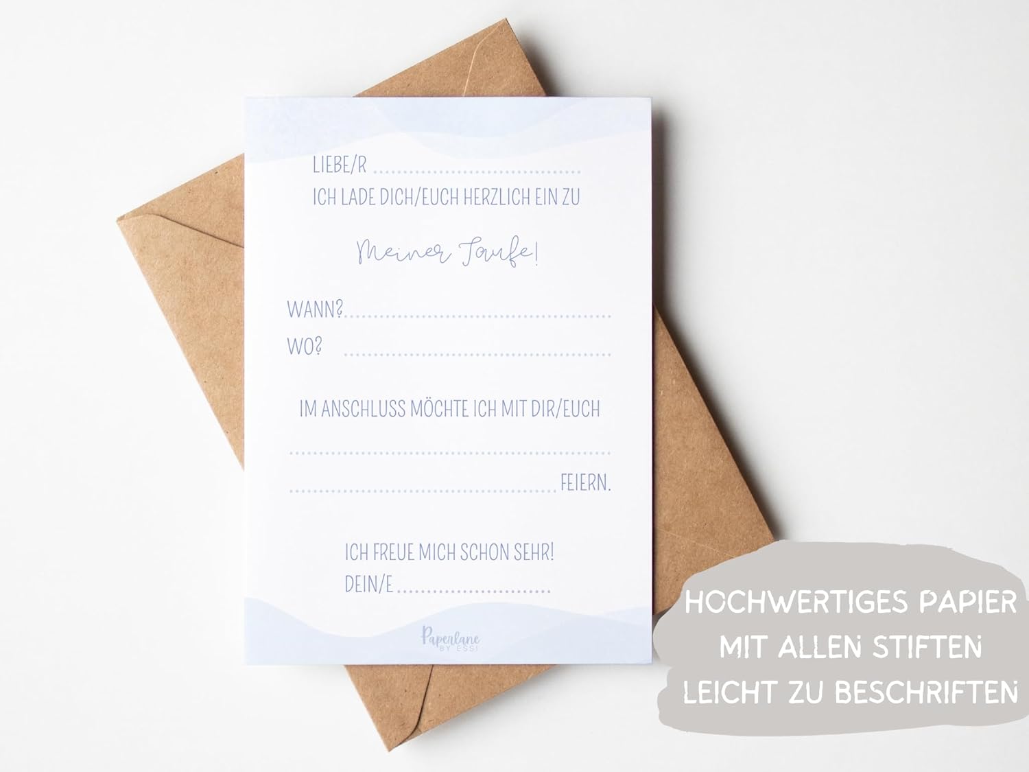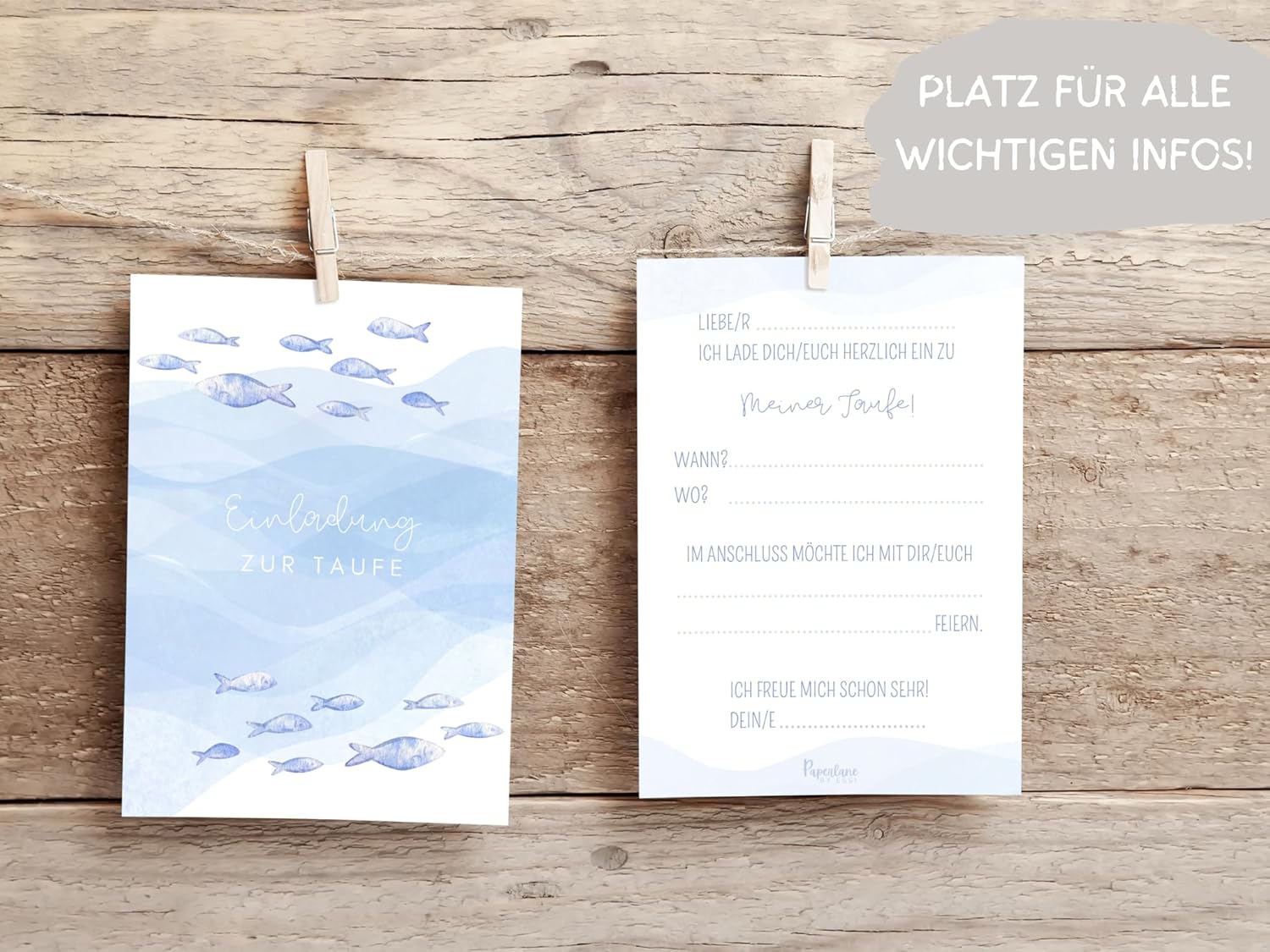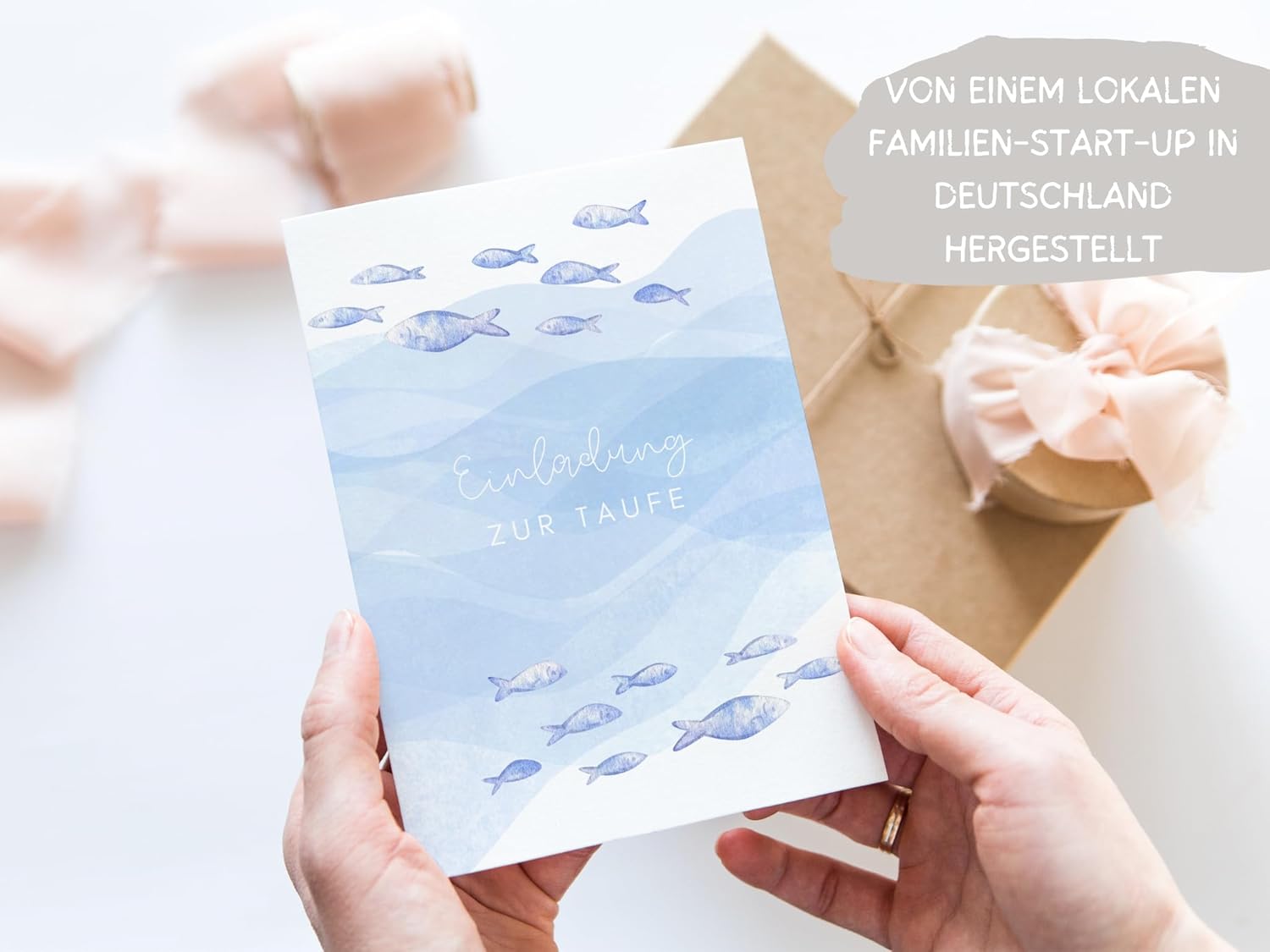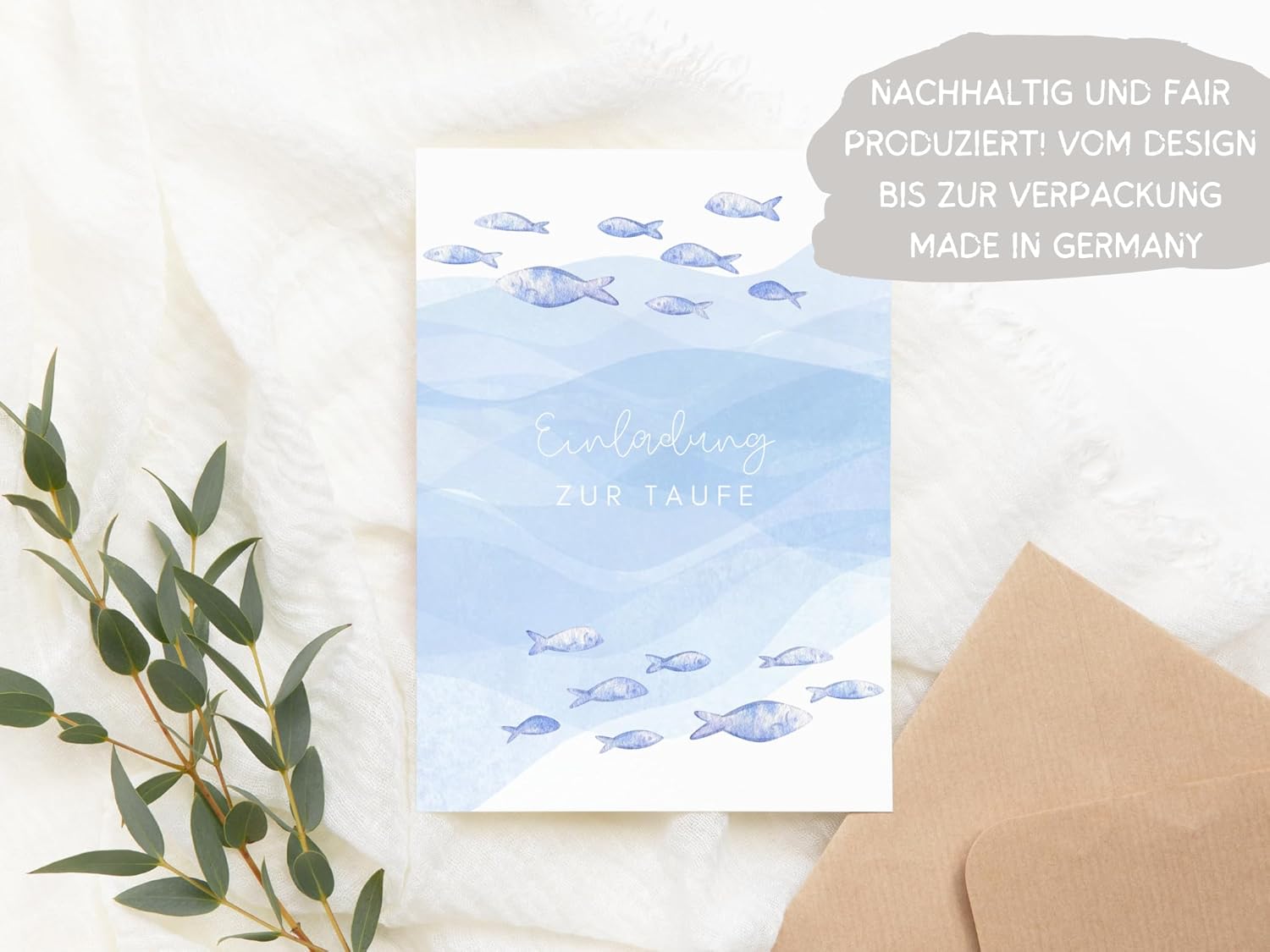 Invito battesimo: i nostri biglietti d'invito sono stati progettati con grande attenzione ai dettagli per l'effetto di battesimo del tuo bambino. Il motivo a forma di pesce in moderno stile acquerello conferisce alle cartoline un tocco fresco e allo stesso tempo senza tempo, che si adatta perfettamente all'atmosfera del battesimo del tuo bambino ed è una vera attrazione! FACILE E VELOCE: il retro dei biglietti di invito offre spazio sufficiente per tutte le informazioni importanti sull'effetto della rugiada: luogo, data, ora e dettagli aggiuntivi possono essere aggiunti senza sforzo. Basta compilare, distribuire e siete pronti! DESIGN SPECIALE: il motivo pesce in delicate tonalità di blu è stato progettato con attenzione ai dettagli. Come piccola start-up per famiglie, diamo particolare importanza al design moderno e ai prodotti pratici che facilitano la vita a te e alla tua famiglia. Alta qualità: ci affidiamo alla qualità di prima classe. I biglietti sono realizzati in robusto cartone cromato (260 g/m²) con una superficie opaca che si può scrivere in modo eccellente. Le buste abbinate, realizzate in carta kraft di alta qualità, completano l'elegante pacchetto complessivo. MADE IN GERMANY: i nostri prodotti sono realizzati in Germania con la massima cura e sostenibilità, dalla progettazione all'imballaggio. Affidati alla qualità e supporta la produzione locale.