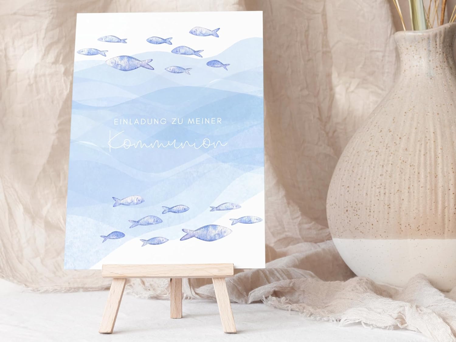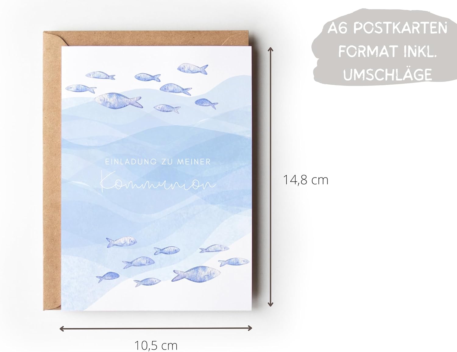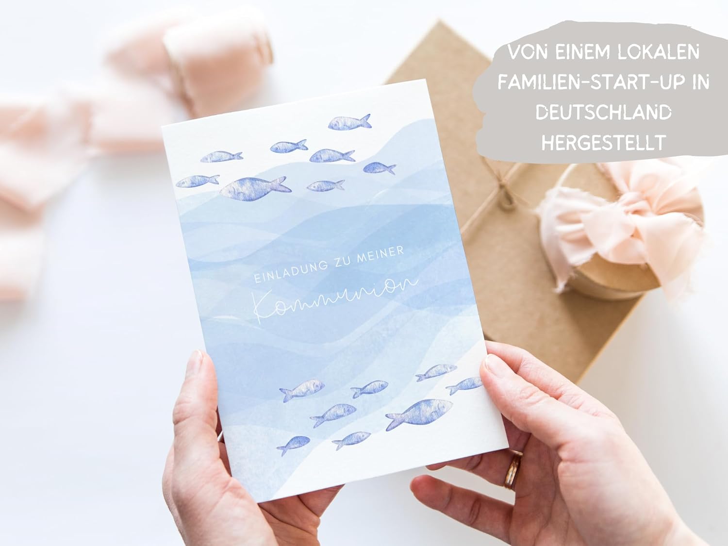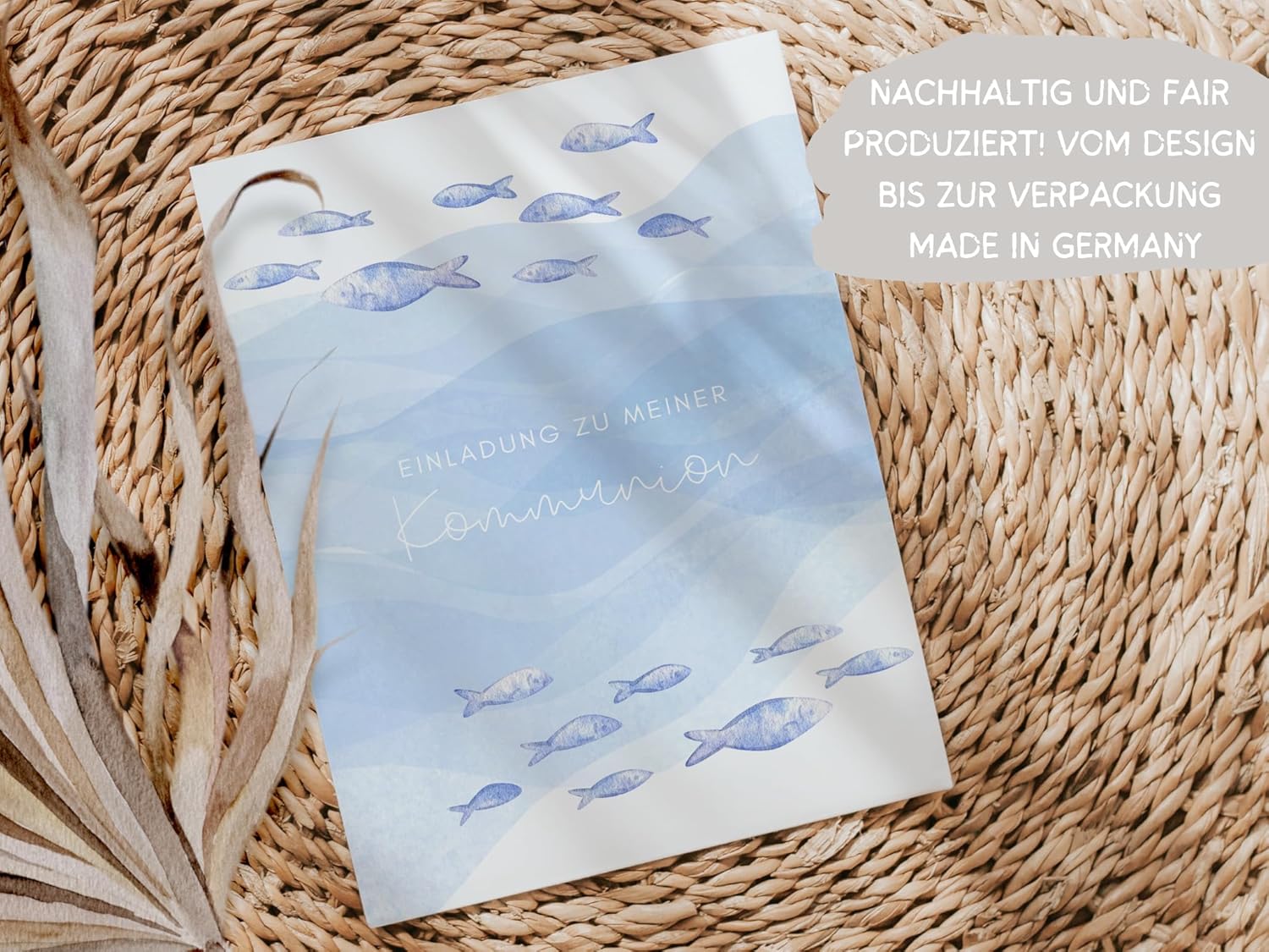 INVITO COMUNIONE: i nostri biglietti di invito sono stati progettati con grande attenzione ai dettagli per la festa della comunione del tuo bambino. Il moderno motivo a pesce in stile minimalista ad acquerello conferisce alle cartoline un tocco fresco ma senza tempo, che si adatta perfettamente all'atmosfera della comunione del tuo bambino e attirerà sicuramente tutti gli sguardi su di sé FACILE E VELOCE: il retro dei nostri biglietti di invito offre spazio sufficiente per tutti i dettagli importanti per la festa della comunione. Basta inserire luogo, data, ora e altre informazioni – e i tuoi inviti sono pronti per essere distribuiti! DESIGN SPECIALE: il motivo pesce in delicate tonalità di blu è stato progettato con attenzione ai dettagli. Come piccola start-up per famiglie, diamo particolare importanza al design moderno e ai prodotti pratici che facilitano la vita delle famiglie. Alta qualità: ci affidiamo alla qualità di prima classe. I nostri biglietti d'invito sono realizzati in robusto cartone cromato (260 g/m²) con una superficie opaca che si può scrivere perfettamente. Le buste abbinate in carta kraft di alta qualità completano l'elegante pacchetto complessivo. MADE IN GERMANY: i nostri prodotti sono realizzati in Germania con la massima cura e sostenibilità, dalla progettazione all'imballaggio. Affidati alla qualità e supporta la produzione locale.