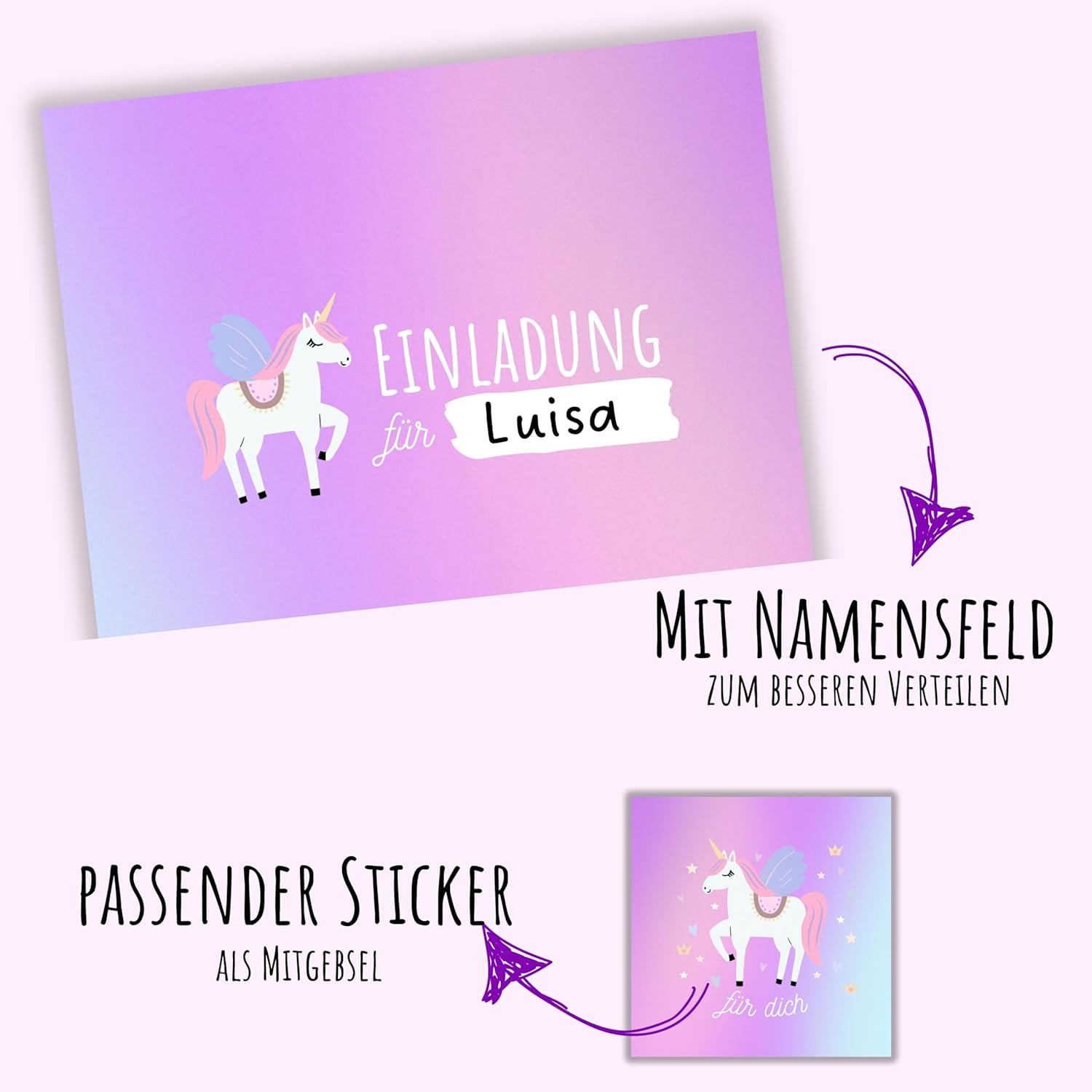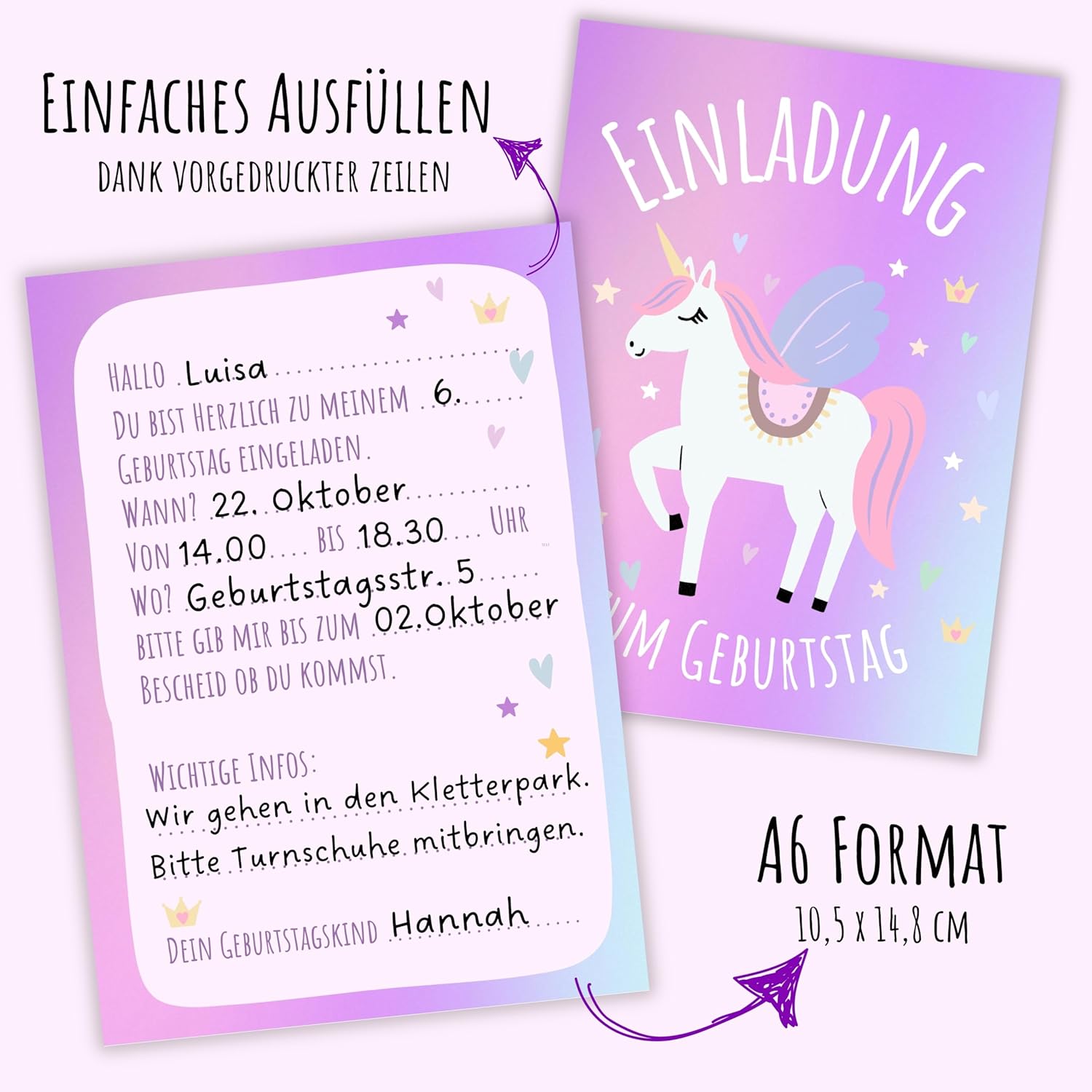 10 meravigliosi set di unicorni: 10 biglietti di invito, 10 buste abbinate, 10 sacchetti regalo, 10 adesivi per regalini, 10 adesivi per la chiusura Confezione completa: ordinare biglietti di invito e ricevere direttamente i sacchetti regalo abbinati. Preparare il compleanno non è mai stato così facile. Tutto per il compleanno dei bambini: per ragazze o ragazzi, i nostri biglietti d'invito con unicorno soddisfano tutti i gusti Biglietti d'invito: facili da compilare grazie al retro prestampato. In pochi minuti sono già riempiti. Stampato in Germania: produciamo e progettiamo tutti i biglietti in modo equo in Germania.