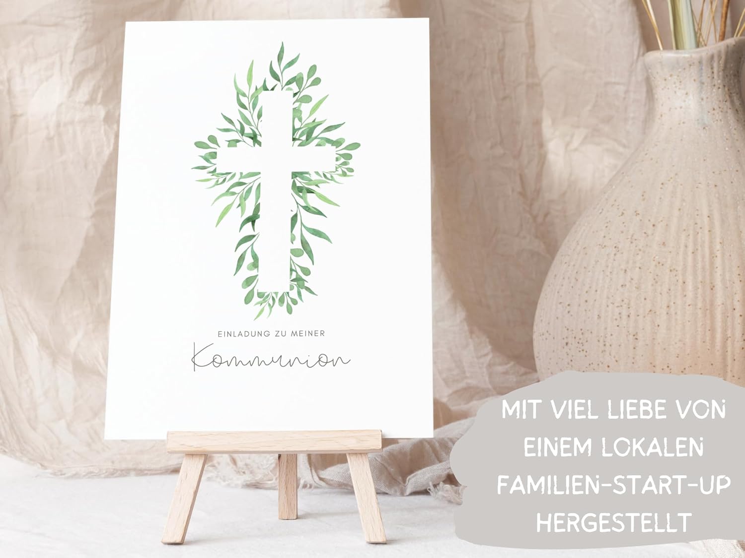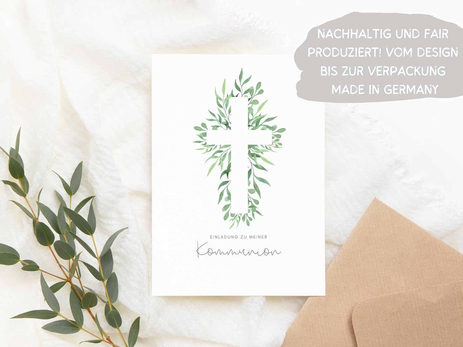 INVITO COMUNIONE: i nostri moderni biglietti d'invito in eucalipto sono stati progettati con grande attenzione ai dettagli per la festa della Comunione. Il motivo floreale a croce in eucalipto conferisce alle cartoline un tocco moderno e allo stesso tempo senza tempo, perfetto per l'atmosfera della prima La Santa Comunione del tuo bambino si adatta ed è una vera attrazione! FACILE & VELOCE: il retro dei biglietti d'invito offre spazio sufficiente per tutte le informazioni importanti per celebrare la prima comunione: luogo, data, ora e dettagli aggiuntivi possono essere aggiunti senza sforzo. Basta compilare, distribuire e siete pronti! Design speciale: il motivo floreale a croce con eucalipto alla moda è stato progettato con amore per i dettagli. Come piccola start-up per famiglie, diamo particolare importanza al design moderno e ai prodotti pratici che facilitano la vita a te e alla tua famiglia. Alta qualità: ci affidiamo alla qualità di prima classe. I biglietti sono realizzati in robusto cartone cromato (260 g/m²) con una superficie opaca che si può scrivere in modo eccellente. Le buste abbinate in carta kraft, realizzate in carta riciclata completano il pacchetto sostenibile. MADE IN GERMANY: i nostri prodotti sono realizzati in Germania con la massima cura e sostenibilità, dalla progettazione all'imballaggio. Affidati alla qualità e supporta la produzione locale.