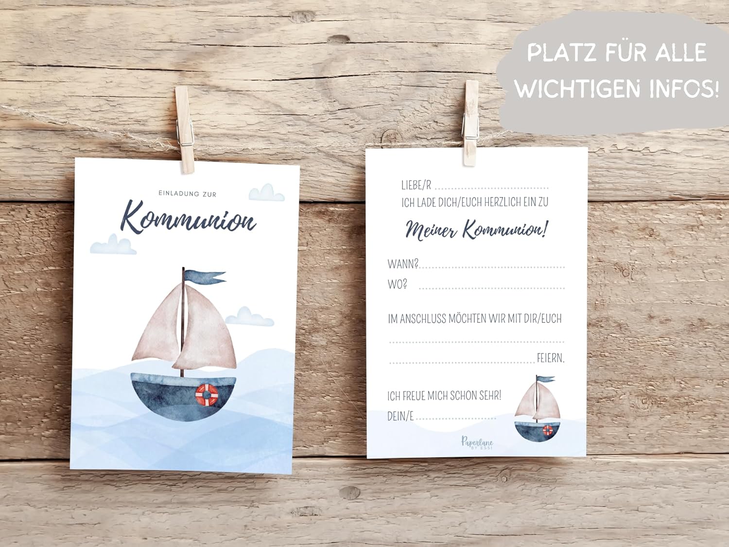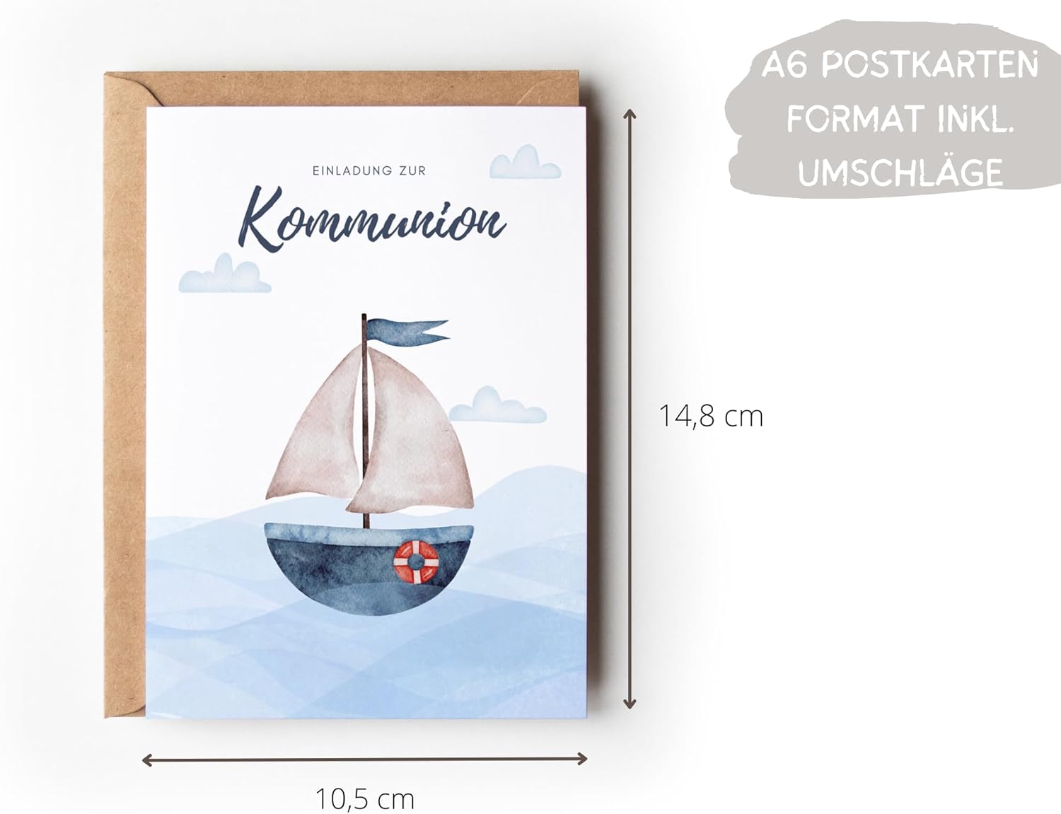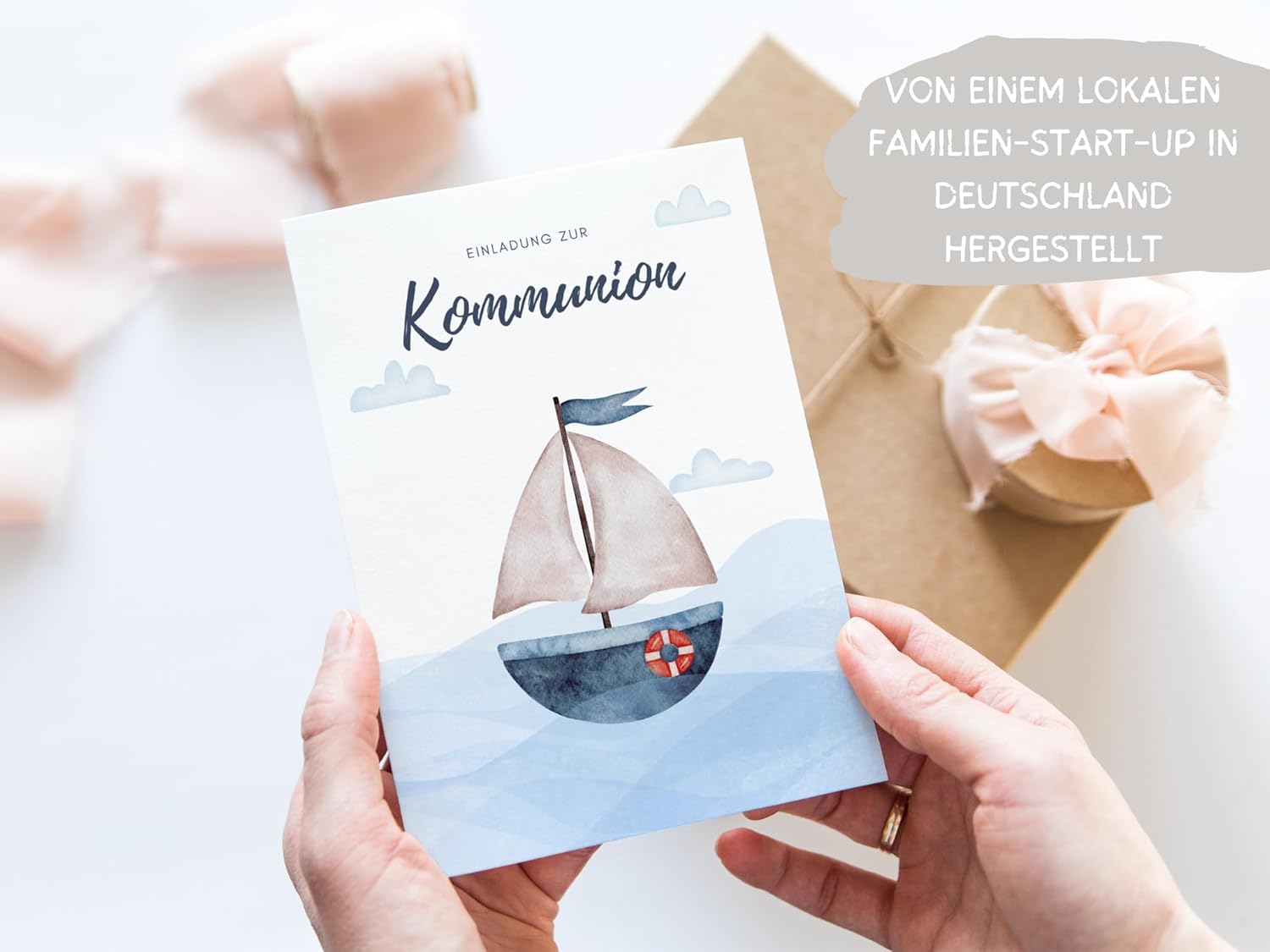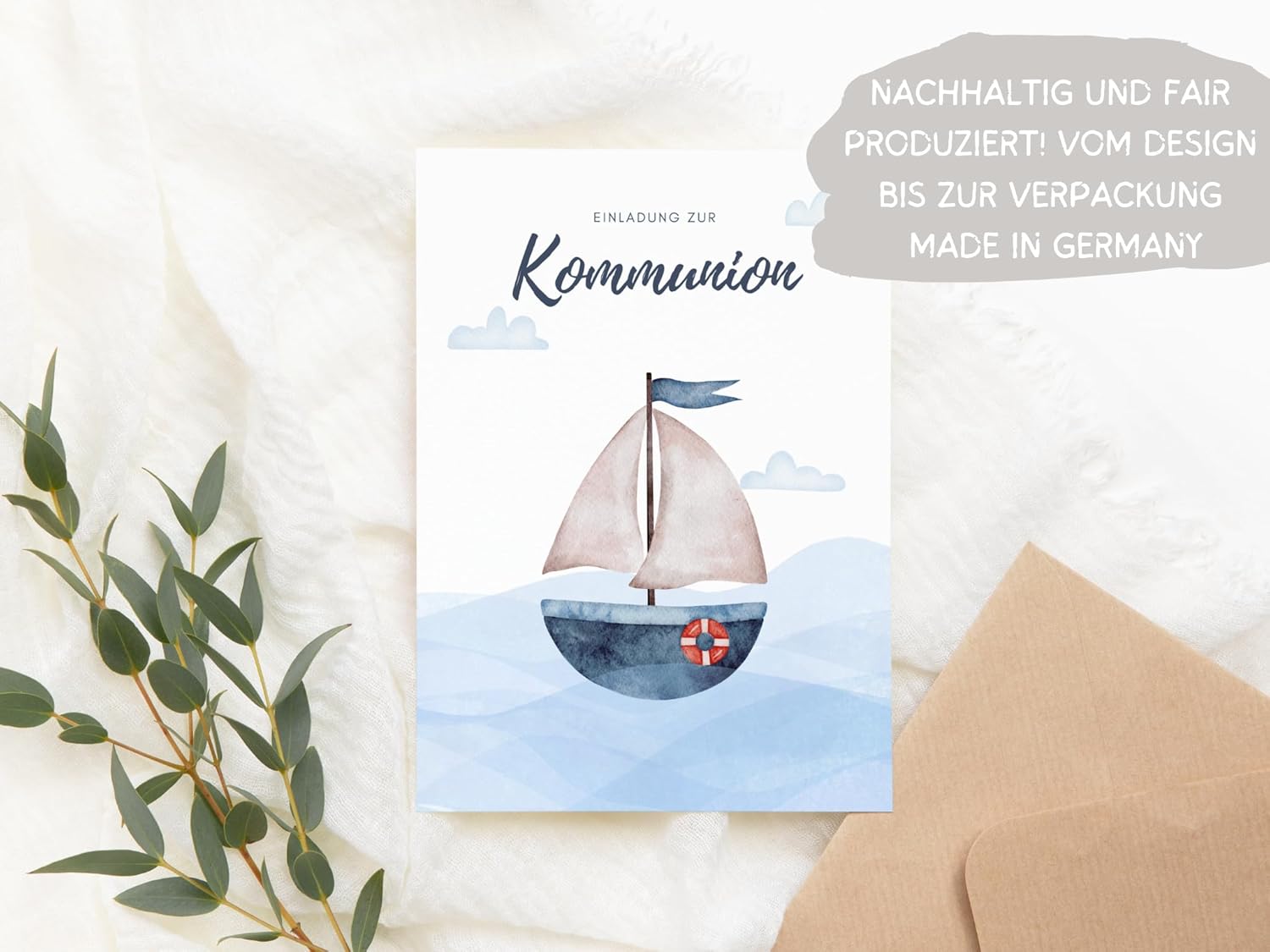 INVITO COMUNIONE: i nostri biglietti d'invito sono stati progettati con grande attenzione ai dettagli per la festa della Comunione. Con un adorabile motivo barca a vela marittima in moderno design ad acquerello, sono perfetti per la prima Adatto per la Santa Comunione del vostro bambino e una vera attrazione! FACILE & VELOCE: il retro dei biglietti d'invito offre spazio sufficiente per tutte le informazioni importanti sulla celebrazione della Prima Comunione: luogo, data, ora e dettagli aggiuntivi possono essere facilmente aggiunti. Basta compilare, distribuire e siete pronti! Design speciale: il motivo barca a vela è stato progettato con attenzione ai dettagli. Come piccola start-up per famiglie, diamo particolare importanza ai design moderni e ai prodotti pratici che facilitano la vita a te e alla tua famiglia. Alta qualità: attribuiamo valore alla qualità di prima classe. I biglietti sono realizzati in robusto cartone cromato (260 g/m²) con una superficie opaca, perfetto per scrivere. Le buste abbinate in carta kraft, realizzate in carta riciclata completano il pacchetto sostenibile. MADE IN GERMANY: i nostri prodotti sono realizzati in Germania con la massima cura e sostenibilità, dalla progettazione all'imballaggio. Affidati alla qualità e supporta la produzione locale.