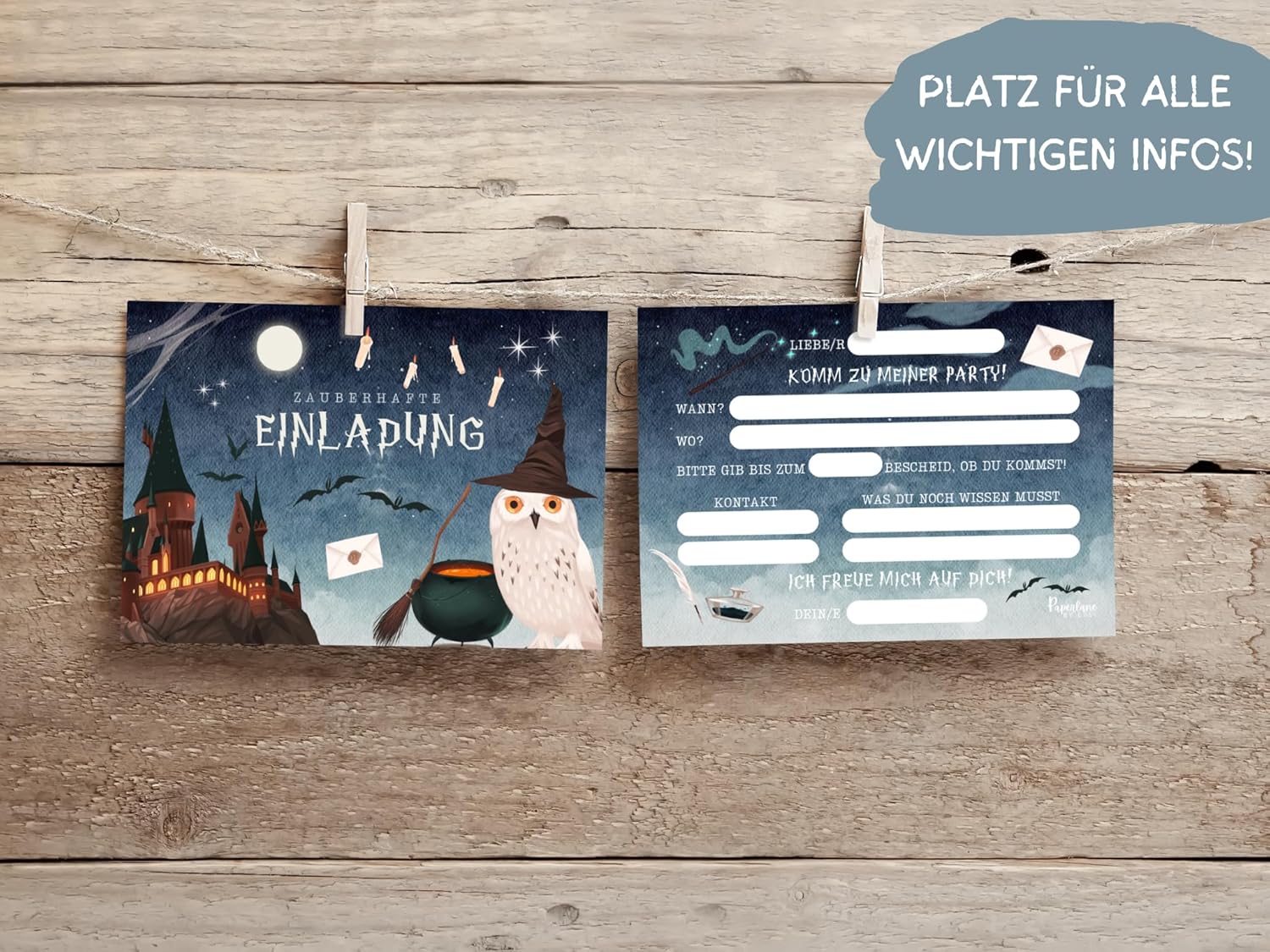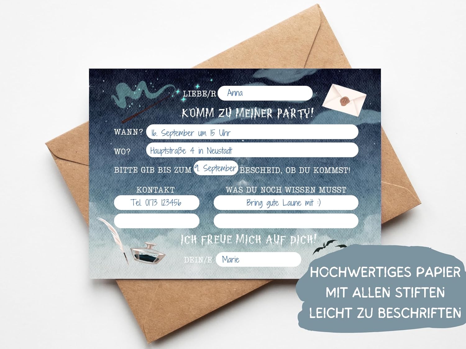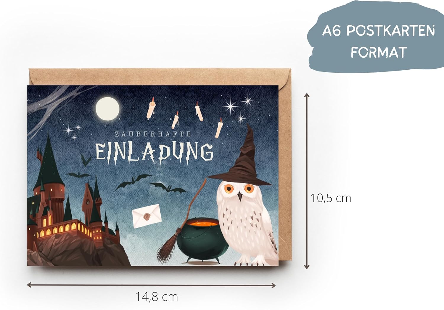 Invito compleanno per bambini scuola magica: lasciate che il prossimo compleanno del vostro bambino diventi magico con i nostri biglietti di invito per il compleanno dei bambini con motivo studente magico! Il set contiene 10 biglietti di invito di alta qualità in formato cartolina DIN A6 (14,8 x 10,5 cm). Sulla parte anteriore si trova un'impressionante scuola di magia e un gufo disegnato in stile acquerello ricco di dettagli, perfetto per un compleanno indimenticabile apprendista magica. Che si tratti di bambini o ragazze, questi biglietti di invito sono ideali per tutti i piccoli maghi e streghe che vogliono festeggiare il loro 8°, 9° o 10° compleanno. Facile e veloce: sul retro trovi spazio sufficiente per tutte le informazioni importanti sulla festa di compleanno: luogo, data, ora e altre informazioni come auguri regalo o possibilità di contatto. Questi biglietti di invito per il compleanno dei bambini sono compilati e distribuiti in un batter d'occhio: non dovrai fare lunghe creazioni fai da te. Perfetto per una festa al cinema, una festa a tema o un compleanno a scuola magica. Alta qualità: realizzati in robusto cartone cromato (260 g/m²), i biglietti di invito offrono una superficie ideale per scrivere, indipendentemente dalla penna. Le buste in carta kraft riciclata ecologiche completano il set e garantiscono una soluzione sostenibile. Ideale per i genitori che prestano attenzione sia allo stile che alla qualità. Prodotto in Germania: i nostri inviti di compleanno sono progettati e realizzati in Germania con la massima cura e grande attenzione ai dettagli. Come piccola start-up per famiglie, diamo particolare importanza ai prodotti di alta qualità e sostenibili. Affidati alla qualità e rendi il compleanno del tuo bambino un'esperienza indimenticabile con i nostri biglietti di invito.