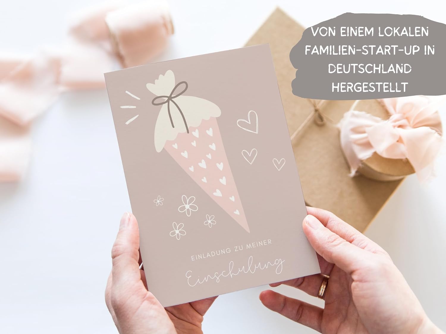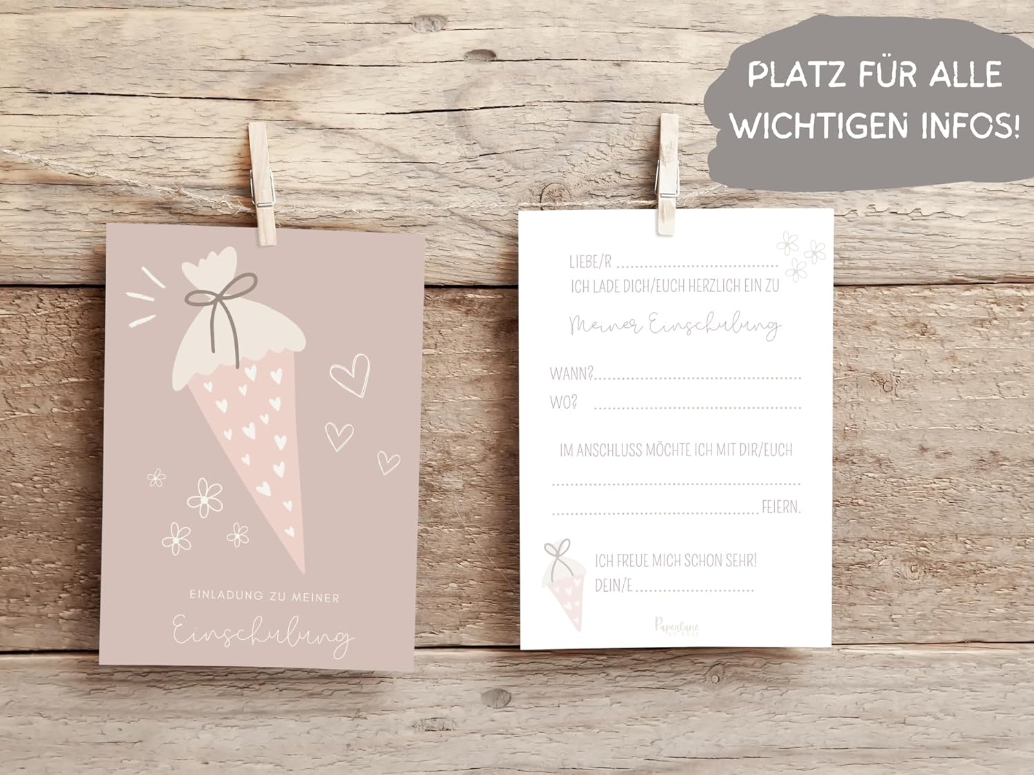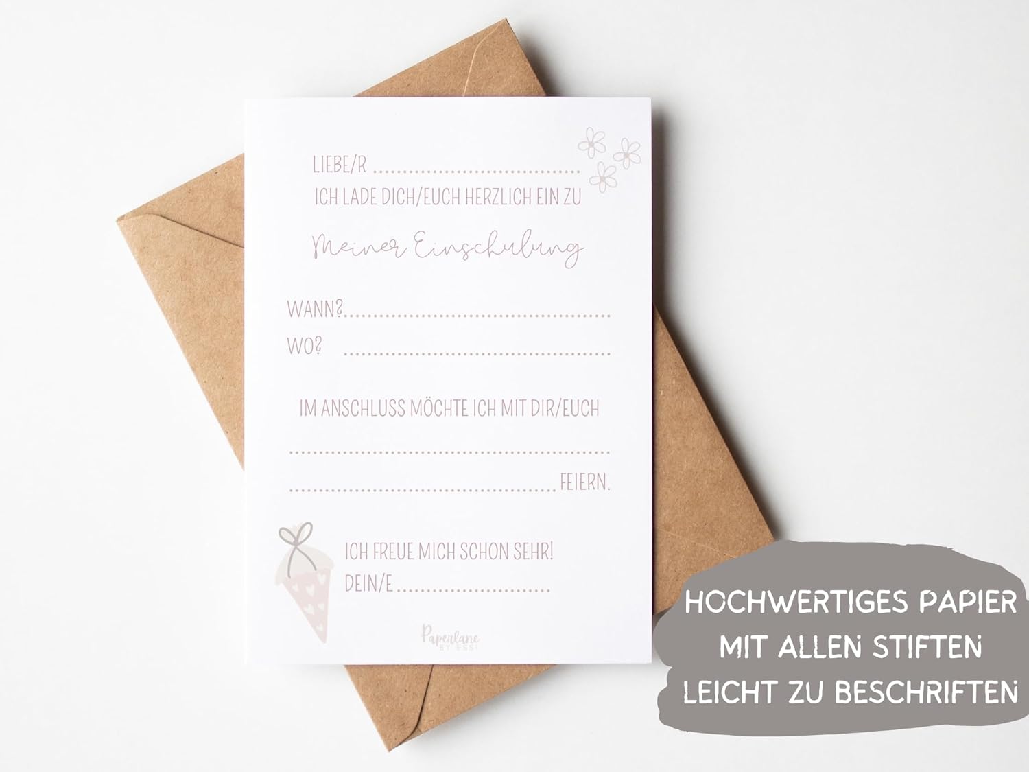 Invito per le ragazze: prepara l'inizio della scuola di tua figlia in un modo speciale con il nostro set di 10 biglietti d'invito per l'inizio della scuola con buste abbinate. L'incantevole motivo di un cono per la scuola rosa con cuori in delicate tonalità pastello è ideale per le bambine che vogliono festeggiare il loro primo giorno di scuola. Facile e veloce: il retro dei nostri biglietti di invito in formato DIN A6 (14,8 x 10,5 cm) offre spazio sufficiente per tutte le informazioni importanti sull'iscrizione a scuola, come data, ora, luogo, nonché ulteriori dettagli come i dettagli di contatto e la successiva festa di scuola. Basta compilare, distribuire e aumentare l'anticipazione del primo giorno di scuola! Le robuste buste in carta kraft si adattano perfettamente al design dei biglietti e garantiscono una spedizione elegante. Design speciale: con l'adorabile motivo di un cono rosa e cuori in delicati toni pastello, i nostri inviti sono una vera attrazione. Ideale per le bambine che vogliono festeggiare l'inizio della scuola. Il design conferisce ai biglietti un tocco speciale e li rende un compagno affascinante per il primo giorno di scuola. Alta qualità: i nostri biglietti d'invito sono stampati su robusto cartone cromato (260 g/m²), facile da scrivere e offre una qualità di prima classe. Le buste abbinate sono realizzate in carta riciclata e rispettano l'ambiente. Attribuiamo grande importanza alla qualità e alla sostenibilità e produciamo il nostro set completamente in Germania. Prodotto in Germania: come piccola start-up per famiglie dalla bella Renania, siamo orgogliosi di produrre i nostri prodotti in Germania con amore e cura. I nostri biglietti d'invito sono quindi realizzati con la massima qualità e cura, in modo che la vostra festa di iscrizione sia un successo assoluto!