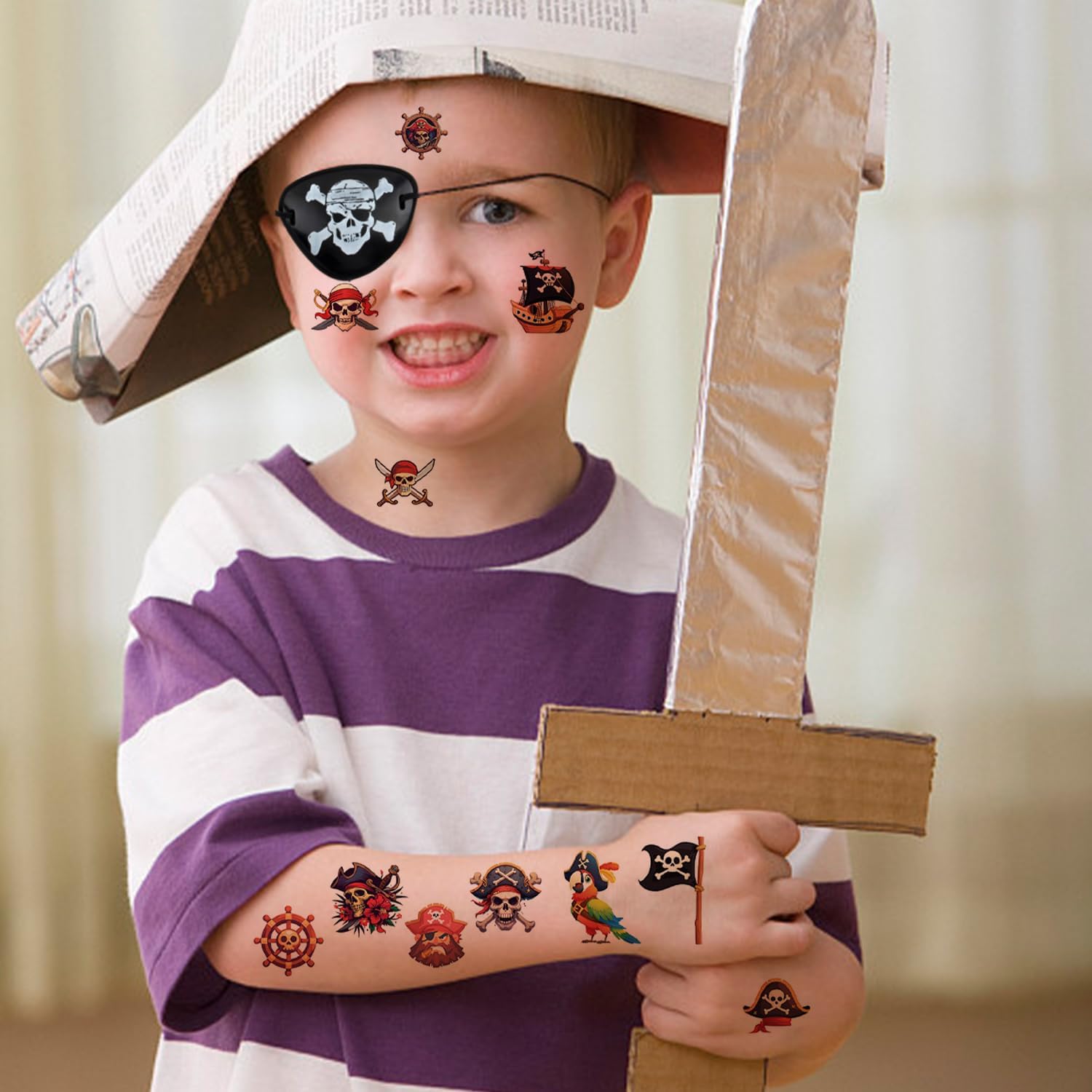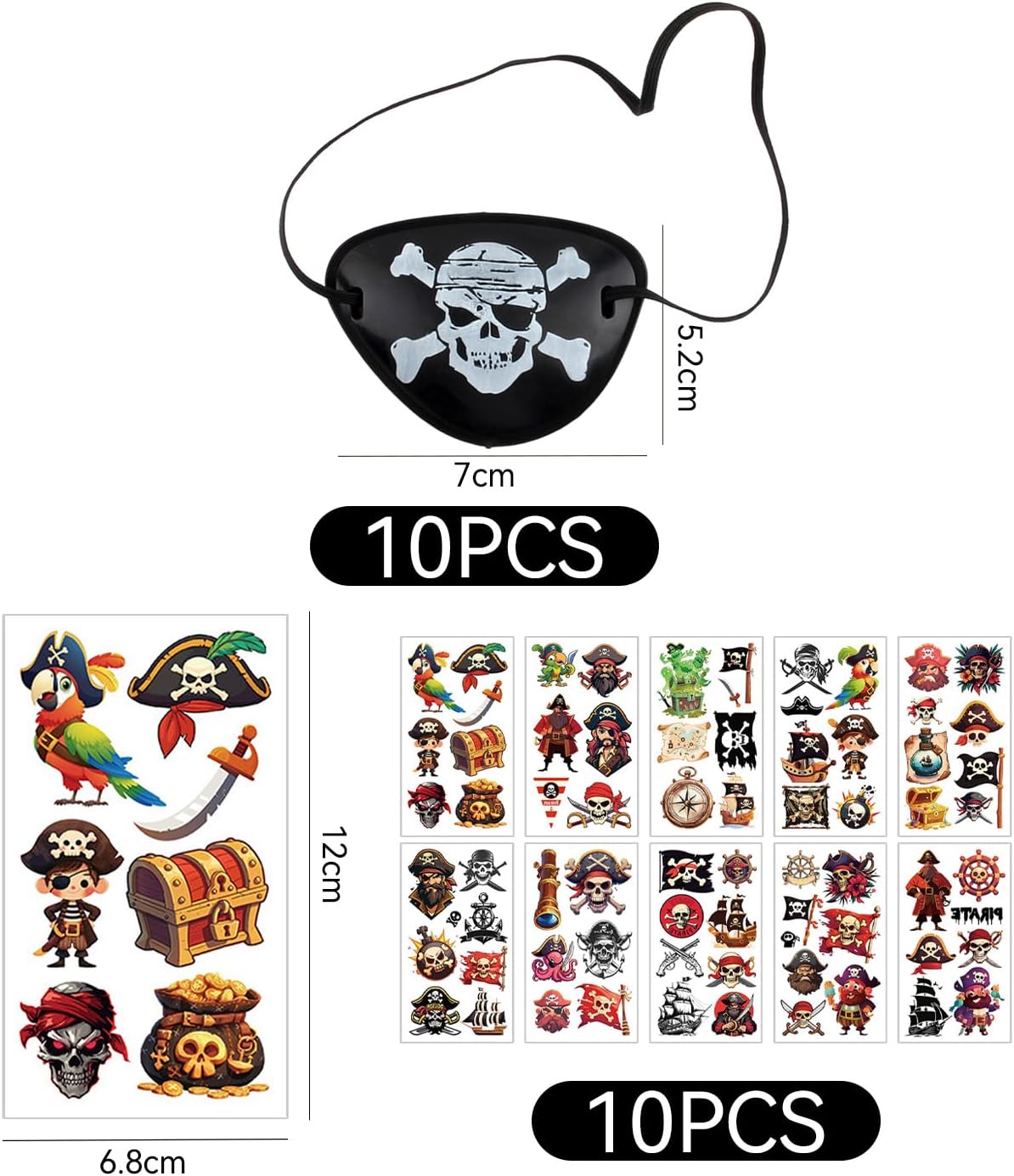 [Contenuto del prodotto] Riceverai 10 maschere per gli occhi da pirata e 10 adesivi da pirata. La dimensione della maschera per gli occhi da pirata è 7 * 5,2 cm e il colore è nero; La dimensione dell'adesivo pirata è 12*6,8 cm e il colore è multicolore, adatto per feste a tema e giochi di ruolo. [Materiale del prodotto] Le maschere per gli occhi dei pirati sono realizzate in plastica, leggere e resistenti; Gli adesivi pirata sono realizzati con adesivi per tatuaggi, sicuri e innocui, facili da usare e da pulire e adatti a tutte le tonalità della pelle e ai temi delle feste. [Design creativo] Questo prodotto ha un design unico. La maschera per gli occhi da pirata adotta il classico motivo a teschio e il design con un occhio solo, permettendoti di trasformarti istantaneamente in un pirata; Il design dell'adesivo pirata è vario, con vari modelli di elementi pirata per aumentare il divertimento della festa e il realismo del gioco di ruolo. [Facile da usare] Questo prodotto è facile da usare, basta indossare la maschera per gli occhi da pirata, adatta a utenti di età diverse; L'Adesivo Pirata è semplice da usare, basta strappare la pellicola protettiva, attaccarlo sul braccio o su altre parti e premerlo delicatamente. Può essere facilmente pulito dopo l'uso. [Ampiamente usato] Questo prodotto è molto adatto per feste a tema pirata, eventi di Halloween, giochi di ruolo, feste di compleanno per bambini e altre occasioni. Non solo può essere utilizzato come decorazione, ma anche come valido aiuto per giochi da tavolo e interazione.