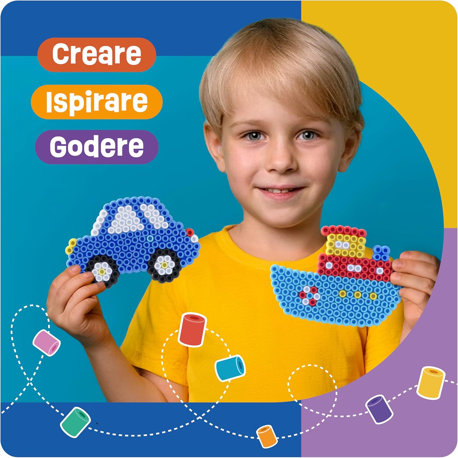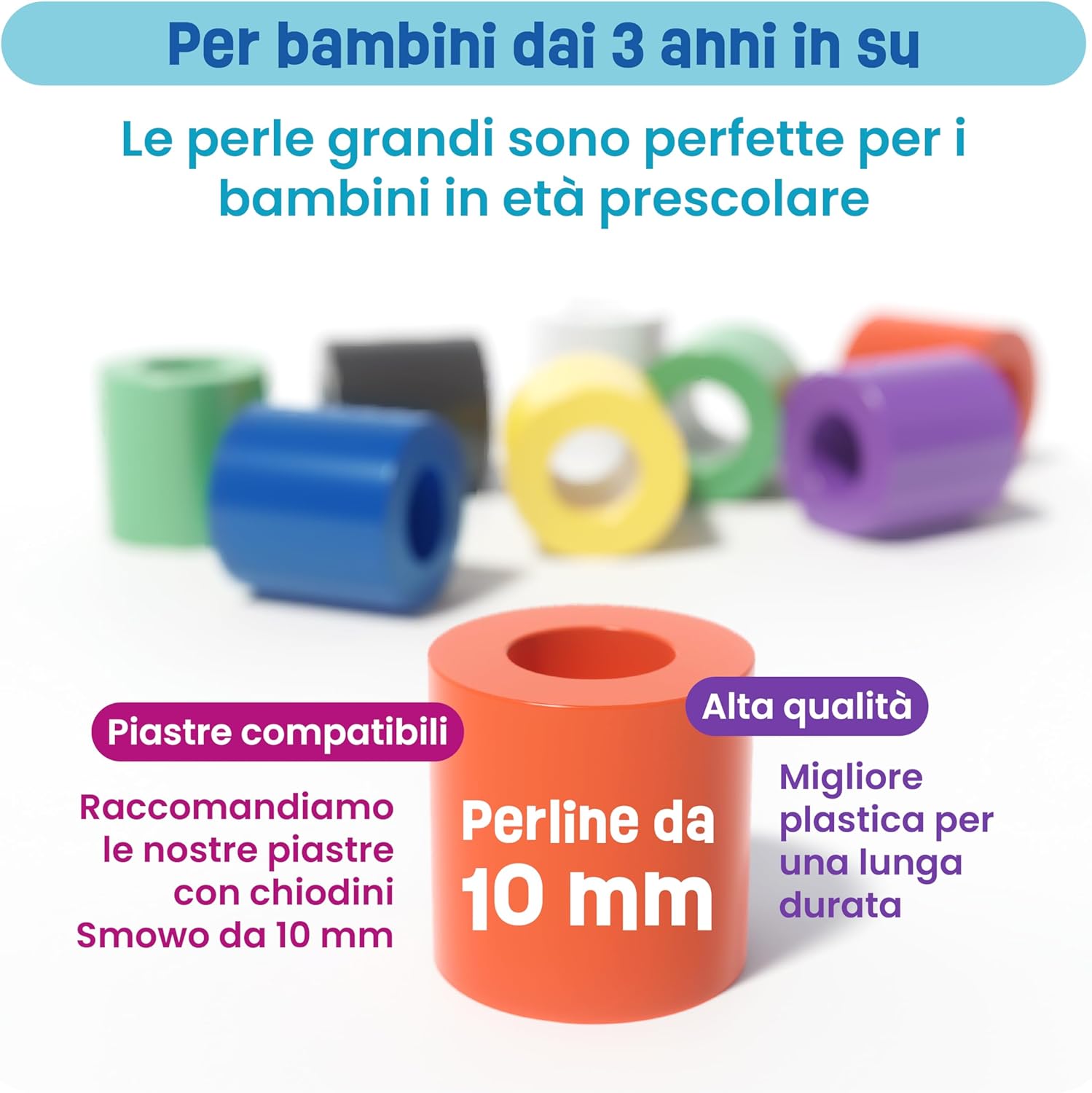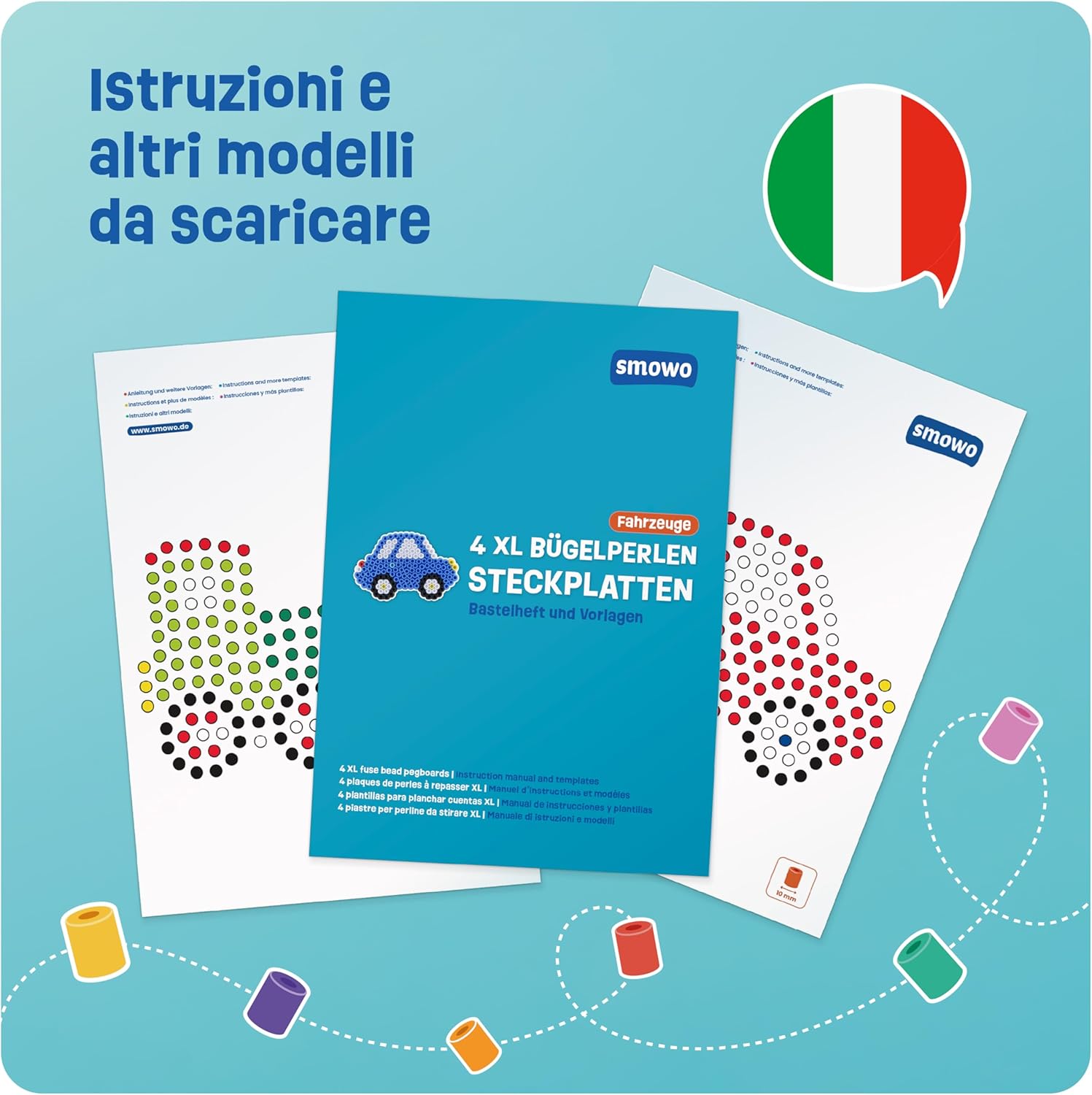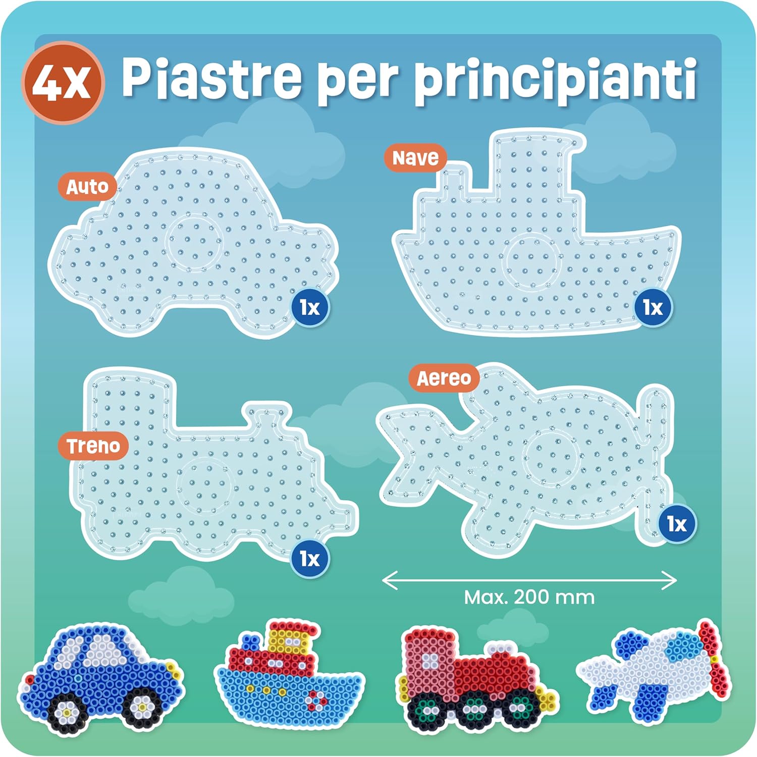 Facile da usare: nel set sono incluse 4 piastre XL adatte per perline maxi da 10 mm. Include fantastici modelli di motivi. Ideale per bambini piccoli per sviluppare le capacità motorie e i primi progetti di bricolage Il nostro set di piatti comprende diverse forme come auto, nave, treno e aereo. Stimola la creatività dei vostri bambini creando i disegni e i modelli preferiti. Il giocattolo educativo ideale per i primi progetti artistici creativi Istruzioni e motivi con motivi colorati e creativi sono inclusi nel set: i modelli di perline possono essere posizionati sotto gli stencil trasparenti e dotati di maxi perline Il set di perline da stirare è perfetto come regalo per feste di compleanno per bambini, Pasqua, Natale o in vacanza. Non importa se per ragazze o ragazzi, i vostri bambini lo adoreranno. È ideale per lavorare insieme con perline da stiro Le assi di perline da stirare si combinano perfettamente con le nostre perline da 10 mm. Anche le perline di queste dimensioni sono compatibili e possono essere utilizzate come set fai da te