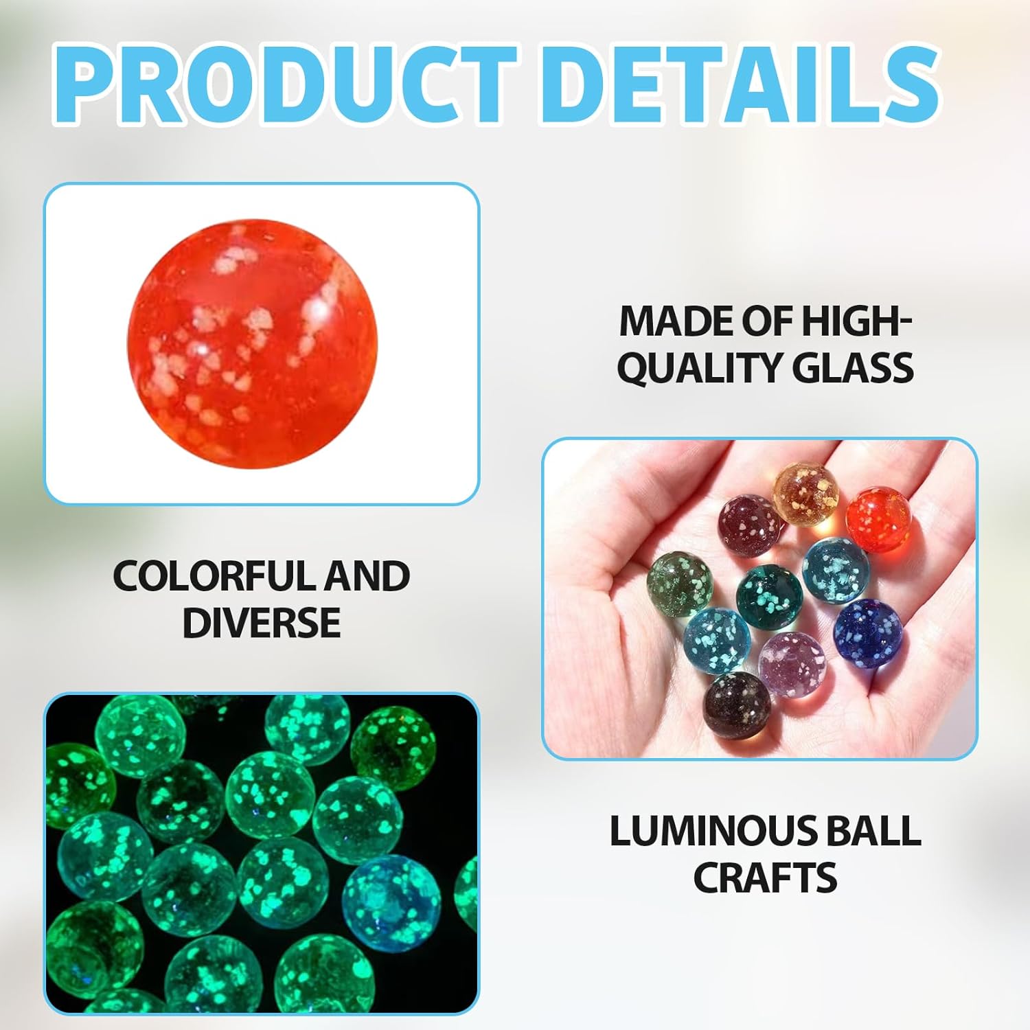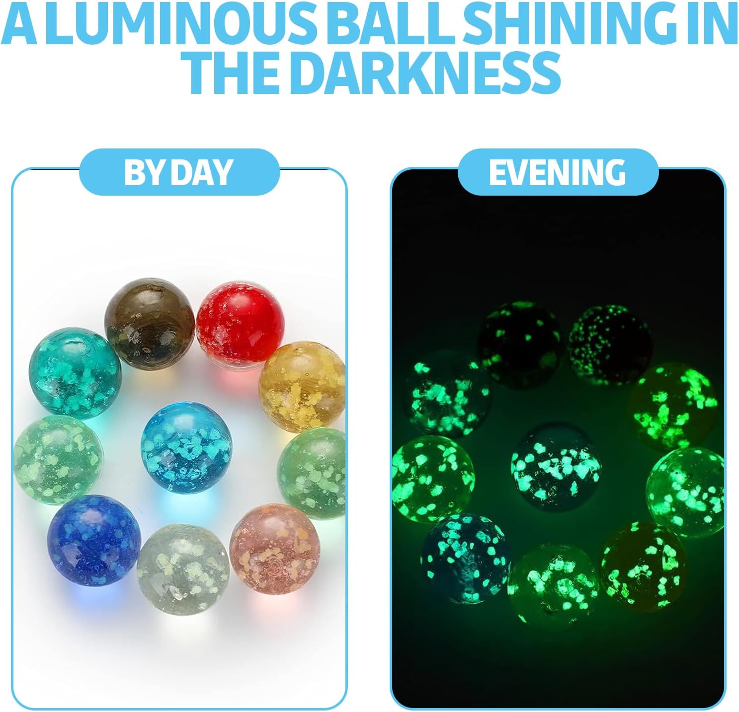 【Artigianato di qualità】:Tutti biglie sono realizzati in vetro nuovissimo di alta qualità,accuratamente lucidato,sono tutti design artigianali lisci e arrotondati di alta qualità,con texture colorate,robusti e durevoli,lisci e lucenti,nessuna crepa o briciola,lavorazione arrotondata,confortevole al tatto e riutilizzabile. 【Giocare Design】:Il nostro biglie è perfetto per diversi giochi di flipper,come i tradizionali giochi da tavolo con clown e flipper,i giochi da tavolo di dama cinese,ecc.È un giocattolo per interni ed esterni con cui i bambini possono giocare ovunque,rotolare,lanciare,lanciare o colpire le biglie con i tuoi amici e funge anche da bellissima decorazione domestica. 【Metodo Emissione di luce】:Questo materiale deve prima assorbire la luce solare e avrà un buon effetto visivo di notte.Puoi metterli biglie spiaggia al sole,oppure puoi irradiarli con raggi ultravioletti per far sì che biglie di vetro emetta luce più brillante.Emetterà luce al buio per circa 1-3 minuti leggero. 【Colori Ricchi】:la confezione regalo contiene un totale di 10 pezzi biglie di vetro,che coprono 10 adorabili colori,tra cui rosso,trasparente,verde,turchese,viola,azzurro cielo,blu,giallo,nero,Viola chiaro,viene fornito con 1 di ogni colore.Questi biglie vetro sono sufficienti per giocare con i tuoi amici. 【Occasioni di Applicazione】:Il nostro biglie vetro può essere utilizzato in una varietà di occasioni,come giochi tradizionali per bambini,attività genitore-figlio o come regali per feste o oggetti di scena in feste di compleanno,feste a tema,asili e attività scolastiche Puoi anche utilizzare le proprietà luminose dei marmi luminosi per decorare scene e creare fotografie.