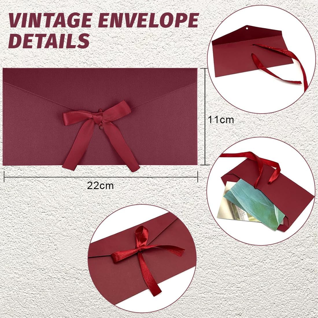 Dimensioni busta: 22 x 11 cm, la confezione include 10 buste, colori vintage, adatte per molte occasioni. Design del nastro: la busta contiene un design a nastro, invece di utilizzare colla o nastro adesivo, più bella e comoda, non c'è bisogno di preoccuparsi dei danni della busta durante l'invio, è sicuro per consegnare ogni pezzo di mente. Materiale di alta qualità: le buste regalo sono realizzate in carta kraft di alta qualità, lisce e di alta qualità, piacevoli al tatto, forti e durevoli, resistenti agli strappi. La busta non si rompe facilmente, oltre all'ampia decorazione del nastro, è bella e ha un senso di cerimonia allo stesso tempo. Ampie applicazioni: ideale per biglietti regalo personalizzati, buste del Ringraziamento, inviti per feste, biglietti di auguri, biglietti di Natale, biglietti da visita, e può anche contenere gadget come catene di gioielli, perline, ciondoli, foto, forcine, graffette, monete e altro ancora. Adatto per la maggior parte delle occasioni: le buste regalo sono adatte per cerimonie di apertura, benessere dei dipendenti, celebrazioni di anniversario, cerimonia di premiazione, promozione pubblicitaria e così via.