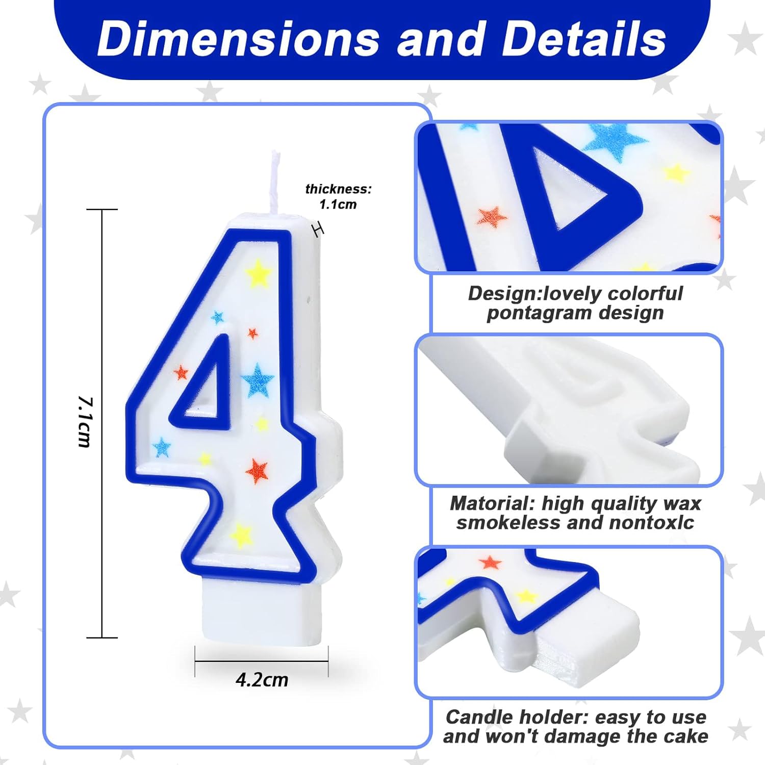 DECORAZIONI COLORATE CON STELLE: Queste candele numeriche sono decorate con stelle colorate e circondate da un bordo blu. Appaiono adorabili e affascinanti e si abbinano a qualsiasi decorazione di torte o cupcake. Aggiungono un'atmosfera dolce e festosa a qualsiasi celebrazione MATERIALE DI ALTA QUALITÀ: Le candele per torte sono fatte di cera di qualità e hanno colori vivaci che non sbiadiscono. Sono leggere e portatili, facili da accendere e inserire. Bruciano in modo uniforme e durano a lungo. Si prega di conservare le candele lontano dal fuoco e di tenerle fuori dalla portata dei bambini mentre sono accese USO VERSATILE: Con i numeri da 0 a 9 puoi creare quasi ogni combinazione d'età. Sono ideali per compleanni, matrimoni, riunioni familiari, anniversari, feste a tema, baby shower, feste di addio e altro. Creano un'atmosfera calda e momenti memorabili MISURA UNIVERSALE: Ogni candela di compleanno è lunga circa 7,2 cm e spessa 1,1 cm e ha un supporto alla base. Sono facili da inserire nella torta e si adattano perfettamente all'uso CONTENUTO: Riceverete 10 pezzi di candele numeriche per compleanno da 0 a 9. Potete combinarle facilmente per celebrare ogni giorno speciale. Avete a disposizione un numero sufficiente di pezzi e una bella varietà per il vostro uso e ricambio