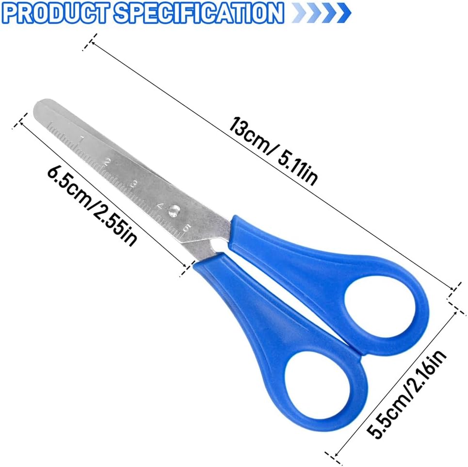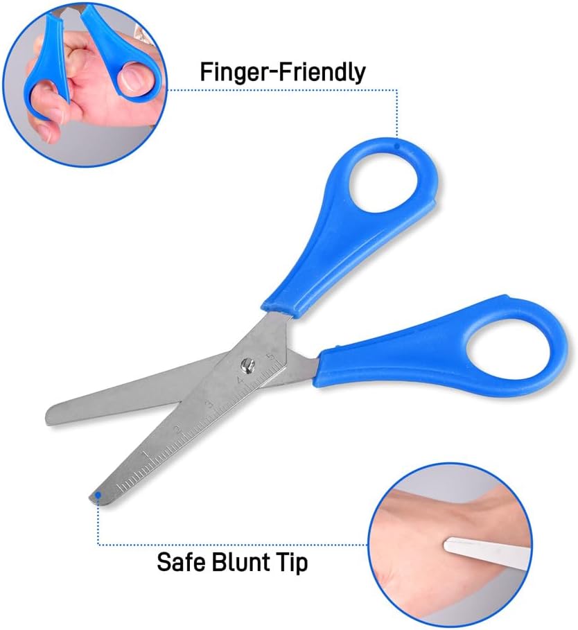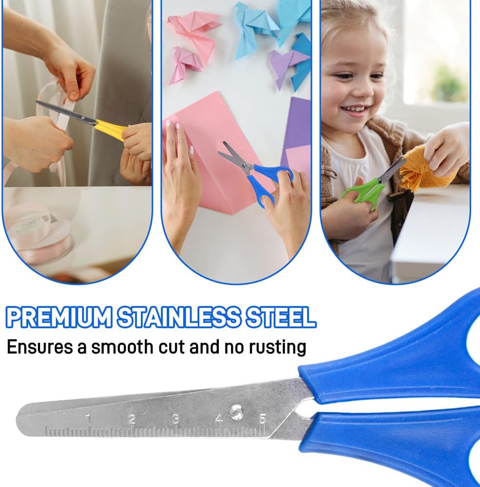 Design Intelligente: queste forbici punta arrotondata bambini presentano un design a doppio anello, appositamente progettato per adattarsi alle mani dei bambini, rendendole comode da tenere e facili da usare. può essere utilizzato sia dalla mano sinistra che da quella destra, offrendo il massimo comfort ai bambini Materiali di Alta Qualità: i manici delle forbici punta arrotondata sono realizzati in plastica di alta qualità, le lame sono realizzate in materiale in lega, non facile da arrugginire, leggero e le punte arrotondate garantiscono un taglio preciso e un utilizzo sicuro, particolarmente adatte per l'uso quotidiano da parte di bambini e studenti Uso Multifunzionale Forbici per Bambini: le forbici per bambini sono perfette per una varietà di lezioni di arte scolastica, classi prescolari, classi della scuola materna e progetti di artigianato fai-da-te. può anche essere ampiamente utilizzato nelle attività in classe per scrapbooking e feste artigianali per aiutare i bambini a esprimere la propria creatività Molteplici Opzioni di Colore: queste forbici bambini sono dotate di una scala centimetrica, che può aiutare i bambini a misurare la lunghezza di taglio quando realizzano lavori artigianali, e ci sono cinque colori vivaci tra cui scegliere, che non sono solo belli, ma soddisfano anche le preferenze cromatiche dei bambini e aumentano la divertimento nel tagliare la carta Facile da Trasportare: le forbici scuola hanno una struttura ragionevole, sono piccole e comode, si adattano alle dita e sono molto facili da riporre e trasportare. sono adatte ai bambini per completare lavori manuali, creare album artistici, album fotografici fai-da-te, ecc