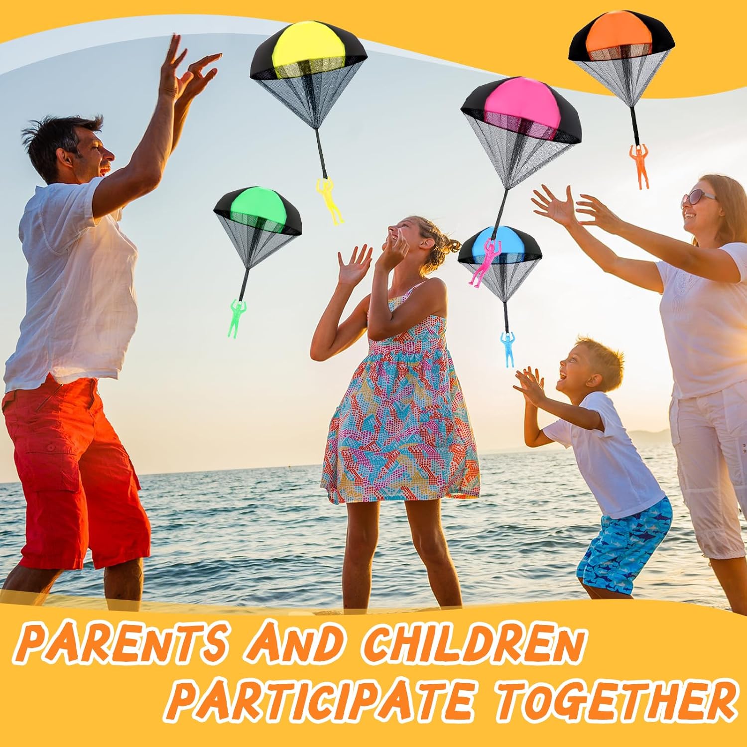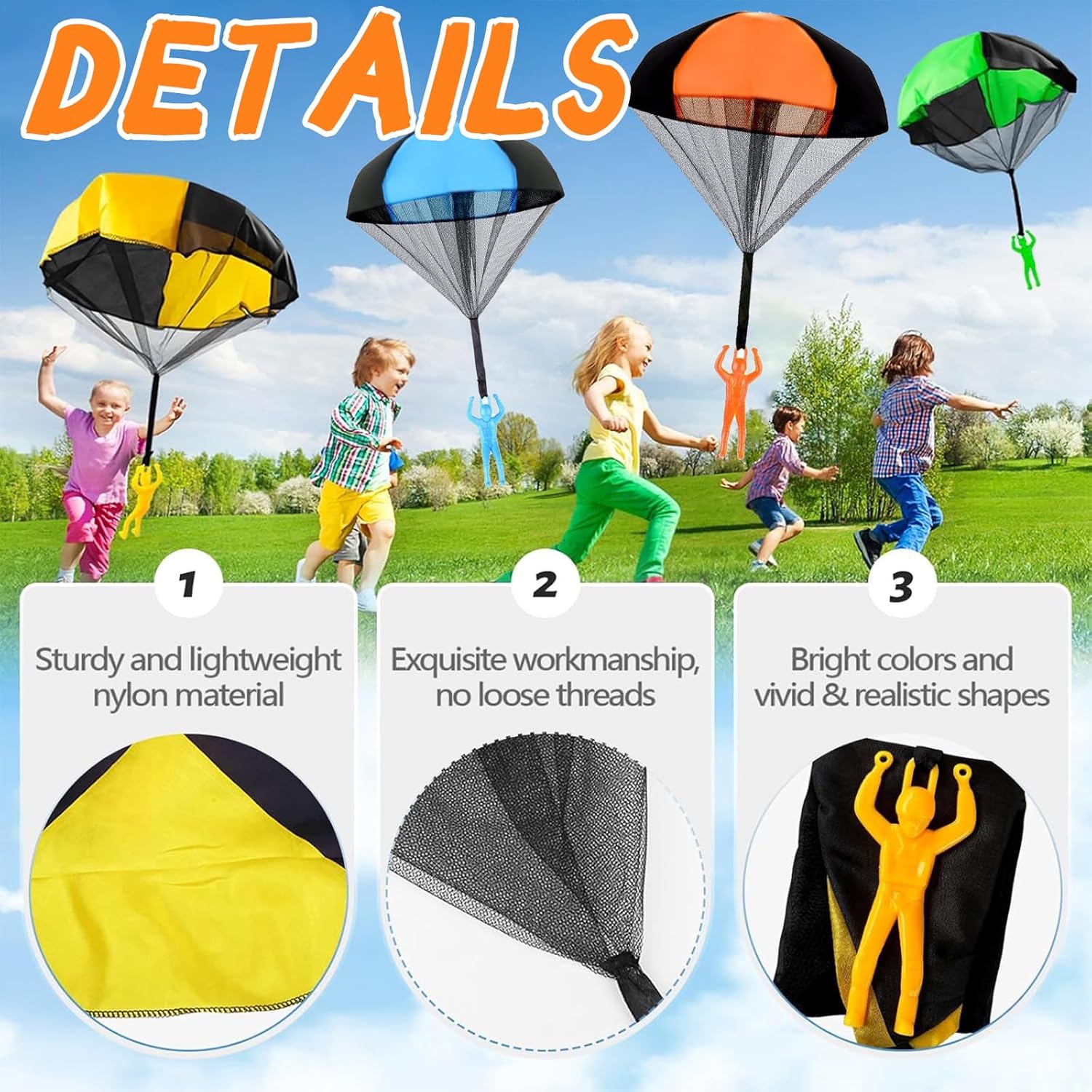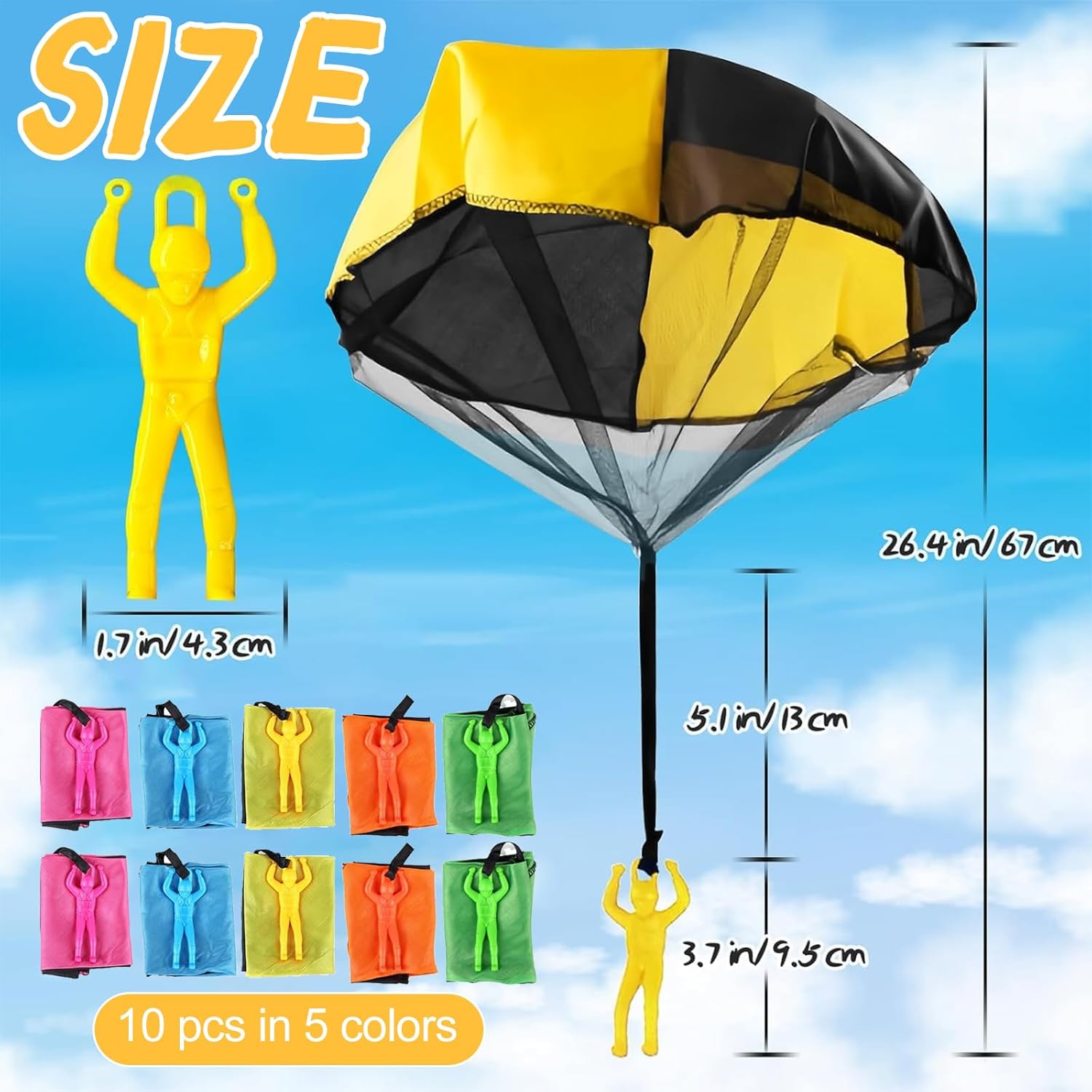 【Materiale Resistente e Sicuro】 Questo giocattoli per paracadute è realizzato in nylon e tulle di alta qualità, resistenti e durevoli, non facili da rompere e utilizzabili a lungo. Il paracadute del giocattoli per paracadute adotta un design leggero per ridurre la resistenza al vento, consentendo voli più alti e coinvolgenti e mostrando incredibili effetti di rallentamento quando viene lanciato in alto. 【Esperienza di Atterraggio Realistica】 Questo giocattoli per paracadute può simulare l'atterraggio di un vero paracadutista. Lancia giocattoli per paracadute in aria e il paracadute colorato si aprirà immediatamente e cadrà lentamente. Attraverso il gioco, i bambini percepiranno intuitivamente la gravità e la resistenza dell'aria, comprenderanno le nozioni di fisica e vivranno un'esperienza immersiva ed emozionante. 【Funzionamento Semplice e Pratico】 Il nostro giocattoli per paracadute non richiede un assemblaggio complicato e batterie, e puoi giocarci subito dopo averlo estratto. Basta lanciare giocattoli per paracadute in cielo e il bambino potrà iniziare facilmente. Durante il gioco, è possibile esercitare la coordinazione occhio-mano e le capacità motorie, in modo che i bambini possano stare lontani dagli schermi elettronici e godersi il tempo all'aria aperta. 【Ottimo Compagno All'aperto】 Il gioco all'aperto di giocattoli per paracadute incoraggia e aiuta a coltivare la creatività, le capacità cognitive e sociali dei bambini, lasciando ricordi felici e indimenticabili. I genitori possono anche promuovere l'interazione genitore-figlio attraverso giochi di presa e lancio di giocattoli per paracadute a più persone, coltivando al contempo le capacità manuali e atletiche dei bambini. 【Regalo Creativo e Ideale】Il nostro giocattoli per paracadute è adatto a vari scenari all'aperto come giardini, parchi, spiagge e può essere utilizzato anche in ampi spazi interni. Giocattoli per paracadute è leggero e facile da piegare, facile da trasportare ed è la scelta ideale per le riunioni di famiglia e le attività scolastiche, aggiungendo divertimento e sorprese infinite alla vita dei bambini.