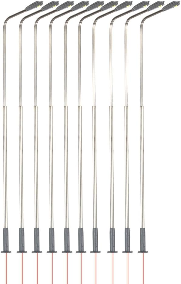 È per il fascia ferroviaria del modello. Con il lampione a LED del modello, puoi illuminare il layout del modello. Un ottimo set di avviamento del modello ferroviario e pali della lampada da 3 volt per gli appassionati e i costruttori ferroviari. Questi lampioni sono adatti per l'utilizzo di tensioni di alimentazione di 3V, è necessario un resistore in serie prima di usarli su 12V o 16 V. Ognuno ha una sola testa, completata con fili e lampadina. Materiale: acciaio