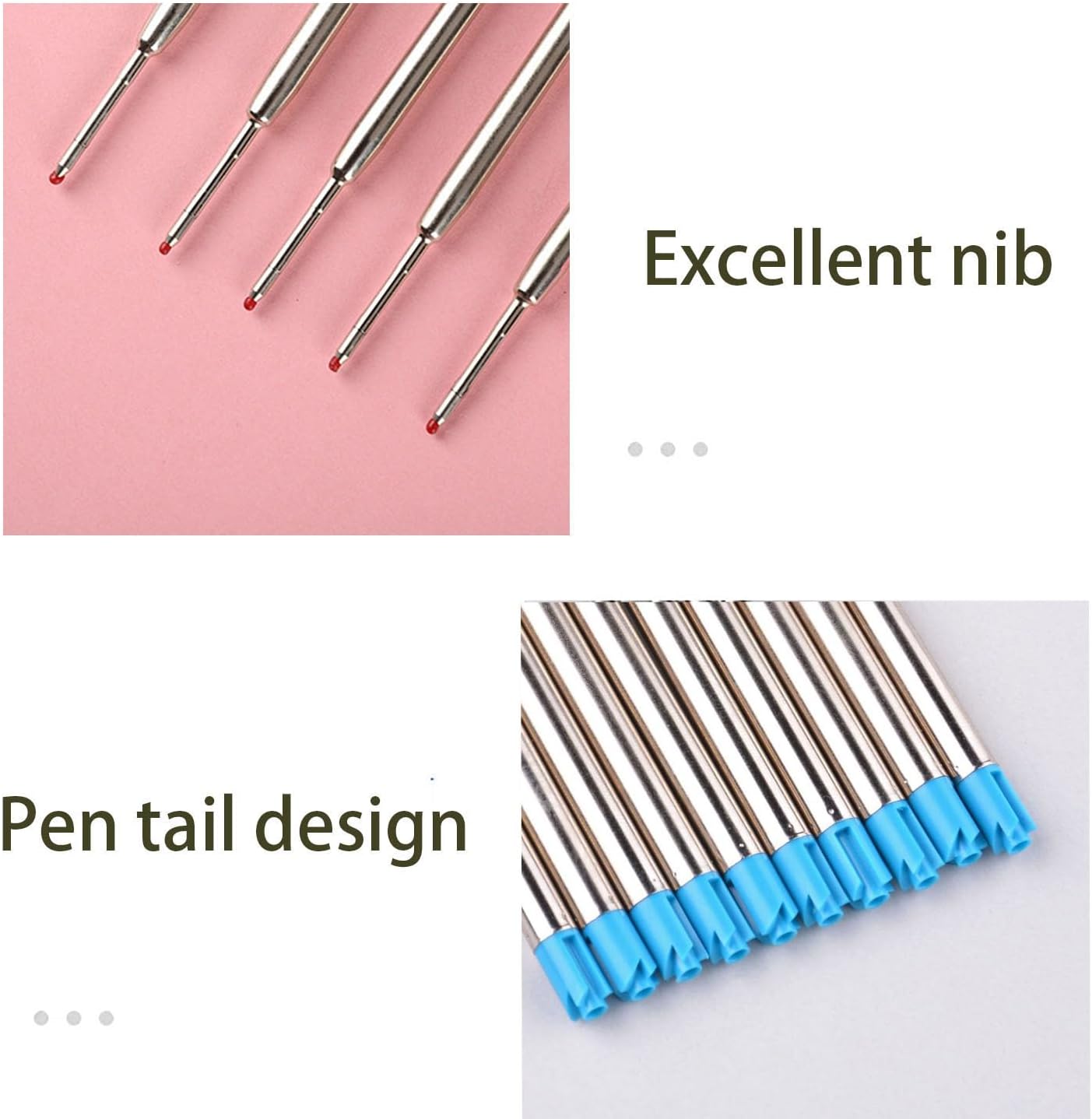 Cosa ottieni: Riceverai un set di 10 ricariche per penna a sfera blu di alta qualità. Dimensioni: La lunghezza totale è di 9,9 cm, le mine di alta qualità con punta da 1,0 mm garantiscono un flusso di inchiostro regolare e uniforme per un'esperienza di scrittura eccellente. Buona qualit: il corpo di ricarica è fatto di materiale del metallo, leggero e liscio; L'inchiostro si asciuga rapidamente con un flusso di inchiostro coerente, non sanguina attraverso. Ricariche di grande capacità: Ricarica in materiale metallico, previene perdite di inchiostro causate da pressione, urti e temperatura, resistente allo sbiadimento, flusso di inchiostro uniforme, non trapassa. Ricariche sostitutive: le ricariche sono adatte per ufficio, lavoro, scuola e casa, ecc. Piccolo e portatile, facile da trasportare.
