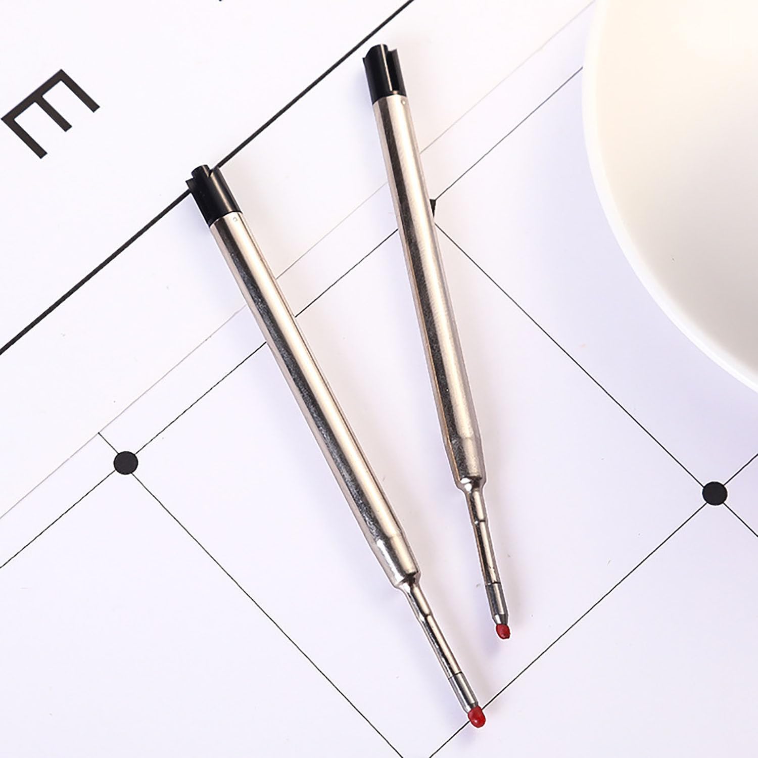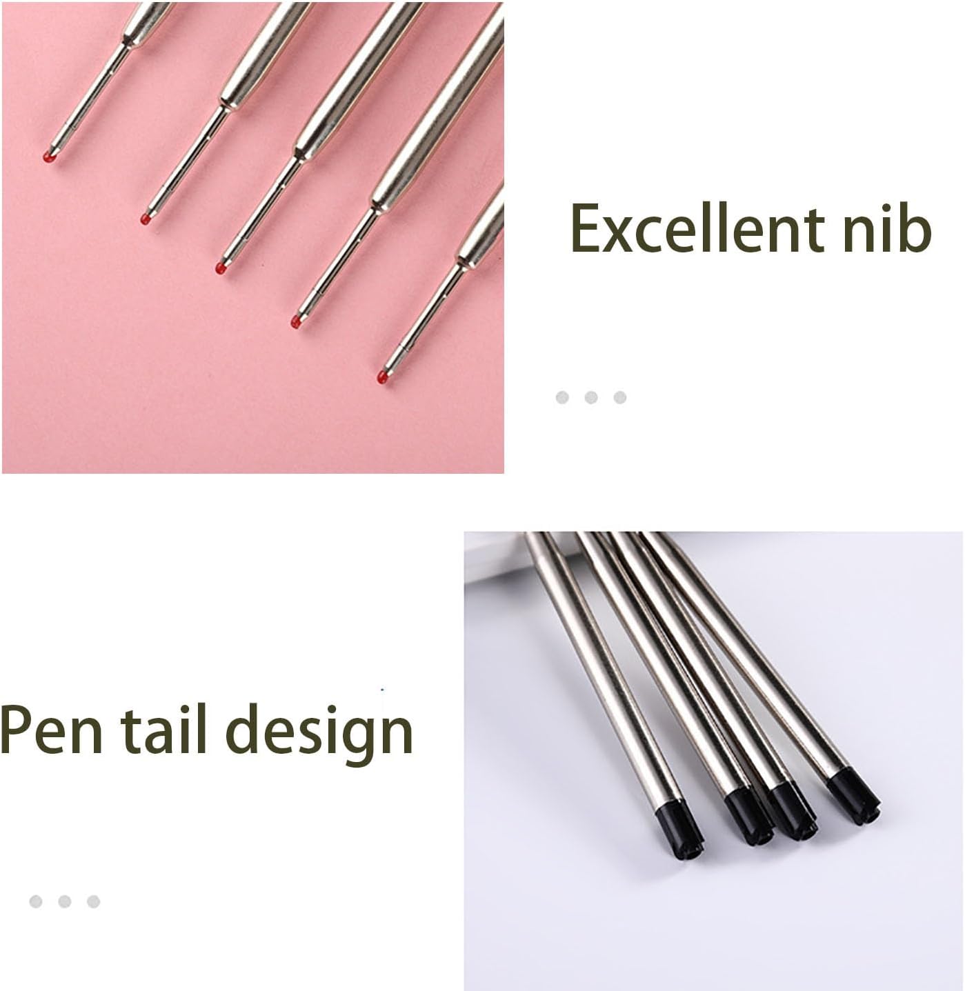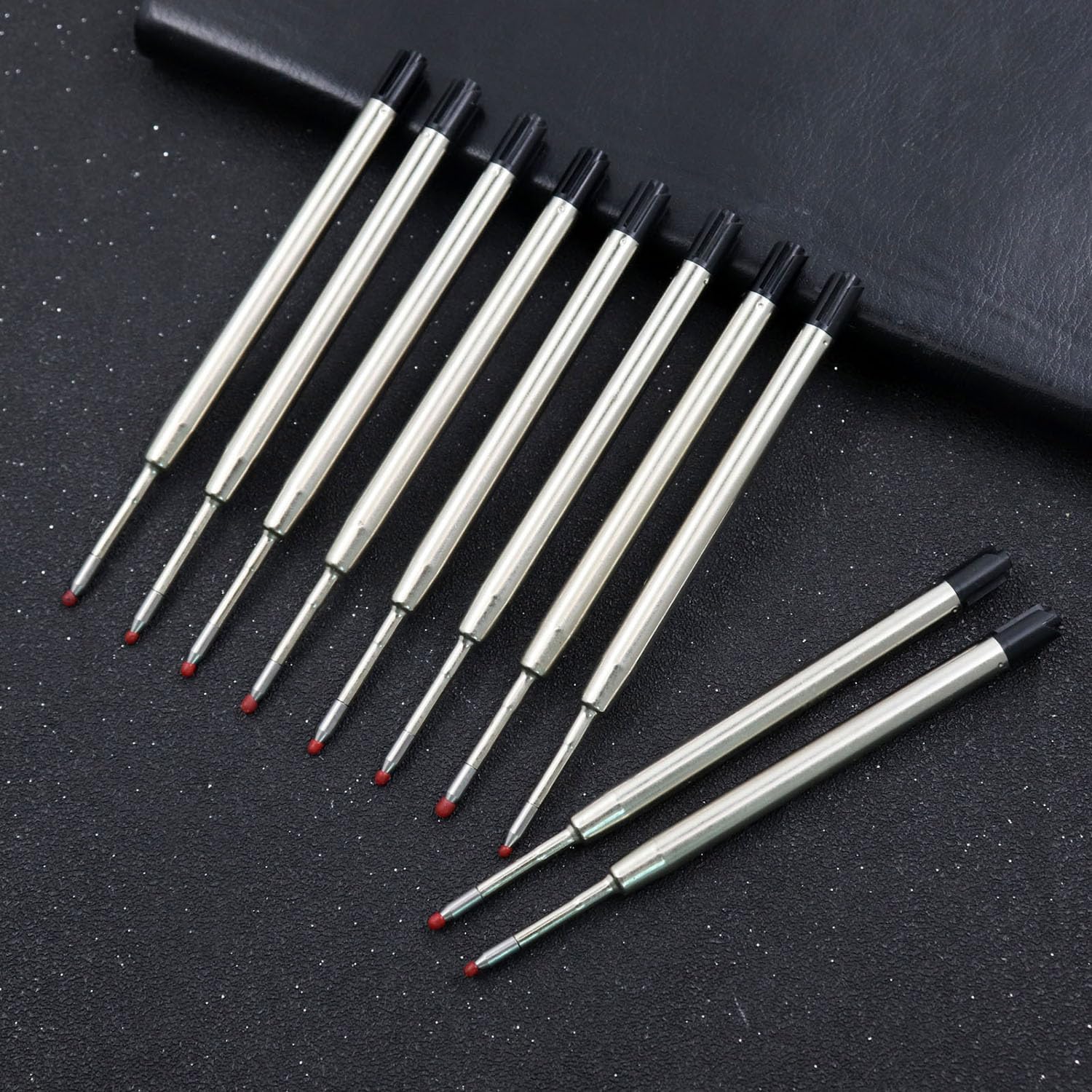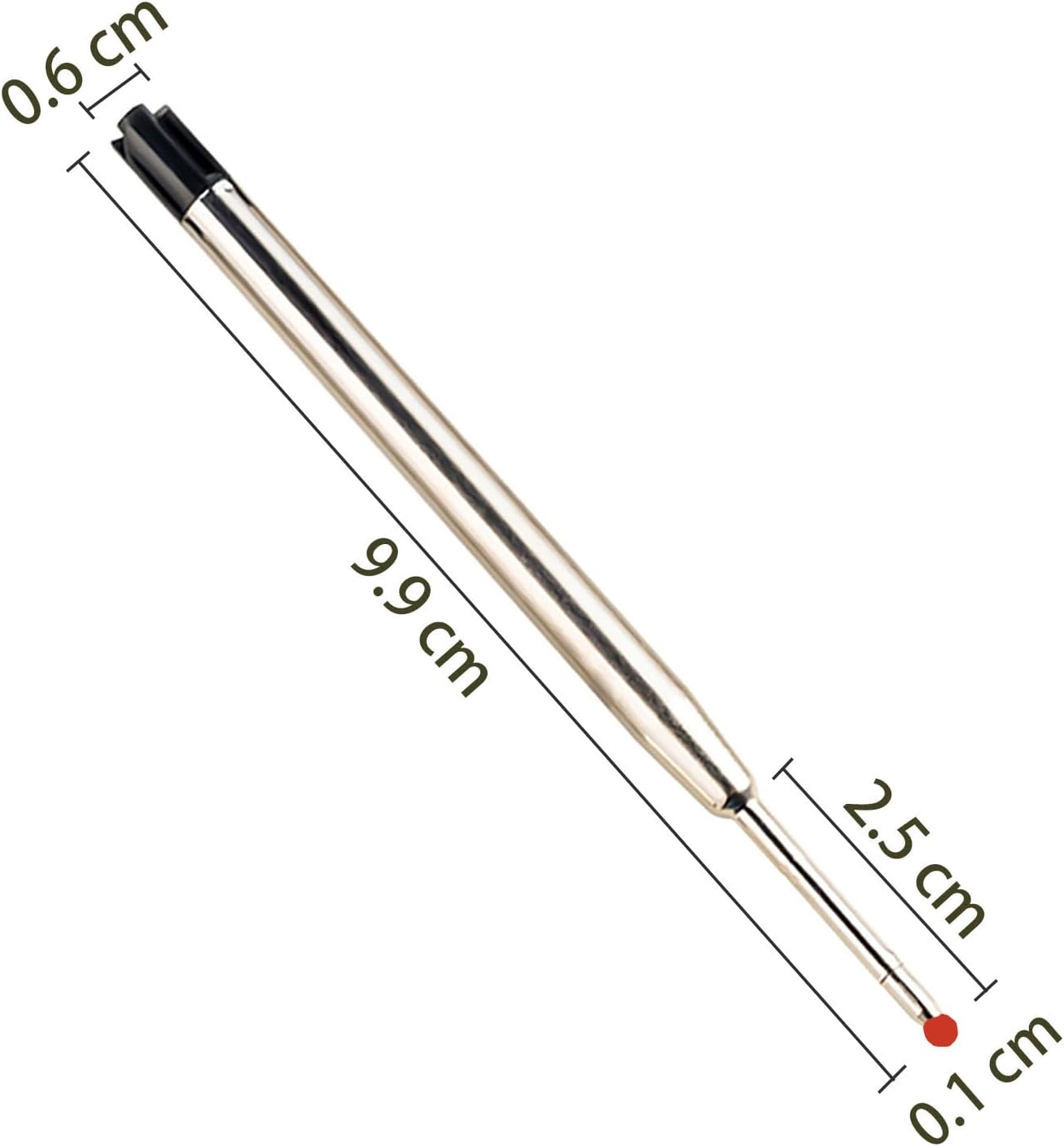 Cosa ottieni: Riceverai un set di 10 ricariche per penna nero di alta qualità. Dimensioni: La lunghezza totale è di 9,9 cm, le mine di alta qualità con punta da 1,0 mm garantiscono un flusso di inchiostro regolare e uniforme per un'esperienza di scrittura eccellente. Buona qualit: il corpo di ricarica è fatto di materiale del metallo, leggero e liscio; L'inchiostro si asciuga rapidamente con un flusso di inchiostro coerente, non sanguina attraverso. Ricariche di grande capacità: Ricarica in materiale metallico, previene perdite di inchiostro causate da pressione, urti e temperatura, resistente allo sbiadimento, flusso di inchiostro uniforme, non trapassa. Ricariche sostitutive: le ricariche sono adatte per ufficio, lavoro, scuola e casa, ecc. Piccolo e portatile, facile da trasportare.