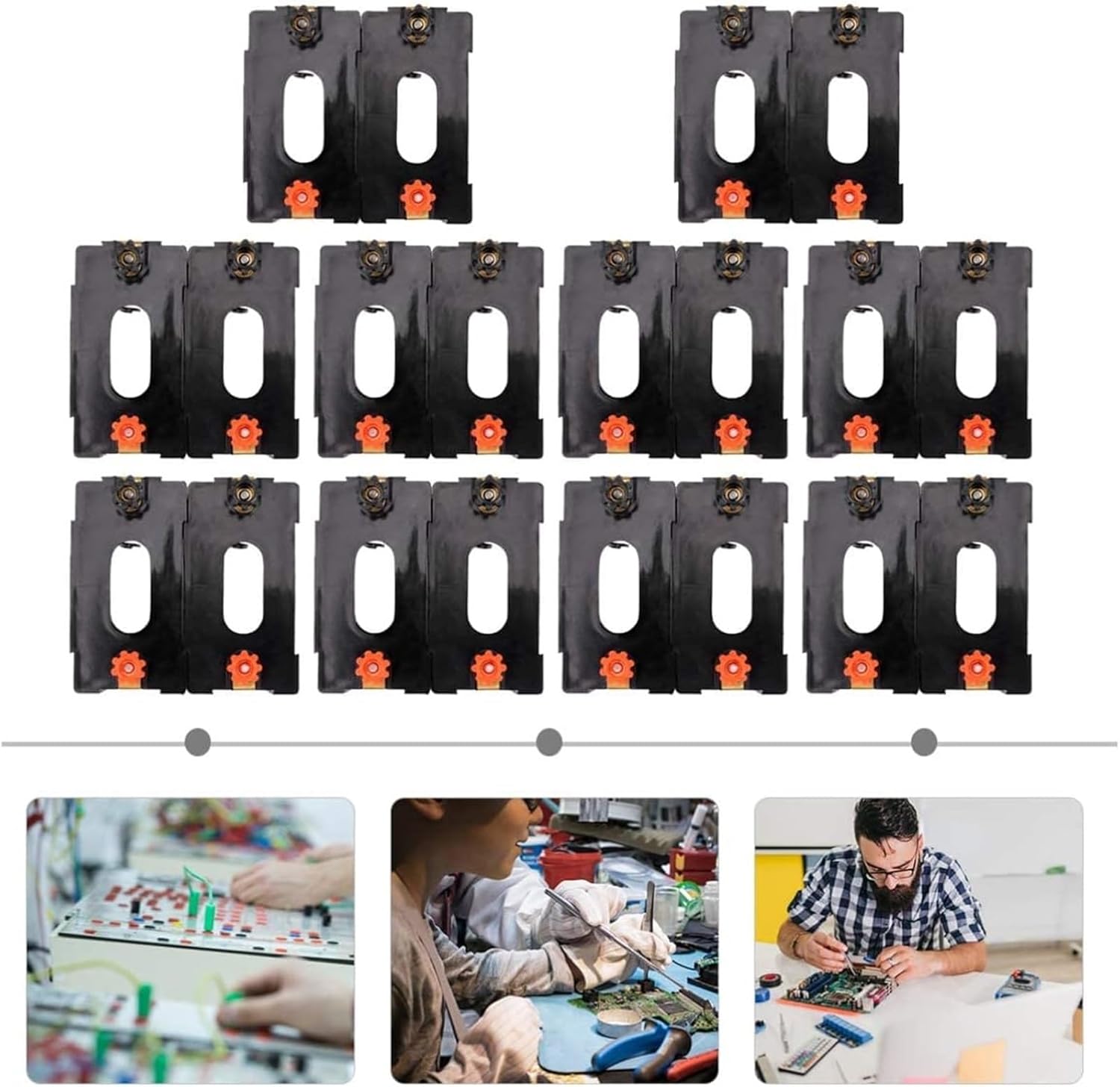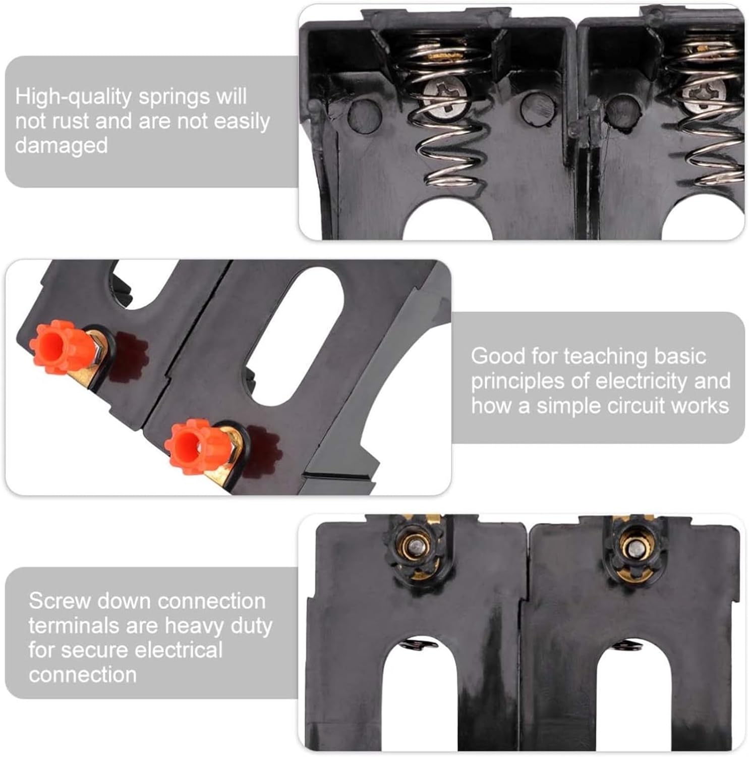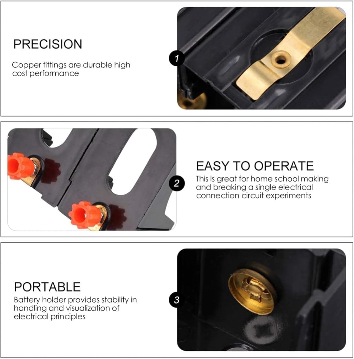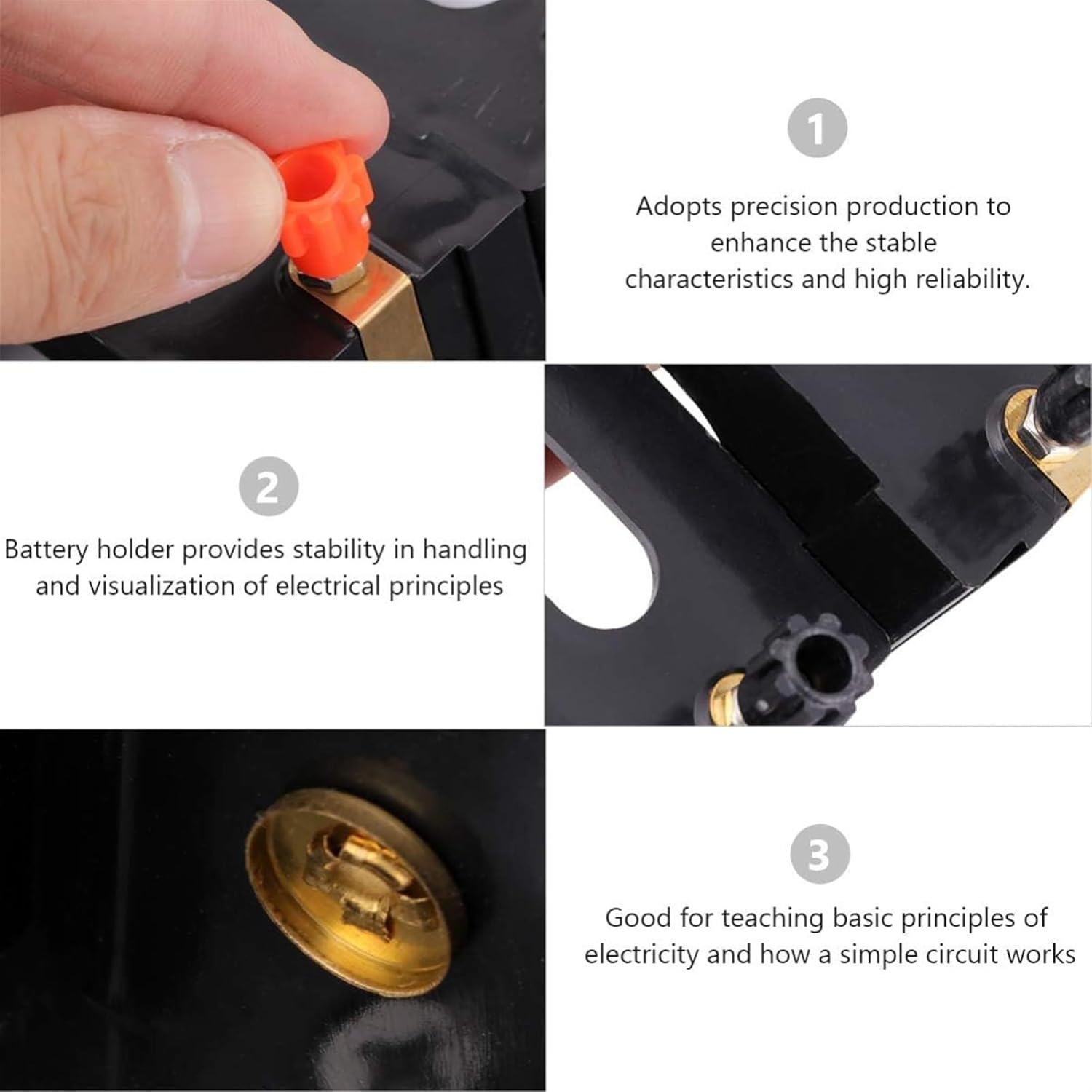 Il supporto per batteria garantisce stabilità nella gestione e nella visualizzazione dei principi elettrici, il morsetto di collegamento a vite e i terminali di collegamento a vite sono resistenti, per una connessione elettrica sicura. * Facile da usare e ottimo strumento di apprendimento per i bambini. Praticare su un modello educativo sarebbe sicuramente fantastico per qualsiasi studente. * Adotta una produzione di precisione per migliorare le caratteristiche di stabilità e l'elevata affidabilità. * Buono per insegnare i principi base dell'elettricità e come funziona un circuito semplice. Sono ottimi per dimostrazioni e progetti. * Ideale per gli esperimenti scolastici a casa su come creare e rompere un singolo circuito di collegamento elettrico.