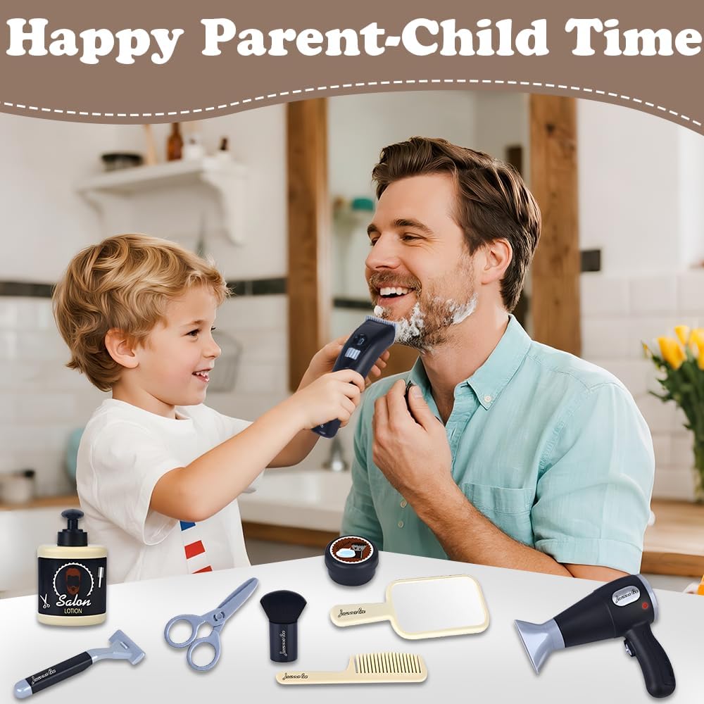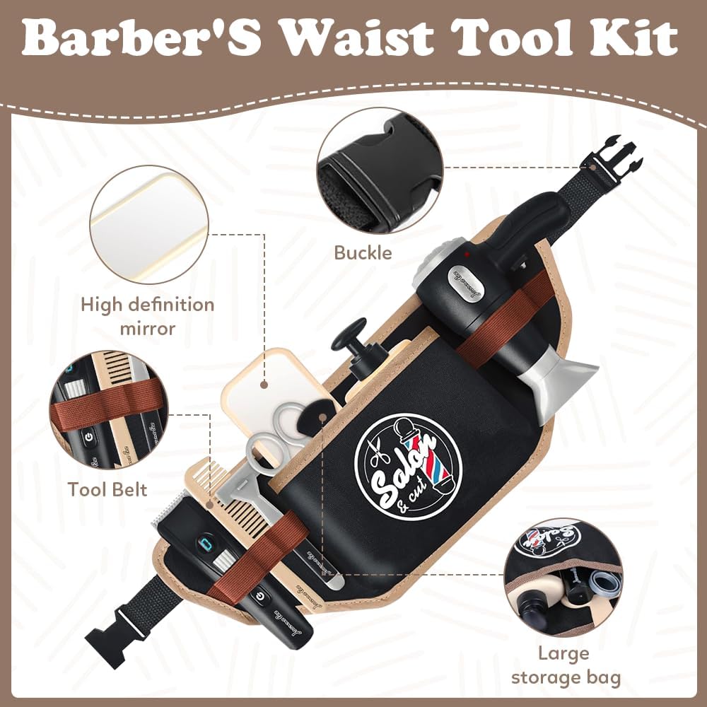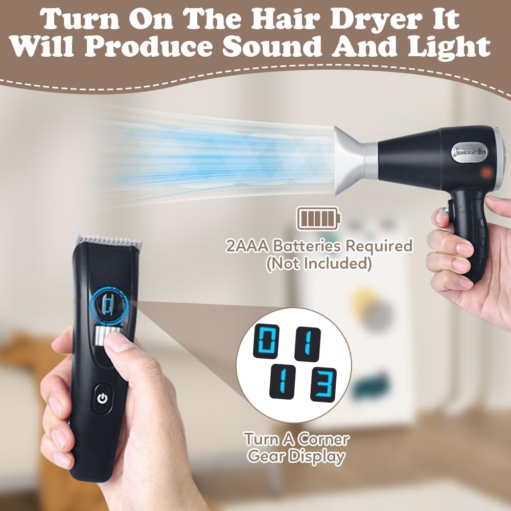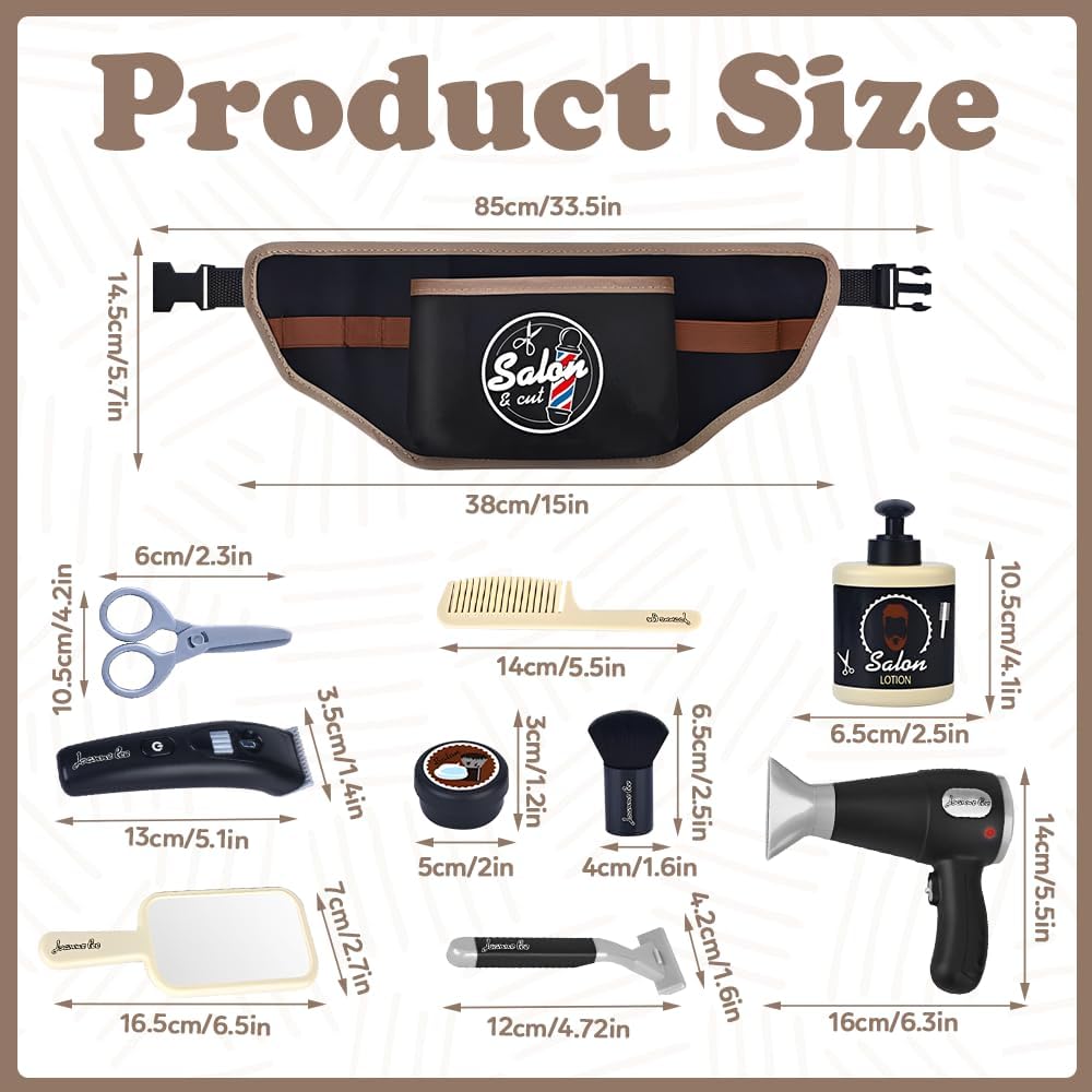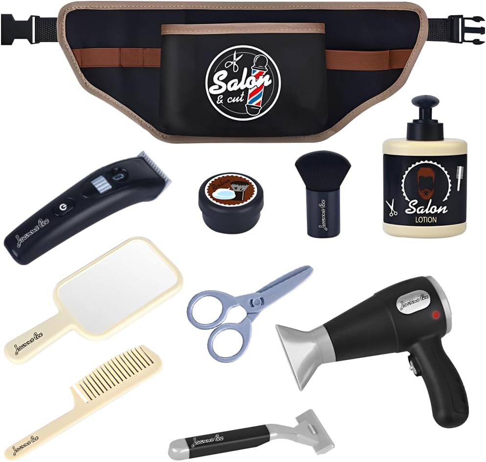 Set: questo set da parrucchiere per bambini include 10 giocattoli da parrucchiere per bambini, tra cui un tagliacapelli, un asciugacapelli, un rasoio, un marsupio, forbici, spazzola, specchio e altri accessori per lo styling da salone per il tuo bambino. Simulazione realistica: l'asciugacapelli a batteria emette il suono di un vero asciugacapelli (batteria non inclusa). Il tagliacapelli può simulare la posizione delle marce. Basta ruotare manualmente la manopola e il numero apparirà sul display. Gioco di ruolo: questo set da parrucchiere per bambini promuove le capacità motorie fini e grossolane e incoraggia il gioco di fantasia. I bambini possono simulare esperienze di vita reale, migliorare la coordinazione occhio-mano, allenare il pensiero, stimolare la loro immaginazione e promuovere il lavoro di squadra. Materiale: Il set da parrucchiere per bambini è realizzato in materiali ABS robusti e durevoli, con una superficie liscia. Così il tuo bambino può imparare e crescere in modo naturale attraverso un gioco rilassante e divertente. Regalo ideale: Questo set da parrucchiere per bambini è il regalo perfetto per bambini dai 3 anni in su. Con questo giocattolo da parrucchiere per bambini, i tuoi bambini possono fingere di essere parrucchieri o barbieri professionisti. Questo giocattolo da parrucchiere per bambini è un ottimo regalo per compleanni, Natale, la Festa dei Bambini e altre occasioni speciali.