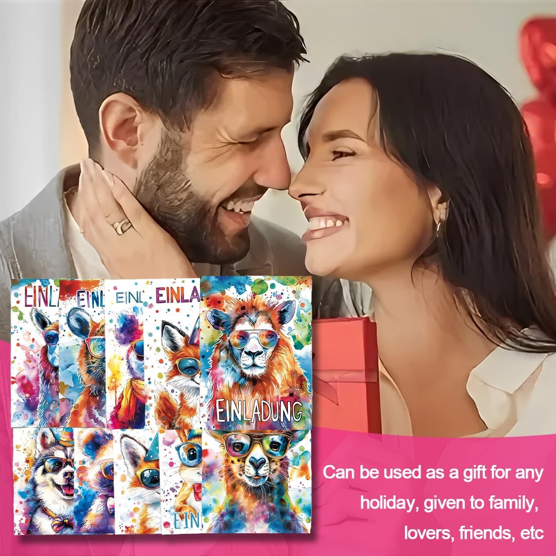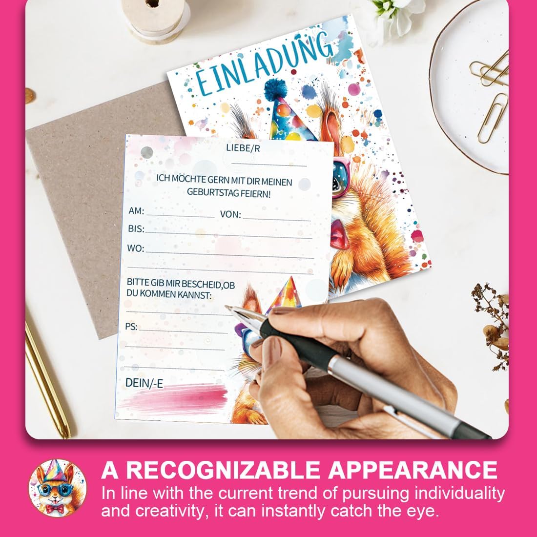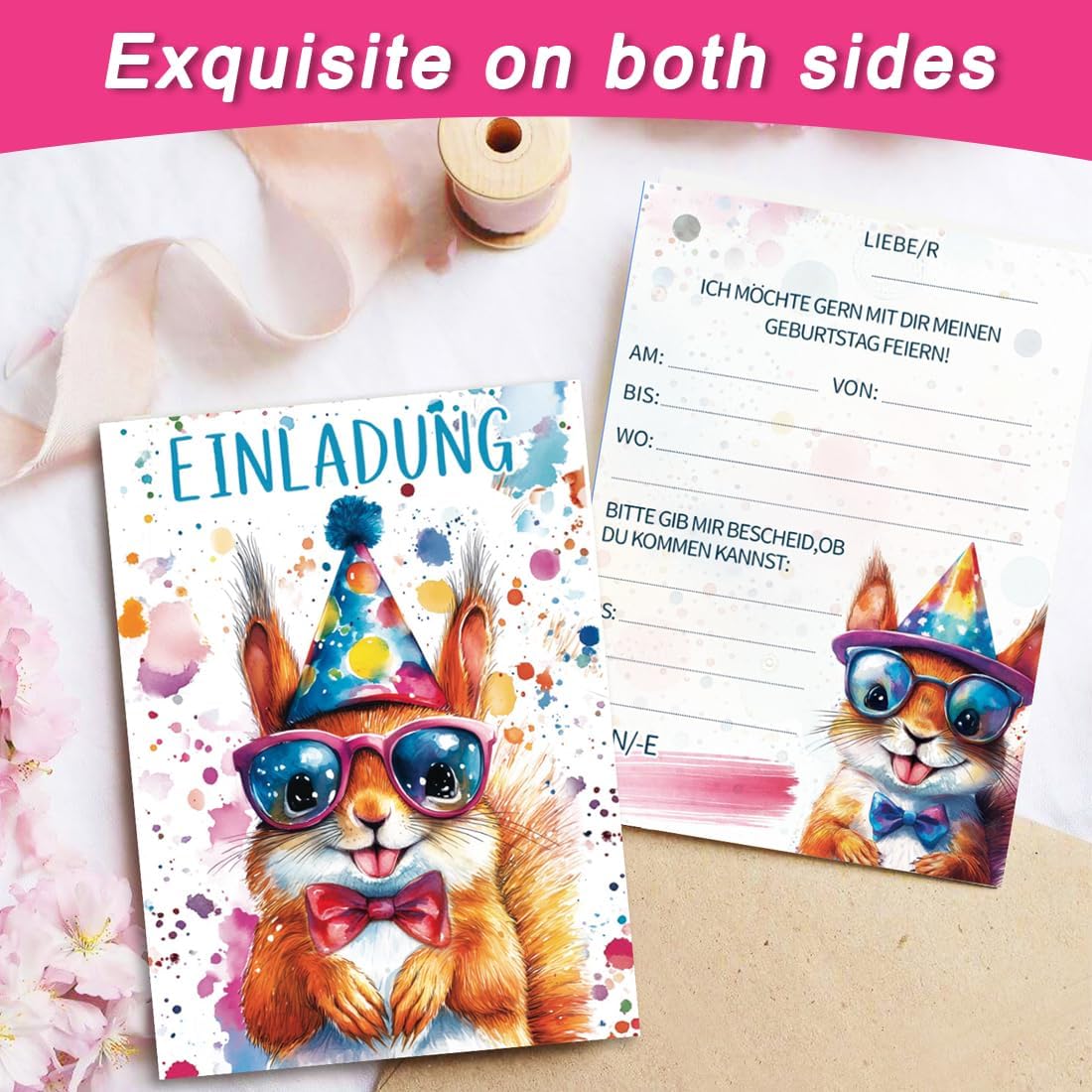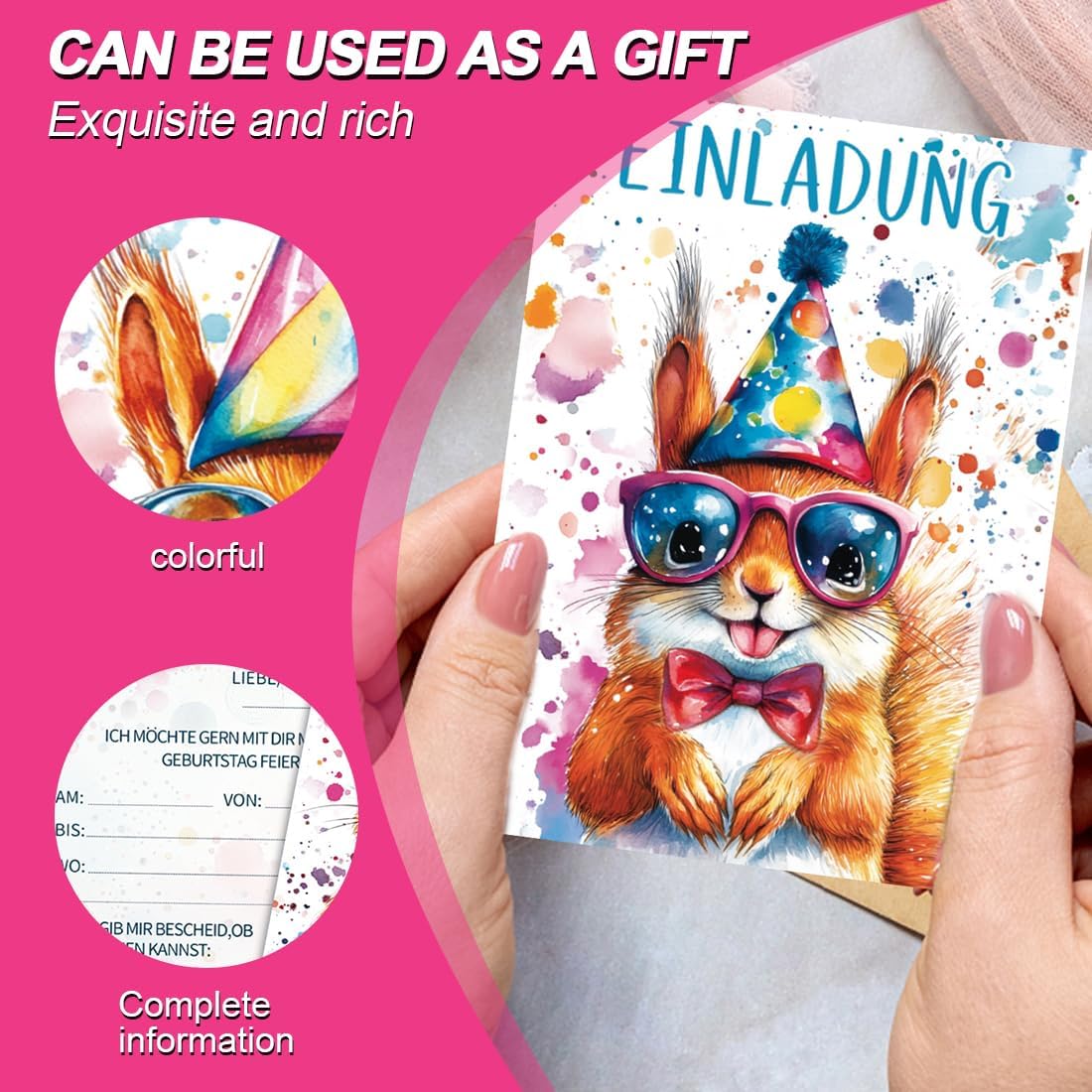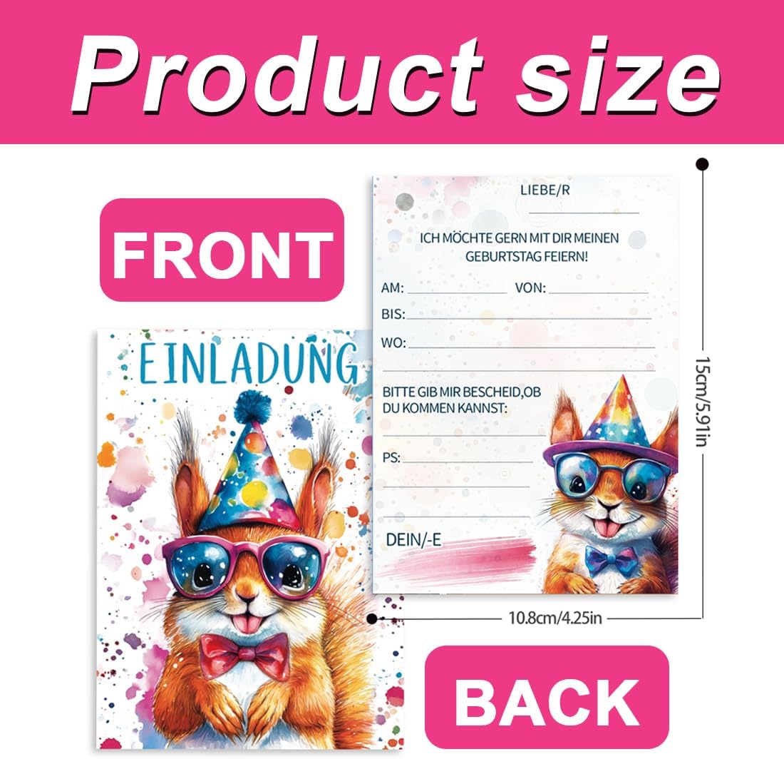 10 biglietti d'invito per feste di compleanno per bambini: la confezione contiene 10 biglietti d'invito, delle dimensioni di 10,8 x 15 cm. Utilizzate questi biglietti d'invito con animali unici per immergervi nel mondo degli animali e organizzare una festa di compleanno per i vostri bambini. Disegni acquerellati: sono disponibili 10 stili: scoiattolo, volpe, gattino, panda, cagnolino, leone, orsetto, leopardo, alpaca e tigre, tutti carini e alla moda, con colori vivaci e unici, che rimarranno sicuramente impressi nella memoria degli amici che riceveranno l'invito. Carta di alta qualità: i nostri biglietti d'invito sono realizzati con carta ecologica accuratamente selezionata, con una stampa chiara, bordi arrotondati che non graffiano le dita e una superficie liscia che consente di scrivere agevolmente. Sono la scelta perfetta per le feste di compleanno degli amanti degli animali. Facile da compilare: il biglietto d'invito per il compleanno degli animali contiene il testo dell'invito e campi vuoti per compilare rapidamente le informazioni. Con questo biglietto d'invito potrete esprimere i vostri sentimenti in modo rapido e accurato. Invitate i vostri piccoli ospiti in modo elegante e rendete la festa indimenticabile. Ampia gamma di utilizzi: gli inviti per bambini possono essere ampiamente utilizzati in occasioni come compleanni, feste a tema, feste in giardino, ecc., adattandosi alle esigenze di diverse occasioni e rendendo la festa più attraente. Festeggiate il giorno speciale dei vostri bambini con questi inviti per feste di compleanno dal design accurato!