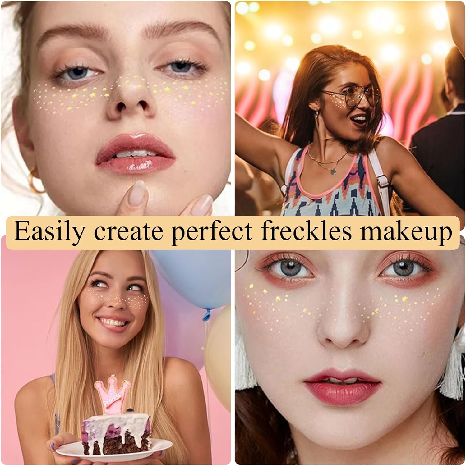Materiale di Alta Qualità: Realizzati in materiale Carta bianca all'acqua di alta qualità, questi tatuaggio di lentiggini scintillanti sono adatti a tutti i tipi di pelle, anche a quelli delicati. La pellicola di trasferimento a base d'acqua tatuaggi per il viso con lentiggini rende l'applicazione e la rimozione rapide e facili, senza danneggiare la pelle o lasciare residui Impermeabile e di Lunga Durata: Questo lentiggini finte è appositamente progettato per essere impermeabile e di lunga durata, assicurando che non sbavi durante le attività. Una volta applicato correttamente, tatuaggi per viso scintillanti può essere saldamente attaccato alla pelle fino a sei giorni, anche se si partecipa ad attività faticose come il nuoto o la corsa, non c'è bisogno di preoccuparsi che cada Facile da Rimuovere: Quando è il momento di rimuovere cerotti per lentiggini scintillanti, può essere facilmente rimosso pulendolo delicatamente con struccante, olio per bambini o salviette detergenti. Anche l'alcool denaturato è una buona scelta per garantire che non ci siano residui tenendo conto della delicatezza della pelle. In questo modo, adesivi per tatuaggi di lentiggini può aiutarti a goderti ogni momento splendente senza preoccupazioni Facile da Usare: Tatuaggi viso ha un design di taglio ponderato. La forma dell'adesivo è appositamente ottimizzata per il contorno delle guance e il taglio centrale lo rende più adatto al viso. Facile da usare, basta staccare la pellicola protettiva dell tatuaggi oro, attaccare il lato lucido alla pelle e pulire delicatamente il retro con una spugna o un panno umido per circa 20-30 secondi, attendere che si asciughi per mostrare la lucentezza naturale Utilizzo Versatile: Che si tratti di un concerto estivo, di un weekend in spiaggia, di una serata tra ragazze o di un addio al nubilato, questi glitter tatuaggi temporanei donna sono un'ottima scelta. Le brillantini viso possono essere utilizzate come parte di festival, feste di compleanno o come abbellimento sugli abiti, perfette per le persone che vogliono aggiungere un tocco di colore in più