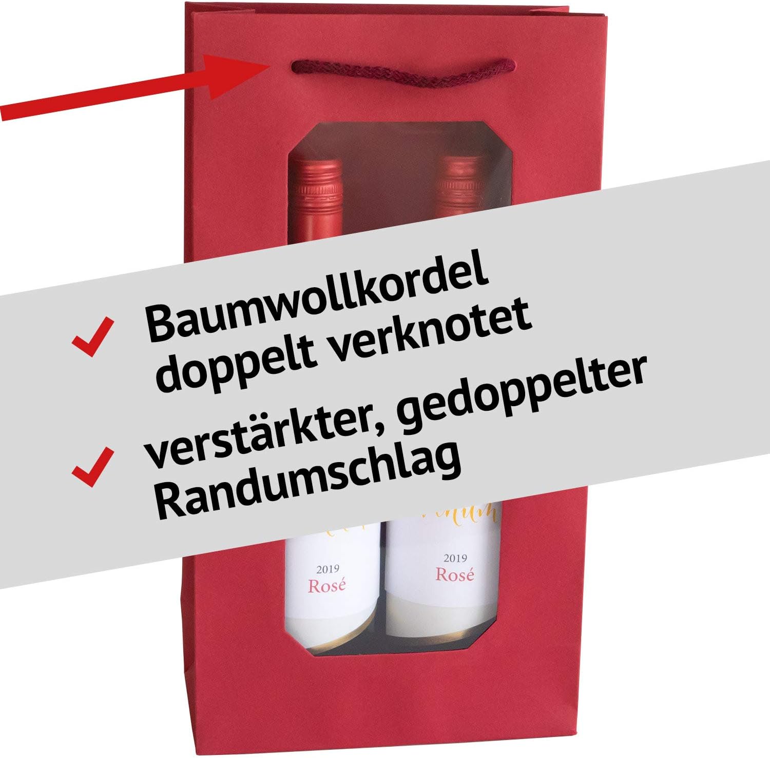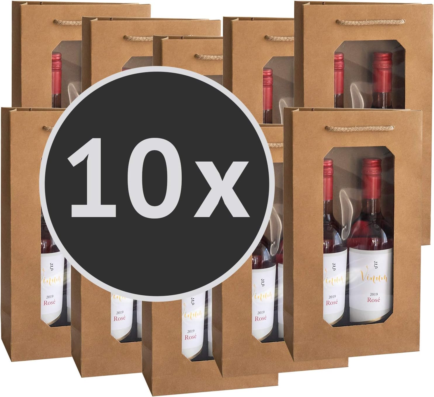 🍇 Eleganti borse per vino con finestra per 2 bottiglie di qualità premium con una sensazione leggermente vellutata, realizzate in carta kraft riciclata al 100% ecologica 🍇 Borse per bottiglie fatte a mano con 2 robuste corde di trasporto individuali con 4 nodi in cotone al 100% 🍇La confezione delle bottiglie è realizzata in modo eccellente e incollata con cura. 🍇 La borsa per bottiglie ha un fondo in cartone extra incollato per rinforzarla - protegge dalla rottura del contenuto 🍇 Busta rinforzata con doppio bordo con cartone integrato - protegge dai cordoni che vengono strappati 🍇 Borsa per vino per tutte le occasioni regalo come Natale, Pasqua, compleanni, feste 🍇 Bellissima borsa regalo per vino, spumante, champagne, birra, prelibatezze e altri regali 🍇 Dettagli del prodotto Confezione per vino: Dimensioni: (A x L x L): 370 x 200 x 100 mm Peso per sacchetto di vino: 0,059 KG/pezzo Confezione: 10 pezzi Carta: 220 gr. Carta kraft riciclata Made in Europe, lavorazione finale a mano in Italia, consegnata secondo la descrizione dell'articolo senza decorazioni