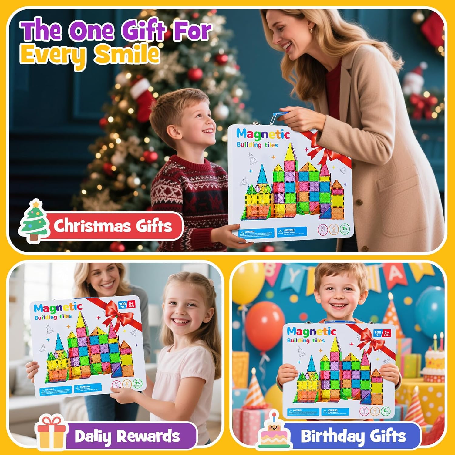 【Piastrelle magnetiche grandi da 100 pezzi per edifici più grandi senza limiti】 Questo set da costruzione magnetico da 100 pezzi viene fornito con una scatola di metallo di alta qualità e comprende 54 quadrati, 12 triangoli equilateri, 18 triangoli rettangoli, 10 rettangoli e 6 triangoli isosceli più grandi, tutti nei nostri luminosi colori dell'arcobaleno. È il pacchetto perfetto per iniziare il tuo viaggio con le piastrelle magnetiche, offrendo ai bambini tutto ciò di cui hanno bisogno per ore di gioco fantasioso, sia che si tratti di costruire grandi strutture, piste da corsa o scenari creativi. 【Dimensioni standard 7,5 cm e resistenti alla sicurezza】 Abbiamo progettato queste piastrelle pensando alla sicurezza di tuo figlio. Ogni piastrella gigante da 7-7,5 cm è la dimensione di sicurezza standardizzata per i bambini. Utilizzando l'avanzata tecnologia di saldatura a ultrasuoni, ogni potente magnete è permanentemente racchiuso, creando un sigillo indistruttibile e offrendo ai genitori la massima tranquillità. La dimensione standard di 7,5 cm garantisce la compatibilità con altre piastrelle magnetiche e giocattoli con pista magnetica, ampliando le possibilità di gioco. 【Elevata trasparenza e forte potere magnetico】Le nostre piastrelle magnetiche offrono tre volte la trasmissione della luce rispetto alle piastrelle magnetiche convenzionali. L'elevata trasparenza consente ai bambini di vedere gli oggetti in modo chiaro e senza distorsioni attraverso le tessere magnetiche, ideale per lo sviluppo cognitivo dei bambini. La forte forza magnetica consente ai bambini di costruire creazioni più robuste e di godere di effetti di rifrazione più chiari. 【Giocattoli STEM Montessori e sensoriali】Le tessere magnetiche sono giocattoli aperti che crescono con il tuo bambino. Sono più che semplici costruzioni. Divertendosi ed essendo creativi, i bambini sviluppano anche abilità legate alle materie STEM come il riconoscimento di modelli, i principi dei magneti, la risoluzione dei problemi e altro ancora con le tessere magnetiche. Queste tessere sono anche ottimi giocattoli sensoriali per incoraggiare il gioco sensoriale. 【Leggermente costoso ma un prezioso regalo educativo a lungo termine】Perfette per giochi di gruppo e aule, queste tessere magnetiche sono perfette per le scuole materne, le classi della scuola materna e i giochi all'aperto. Un fantastico giocattolo per bambini piccoli, bambini in età prescolare e bambini in età scolare. Un'ottima scelta regalo per compleanni, festa dei bambini, laurea all'asilo, Natale e altro ancora.