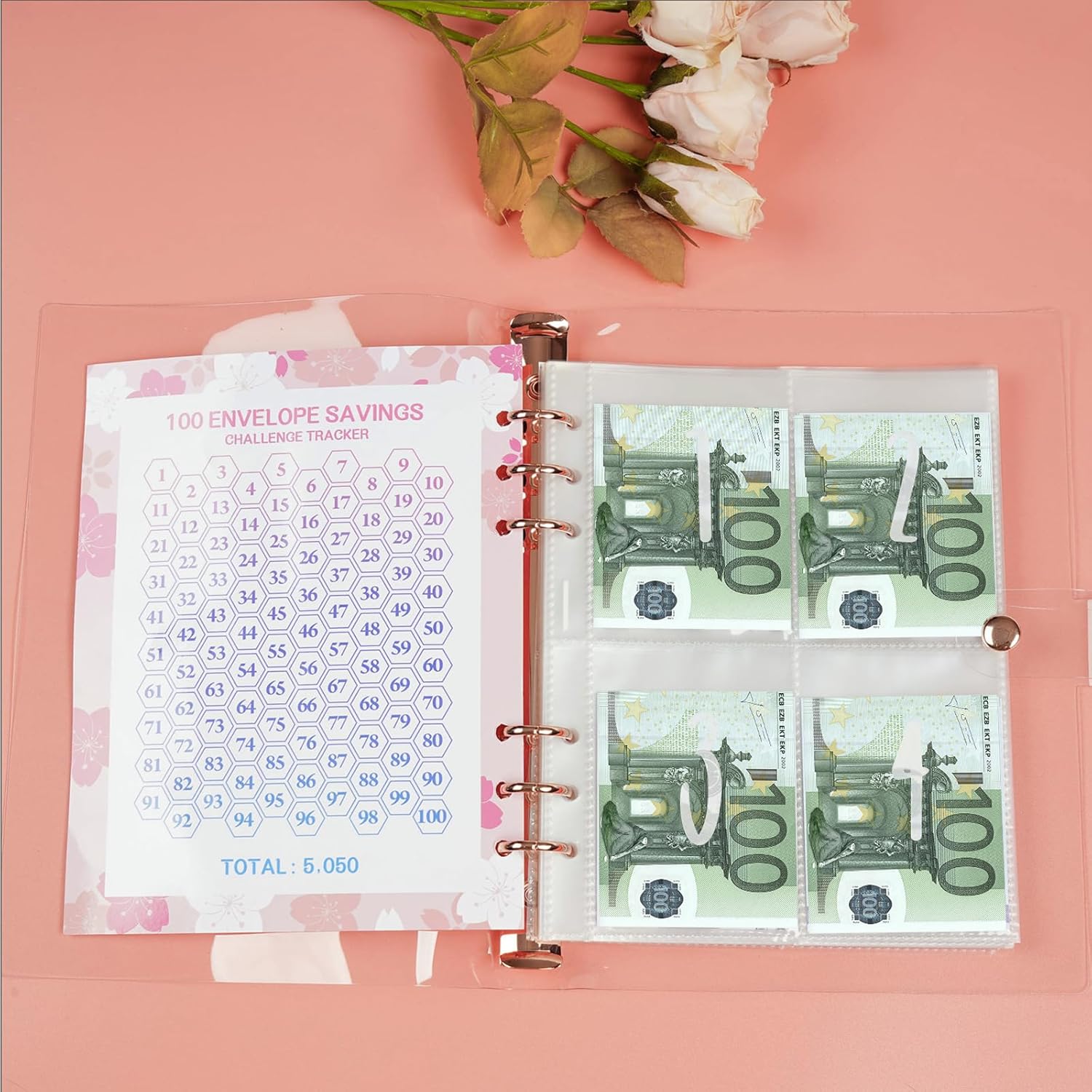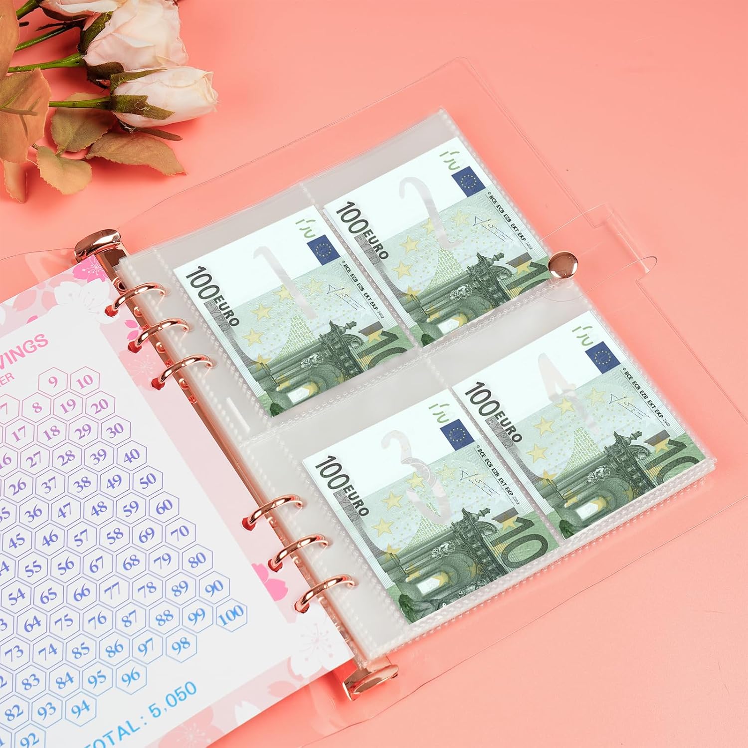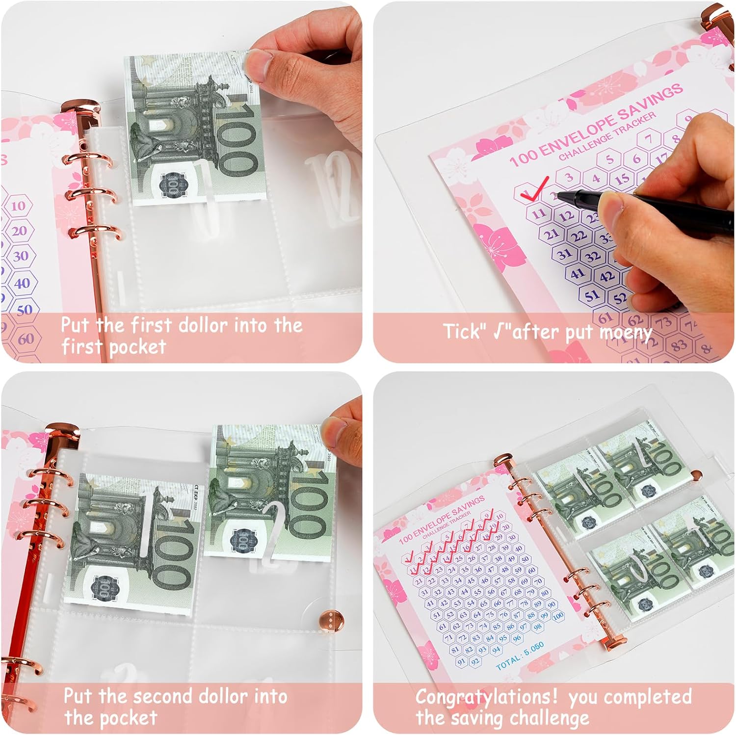 libro del risparmio: ti presentiamo la cartella sfida con 100 buste per una gestione finanziaria efficace. Il raccoglitore Challenge da 100 buste contiene 25 fogli di pellicola trasparente per biglietti da 4 quadrati (100 slot per carte) + 1 foglio di carta perforata da 100 giorni. Questa cartella di risparmio ti aiuterà a creare un budget, tenere traccia delle spese e raggiungere i tuoi obiettivi di risparmio e di rimborso del debito. Sviluppa un piano di risparmio: dimensioni 23,5*17,5 cm, la cartella di risparmio viene fornita con 25 pellicole per carte a quattro griglie e 1 foglio di cartone per 100 giorni. Il design libretto risparmio soldi include buste impermeabili e resistenti agli strappi che garantiscono una conservazione sicura dei tuoi risparmi. Costruzione in PVC: realizzato con materiali in PVC resistente, questo budget planner per soldi offre stile e durata. Il colore rosa del pianificatore di budget aggiunge un tocco di eleganza alla tua pianificazione finanziaria. Facile da trasportare: portafoglio salvaspazio compatto e leggero, facile da trasportare, comodo per casa, ufficio, auto, scuola e viaggi, si adatta facilmente allo zaino tascabile, la borsa può essere nella borsa, nella valigia o sulla scrivania. Affronta in qualsiasi momento la sfida dei tuoi obiettivi di risparmio e risparmia! Regalo Perfetto: coinvolgi tutta la famiglia nel risparmio con divertenti sfide di risparmio che sono anche un ottimo modo per insegnare ai bambini come risparmiare. Che tu sia un bambino o un adulto, la nostra sfida di risparmio di denaro da 100 buste è lo strumento perfetto per aiutarti a risparmiare denaro e raggiungere i tuoi obiettivi finanziari.