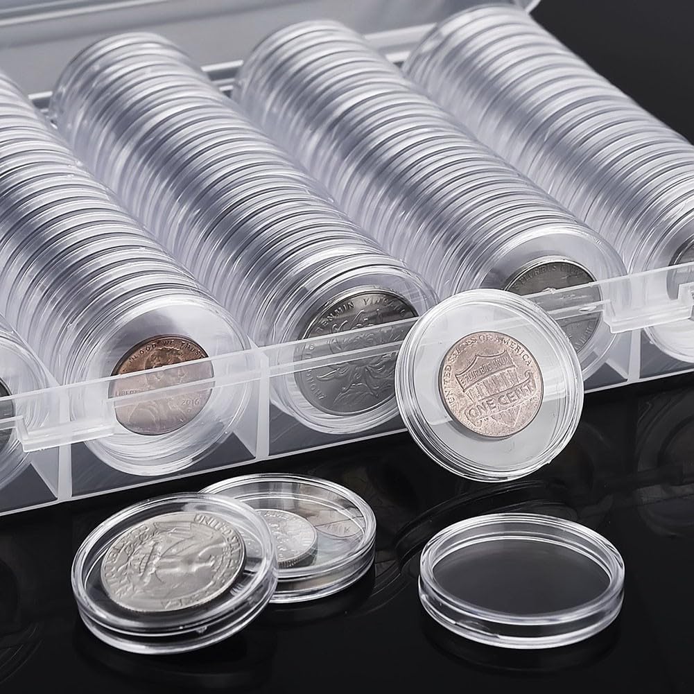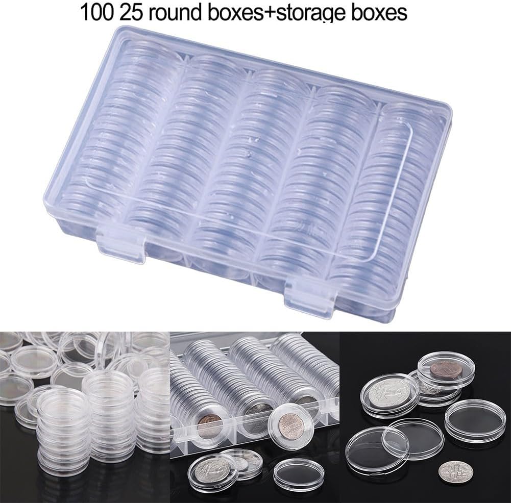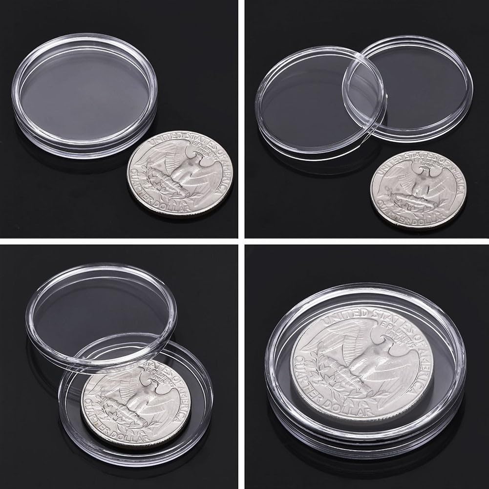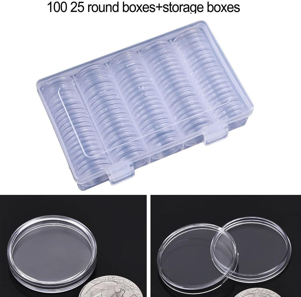 Protezione delle monete: proteggi le tue monete dai danni con questa scatola porta capsule in plastica. Display trasparente: l'involucro piatto trasparente consente di apprezzare la parte anteriore e posteriore della moneta senza rimuoverla dalla capsula. Sicuro e conveniente: la scatola è sicura da usare e facile da aprire e chiudere, le monete rimangono saldamente posizionate all'interno. Materiale: realizzato in polipropilene ultra spesso, ultra duro e ad alta trasparenza, il portamonete è accuratamente rifinito. Uso versatile: adatto per tutti i tipi di monete, tra cui monete di rame, monete d'argento, monete commemorative e monete d'oro. Facile da trasportare: le capsule per monete sono facili da usare e sono dotate di una scatola per riporre e trasportare comodamente. Contenuto della confezione: include 100 capsule per monete e 1 scatola (rondelle o monete non incluse).