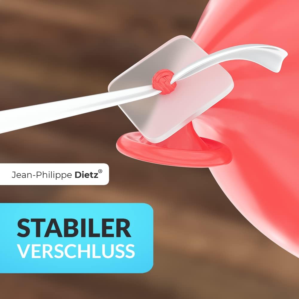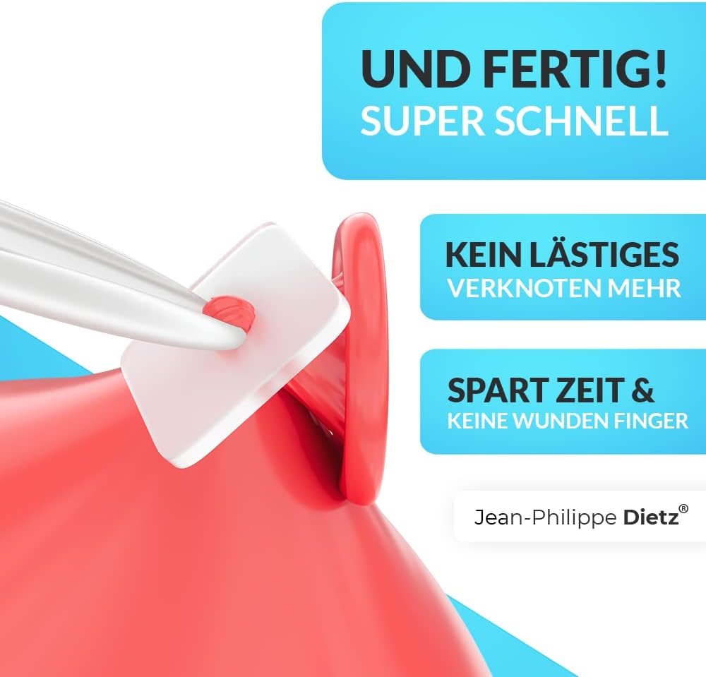 ✅ Chiusura automatica premium - Con queste 100 chiusure a sgancio rapido per palloncini puoi chiudere rapidamente e facilmente palloncini normali e palloncini ad elio senza nodi. ✅ Nessun annodamento - Con queste chiusure per palloncini non dovrai più annodare ogni palloncino! Basta passare attraverso la punta del palloncino e tirare! Risparmia tempo! ✅ Può essere utilizzato più volte: basta estrarre il palloncino dal passante e riutilizzare la chiusura. ✅ Garanzia SODDISFATTI O RIMBORSATI di 60 giorni - Non puoi sbagliare acquistando i nostri cappelli per palloncini! ✅ Made in Germany - Le chiusure rapide per palloncini sono prodotte in Germania e quindi sono di alta qualità.
