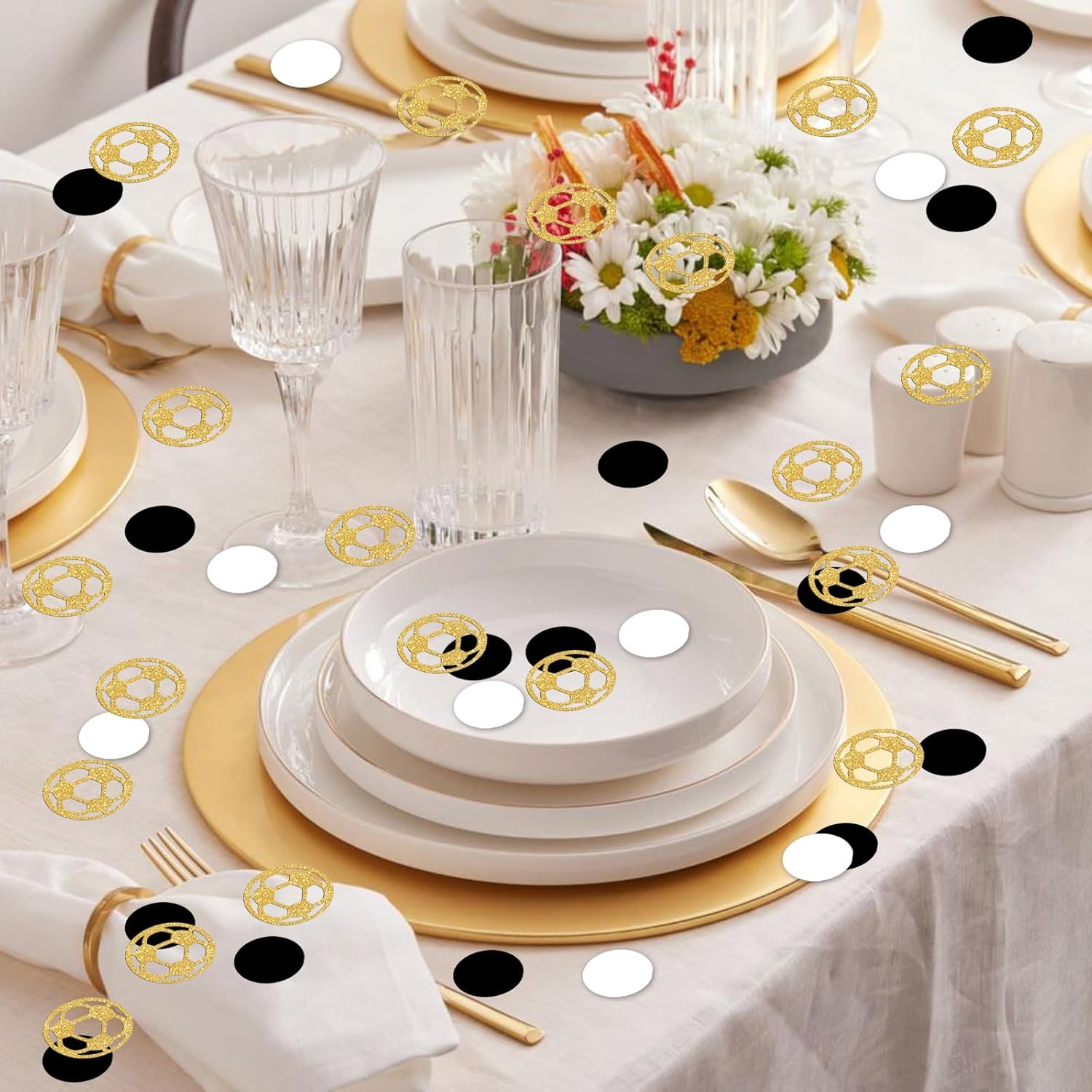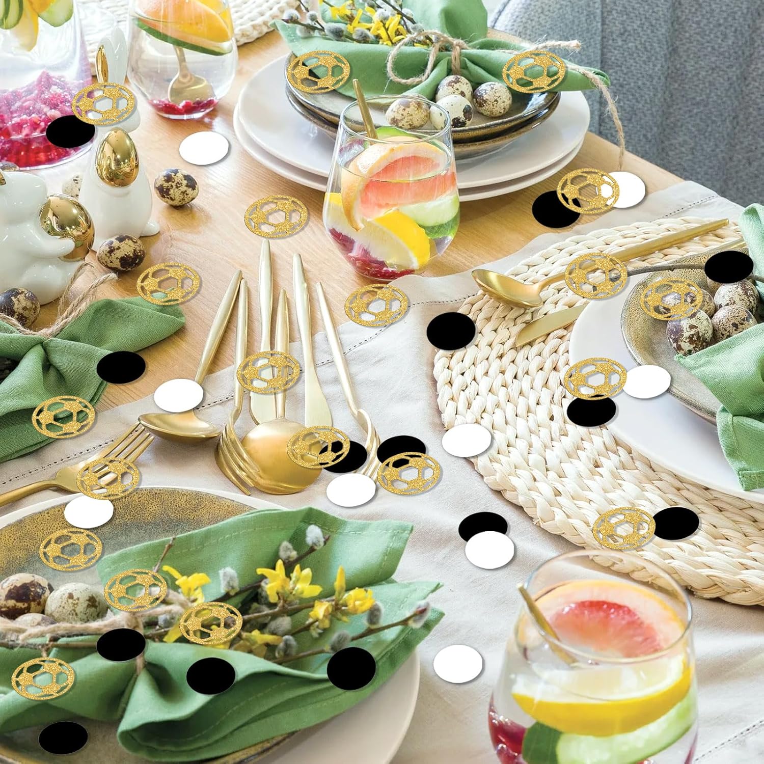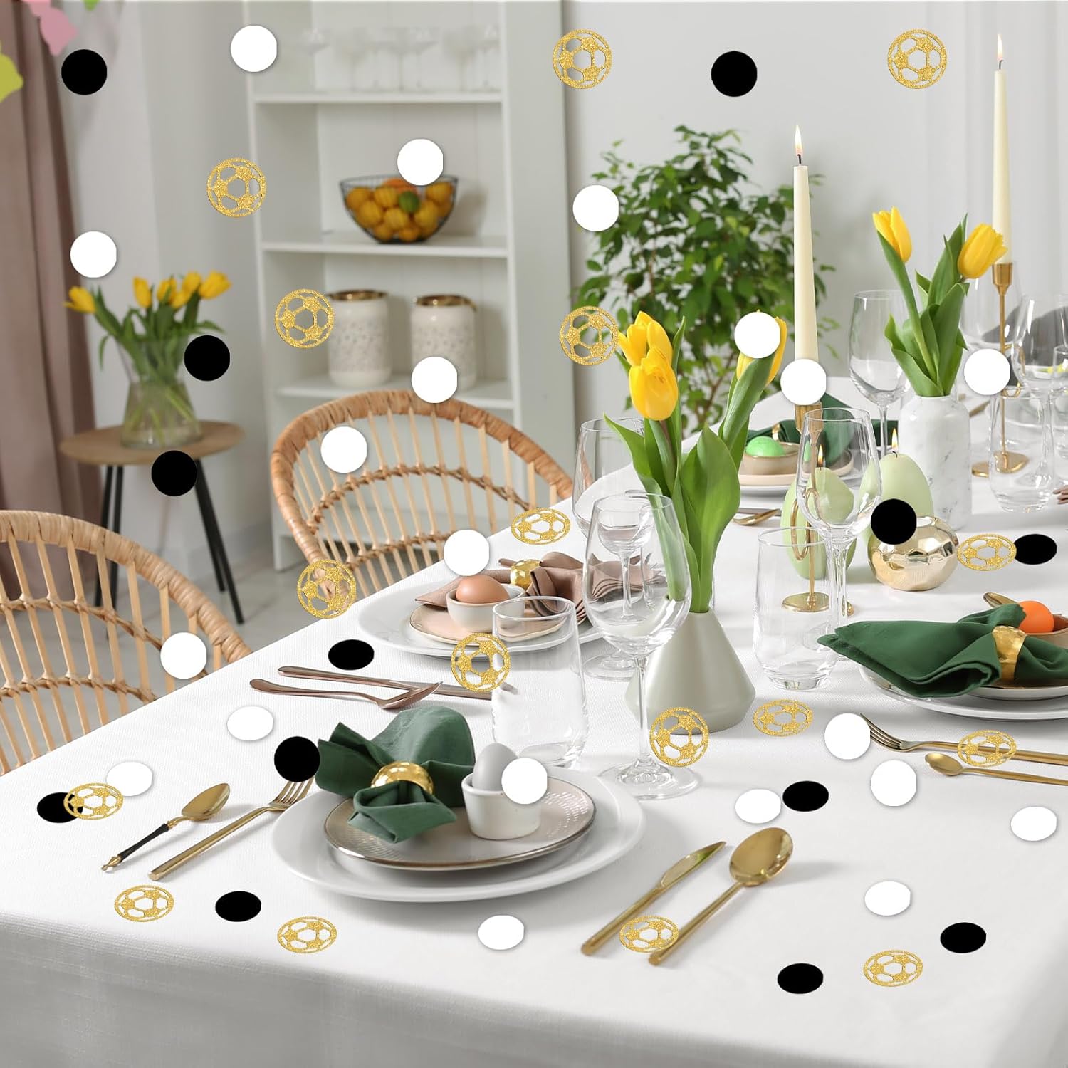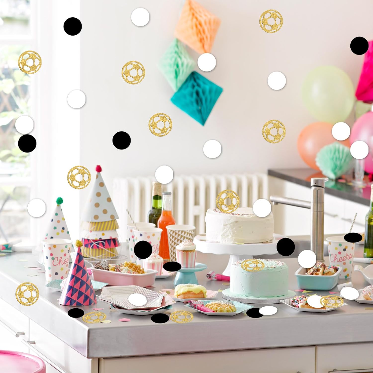 100 coriandoli da calcio per veri tifosi. I nostri coriandoli da calcio sono la perfetta decorazione da calcio per il compleanno dei bambini. Realizzato in carta glitterata di alta qualità con una superficie scintillante che non cade, con un diametro di 2,1 – 4 cm e realizzato in carta di alta qualità, questo set di decorazioni da calcio è ideale per piccoli e grandi appassionati di calcio, perfetto per qualsiasi decorazione di compleanno di calcio. Contiene palloni, stelle e diversi modelli di azione da calcio, disponibile in nero e oro Decorazione da calcio per il compleanno dei bambini: leggera e maneggevole, facile da distribuire su tavoli, pavimenti o altre superfici. Ideale per eventi interni ed esterni, sia che stiate pianificando una festa di compleanno a calcio per bambini o adulti, la nostra decorazione di compleanno da calcio garantisce un tocco sportivo su qualsiasi tavolo. Facile da distribuire e la tavola decorativa di compleanno diventa uno stadio Perfetto per ogni festa a tema calcistico: perfetta decorazione per feste di compleanno di appassionati di calcio, feste di calcio, decorazioni EM e mondiali. Porta l'entusiasmo del calcio in ogni evento, sia che si tratti di febbre della Champions League o dell'umore della Bundesliga, la decorazione da calcio porta una vera sensazione di campo da gioco sul tavolo. Questa decorazione per il compleanno di calcio è un must per ogni celebrazione di successo Decorazione da tavolo per compleanno: i coriandoli da calcio sono realizzati in carta colorata e robusta, ideali per decorazioni da calcio su piatti, biglietti di invito, tovaglie o regali. Un modo creativo e semplice per dare vita a qualsiasi tema decorativo di compleanno di calcio, combinate il kit di coriandoli da calcio per la vostra festa. Design grazioso e glitter scintillanti. Cospargilo sul tavolo, aggiungi un grande tocco alla tua festa Splendida attrazione per feste di compleanno per bambini: questa decorazione da calcio per bambini è l'attrazione di ogni celebrazione. Non importa se al chiuso o all'aperto, con questa fantastica decorazione da tavolo per il compleanno del calcio, il festeggiato rimarrà sicuramente al centro del gioco