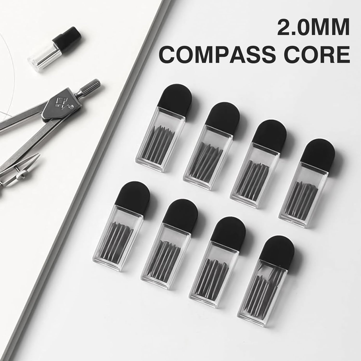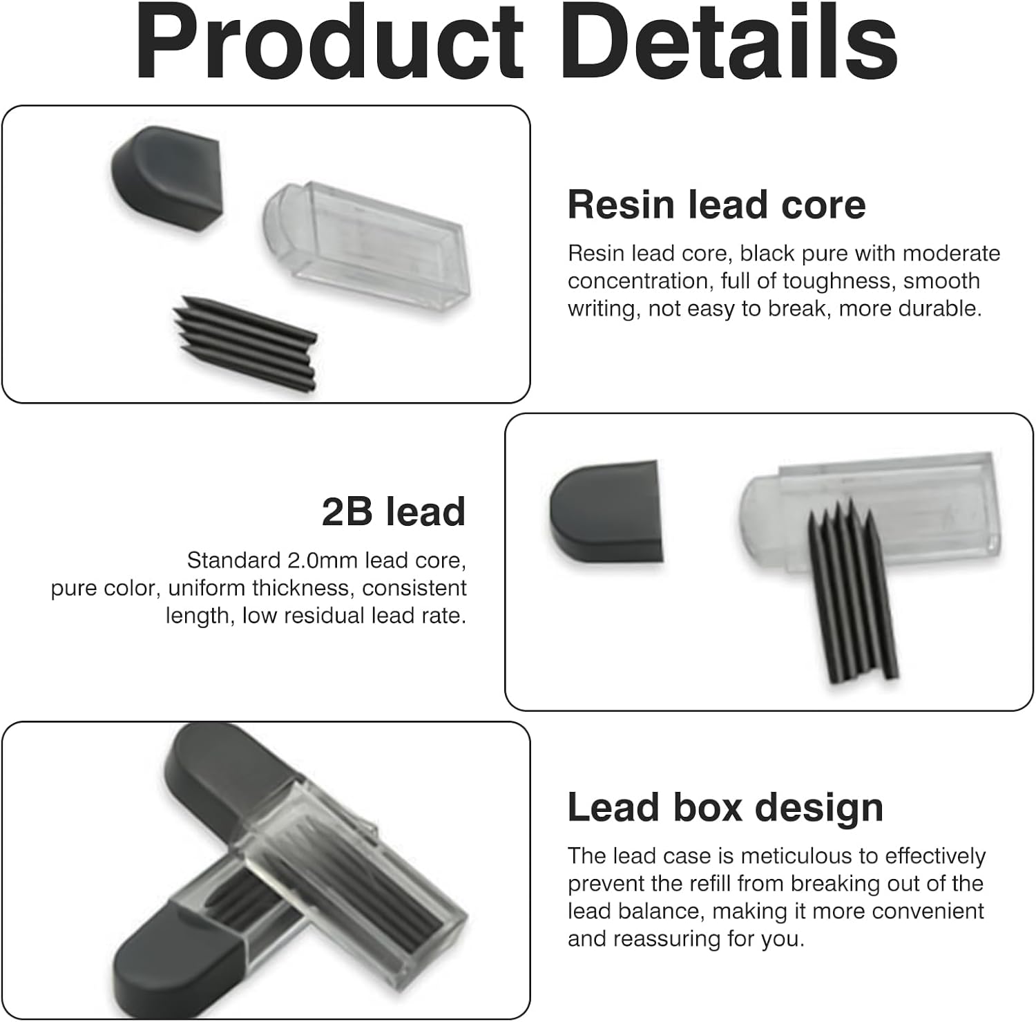 Design classico: la custodia per mine è rettangolare, compatta, leggera, minimalista e alla moda, trasparente, in modo che le mine siano facilmente riconoscibili e pratiche. Mine in resina: mine in resina nera con nero puro, durezza media, elevata flessibilità, scrittura fluida e resistenza alla rottura per un uso duraturo. Mine 2B: mine standard da 2,0 mm con tonalità pura, spessore uniforme, lunghezza uniforme e bassa percentuale di rottura. Design con custodia per mine: custodia accuratamente progettata per proteggere le mine dalla rottura e garantisce un avanzamento uniforme della mina per un maggiore comfort e affidabilità. Multiuso: adatto a tutte le penne meccaniche e compasso con mine da 2,0 mm, ideale per l'apprendimento, il disegno, il design e l'ufficio.