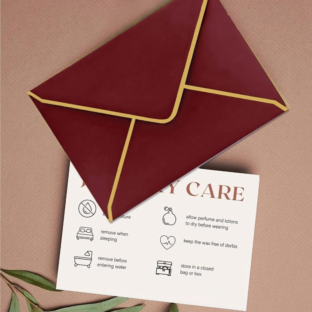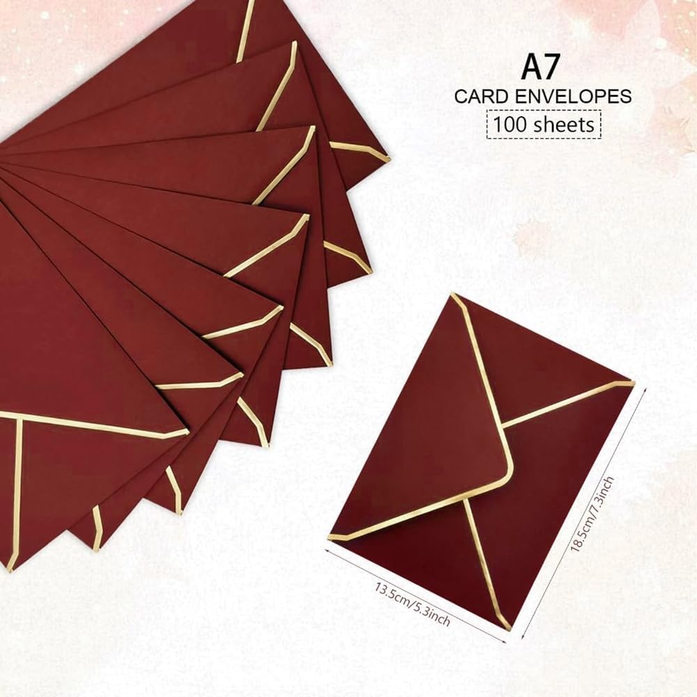 Convenient Quick Seal Closure: Featuring a V-flap design, these envelopes come equipped with a self-adhesive strip that . The quick seal feature saves time and hassle, allowing for efficient preparation of bulk mailings. Premium Quality Material: Crafted from superior card stock, these 100 burgundy invitation envelopes boast a luxurious gold border, enhancing the aesthetic appeal of your invitations. The rich color and elegant design make them ideal for high-end events and announcements. Ideal for Multiple Occasions: Whether you're planning a wedding, celebrating a graduation, or sending out holiday greetings, these envelopes cater to all your needs. Their versatility makes them suitable for any event where of is required. Perfectly Sized for Invitations: Each A7 envelope measures 5 x 7 inches, designed to fit standard 5x7 cards or invitations snugly. This size is not only practical but also commonly used, making it a versatile choice for various types of correspondence. Multi-Purpose: Premium Envelopes are great for personalizing gift cards, Christmas gift envelopes, party invitations, greeting cards, Christmas cards, business cards, and can also store small items like jewelry chains, beads, pendants, bracelets, earrings, photos, bobby pins, paper clips , coins, etc.