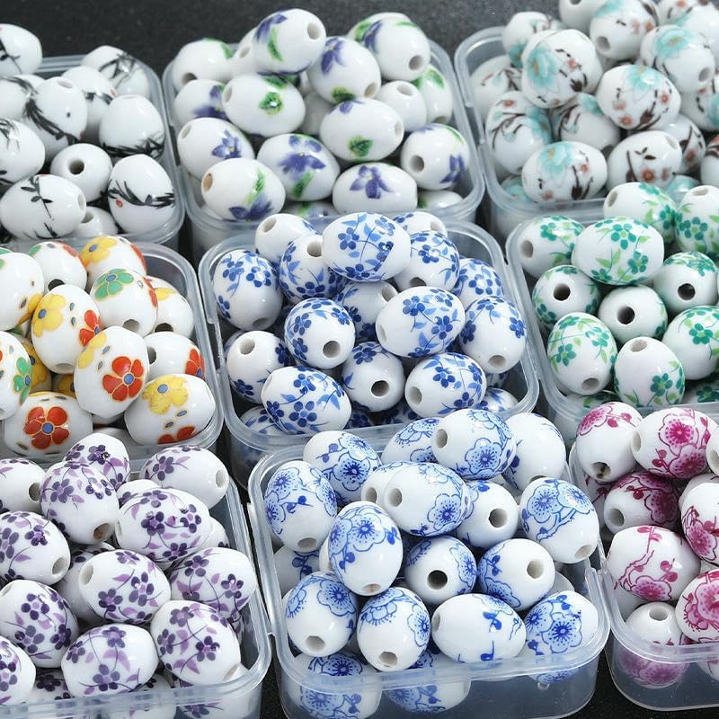 Perline sfuse in ceramica con stampa floreale e fori per un facile utilizzo, dimensioni perline: 12x15 mm, diametro del foro: circa 3 mm, 100 pezzi/confezione Queste perle in ceramica sono stampate con squisiti motivi floreali, i motivi sono retrò, affascinanti e squisiti e sono molto adatti per la creazione di perline Queste perle sono realizzate in ceramica, con il colore smaltato unico della porcellana, la superficie è lucida e liscia, non si rompe o sbiadisce facilmente ed è comoda da indossare Queste perle rotonde colorate in porcellana sono perfette per realizzare braccialetti, collane, orecchini, ciondoli, portachiavi, gioielli, lavori fai da te e decorazioni per la casa Queste perline sciolte in ceramica con stampa floreale sono perfette per essere utilizzate con cordini di cuoio, cordini di canapa, cordini intrecciati e altri materiali per perline per creare bellissimi braccialetti
