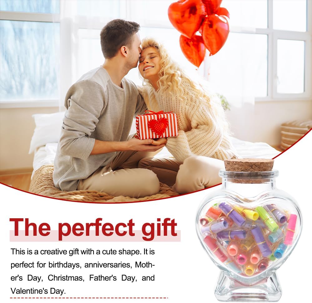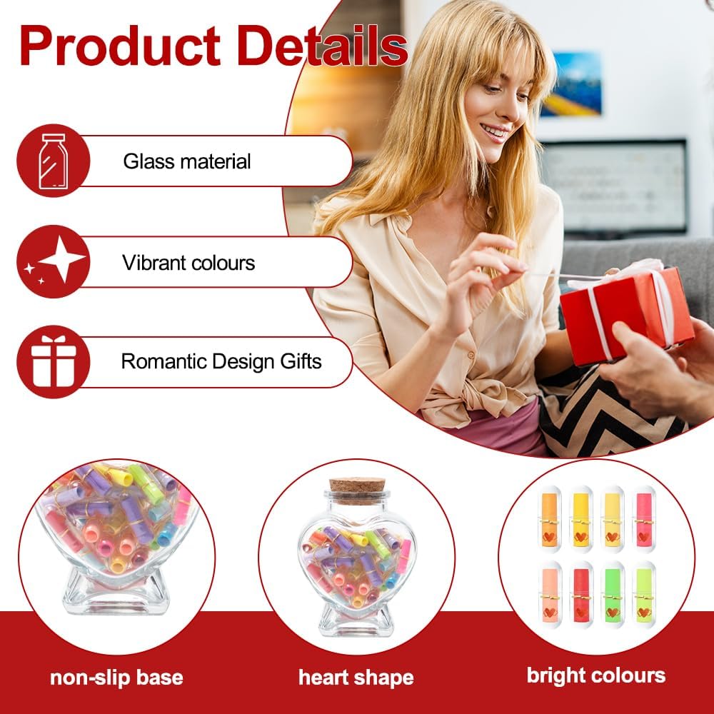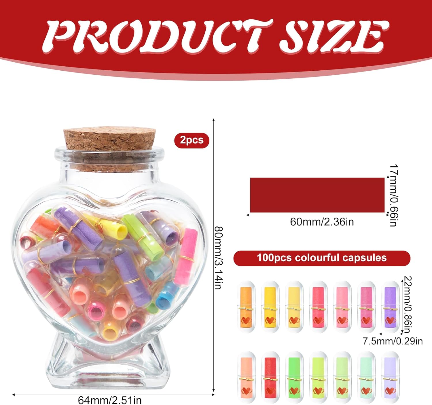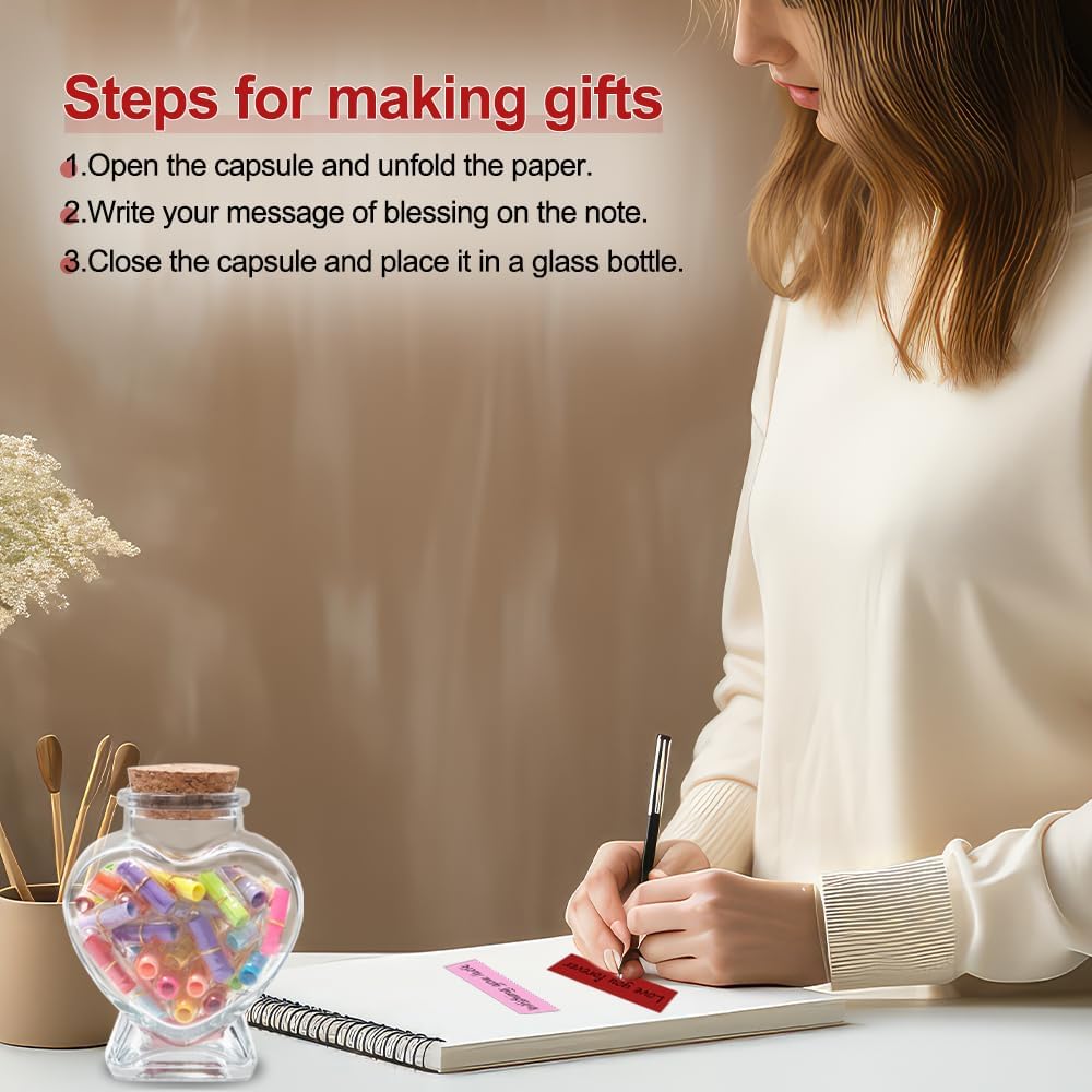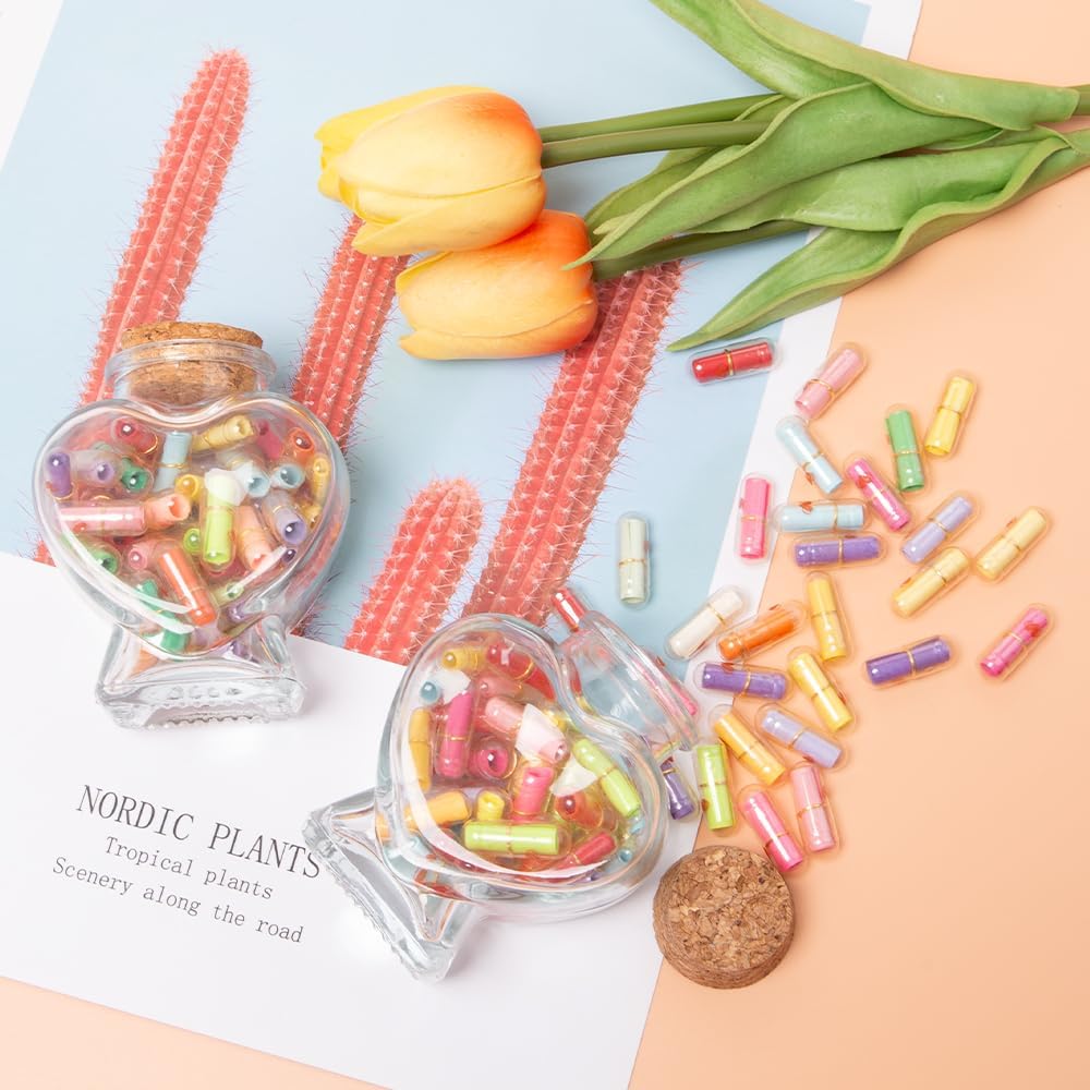 💖 Carino capsule con messaggio: 100 Capsule lettere messaggio + 2 flaconi di vetro a forma di cuore, i colori delle capsule sono casuali, sufficienti per le tue esigenze quotidiane 💖 Espressione significativa: se non hai il coraggio di esprimere il tuo amore e i tuoi sentimenti a qualcuno, piccolo capsule messaggio sono dotate di un foglio di carta bianca colorata all'interno su cui scrivere i tuoi pensieri 💖 Regalo creativo: Questo adorabile piccolo capsule lettere regalo è perfetto per compleanni, anniversari, festa della mamma, Natale, festa del papà, festa degli insegnanti e San Valentino 💖 Dimensioni: dimensioni della capsule : 21 x 7 mm, dimensioni della nota piccola: 10 x 0,3 cm. Facile da aprire e scrivere, scrivi i tuoi sentimenti e desideri 💖 Materiale: le capsule messaggio pillole sono realizzate in carta colorata, sicura, atossica e inodore. La carta è morbida e colorata e l'anello in metallo è robusto e resistente, rendendolo resistente e resistente alla rottura e allo sbiadimento