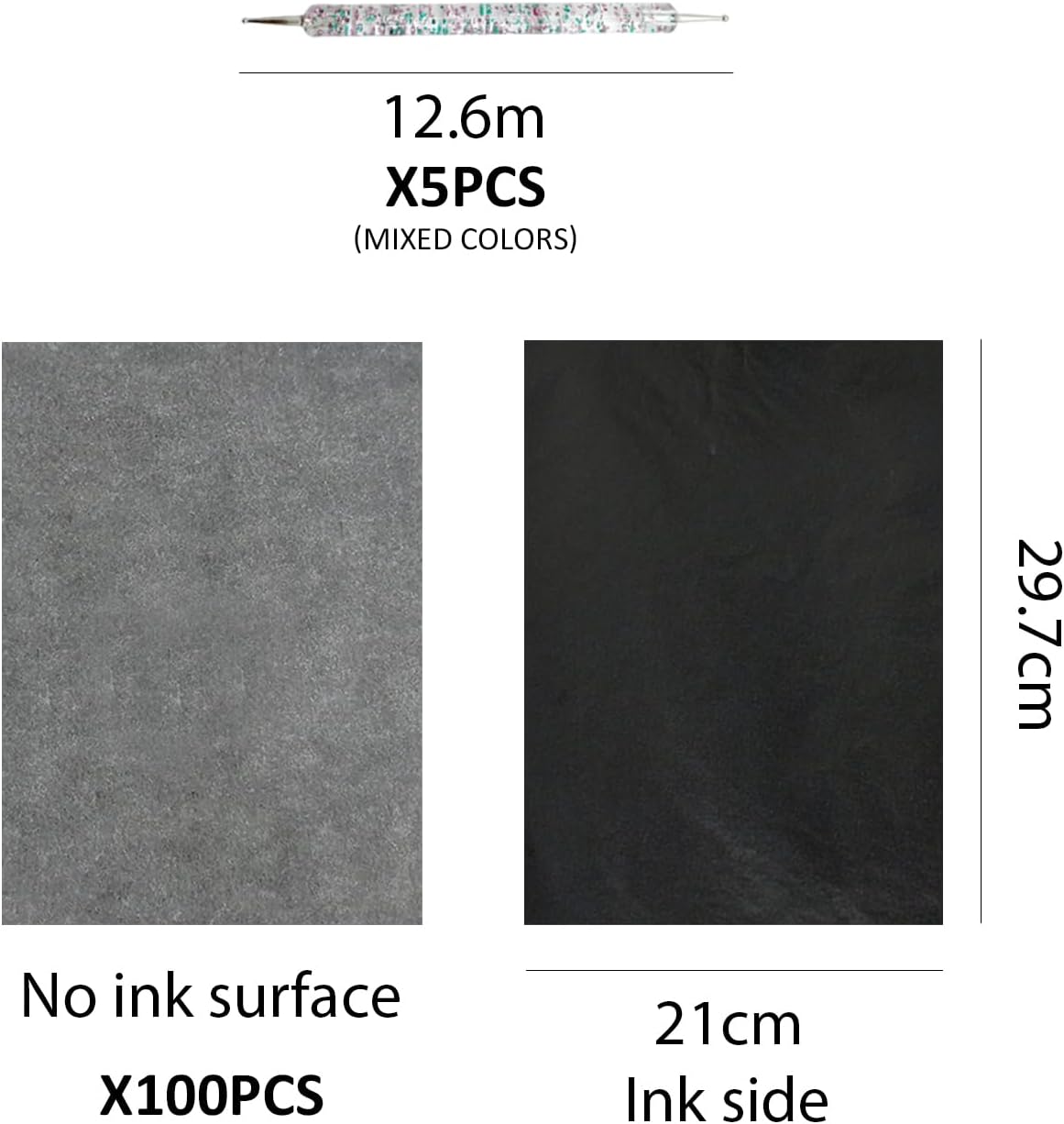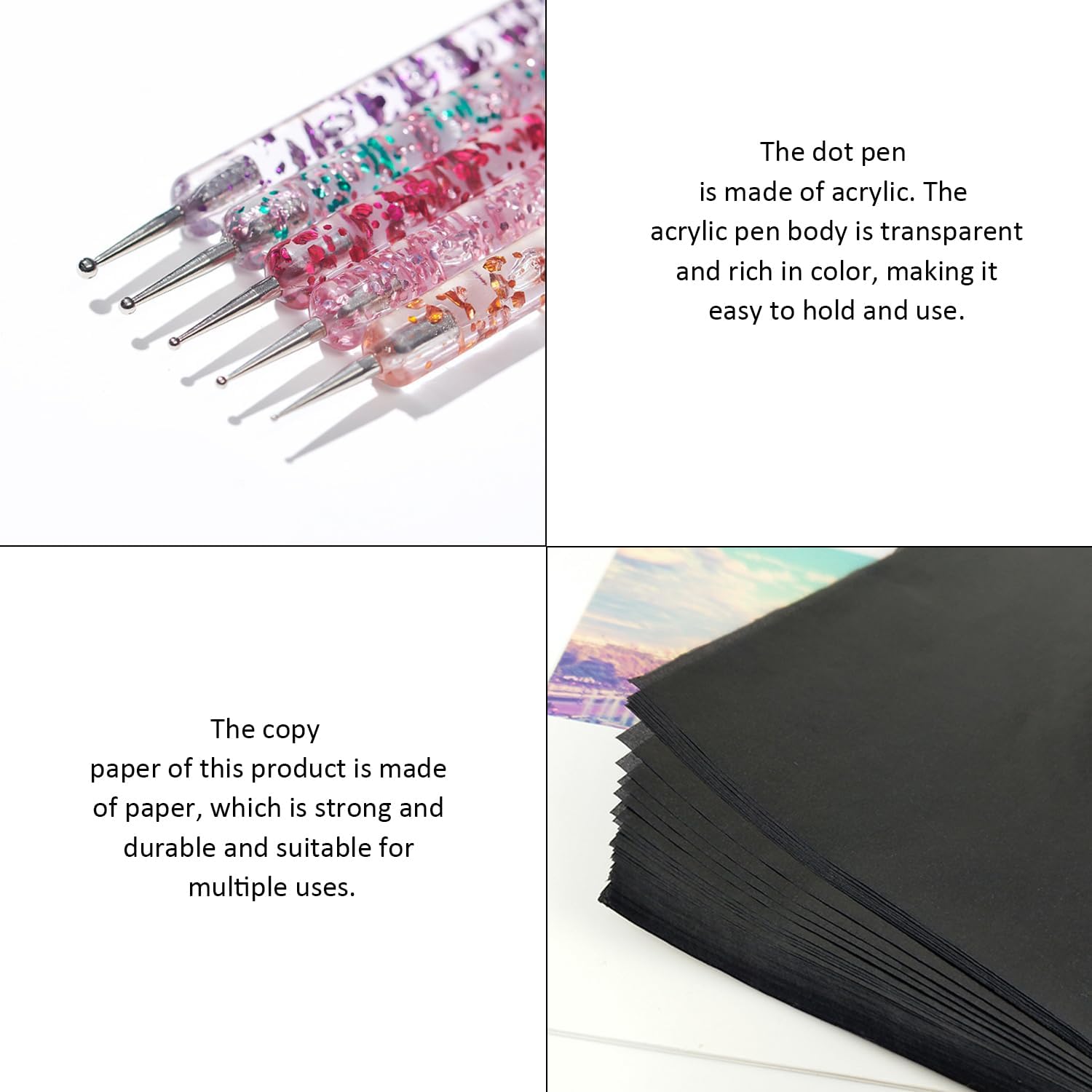 【Contenuto Del Prodotto】 Riceverai 100 Pezzi Di Carta Per Fotocopie E 5 Penne A Punti. La Dimensione Della Carta Da Copia È 21 X 29, 7 Cm E Il Colore È Nero. La Dimensione Della Penna A Punti È Di 12, 6 Cm E Il Colore È Misto. 【Materiale Del Prodotto】 La Carta Da Copia Di Questo Prodotto È In Carta E La Penna A Punti È In Acrilico. Il Materiale Cartaceo È Resistente E Durevole Ed È Adatto A Molteplici Scopi. Il Corpo Della Penna In Acrilico È Trasparente E Colorato, Il Che La Rende Facile Da Tenere E Utilizzare. 【Ampia Applicazione】 Questo Prodotto È Molto Adatto Per Ufficio, Studio E Creazione Artistica. La Carta Carbone Può Essere Utilizzata Per Copiare E Trasferire Documenti E Le Penne A Punti Sono Adatte Per La Pittura A Punti E Altri Progetti Artigianali Per Soddisfare Varie Esigenze Creative. 【Design Pratico】 La Carta Carbone È Di Forma Rettangolare, Di Medie Dimensioni E Facile Da Usare. La Penna A Punti Ha Un Design Leggero, Una Punta Sottile Per Un Facile Utilizzo, Colori Brillanti Ed È Facile Da Pulire E Riporre Dopo L'Uso. 【Set Di Valori】 Questo Articolo Contiene Una Grande Quantità Di Carta Carbone E Penne A Punti Multicolori, Che Lo Rendono Ideale Per Il Lavoro D'Ufficio E La Creazione Artistica. È Conveniente E Può Soddisfare Le Esigenze Di Utilizzo A Lungo Termine. È Uno Strumento Pratico Per Tutti I Tipi Di Utenti.