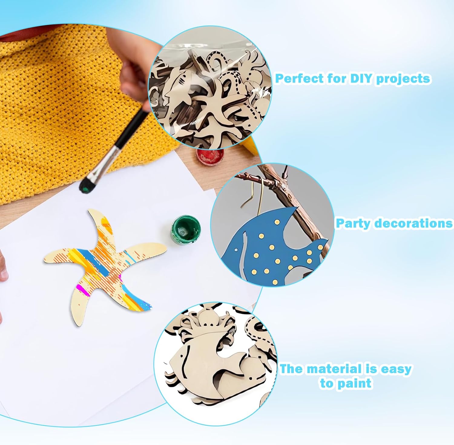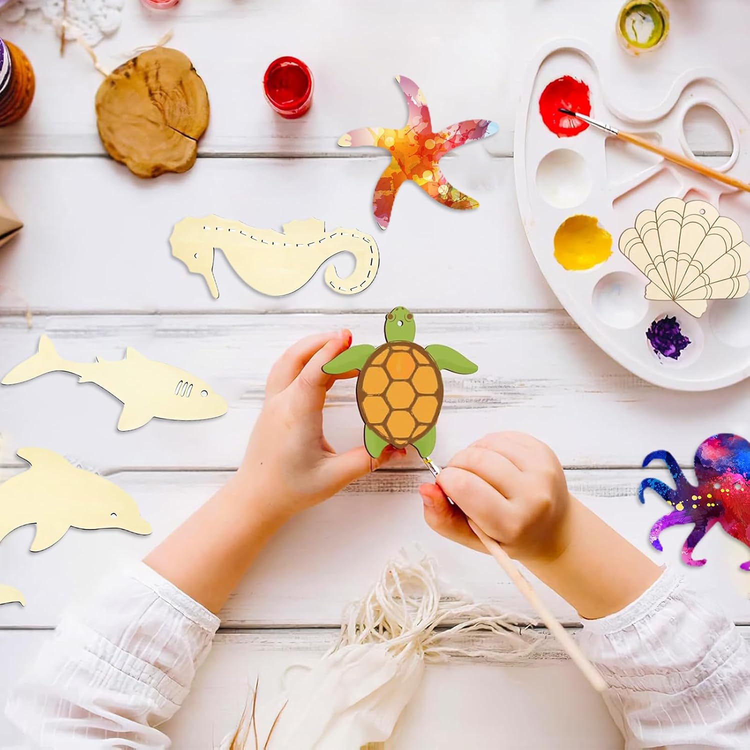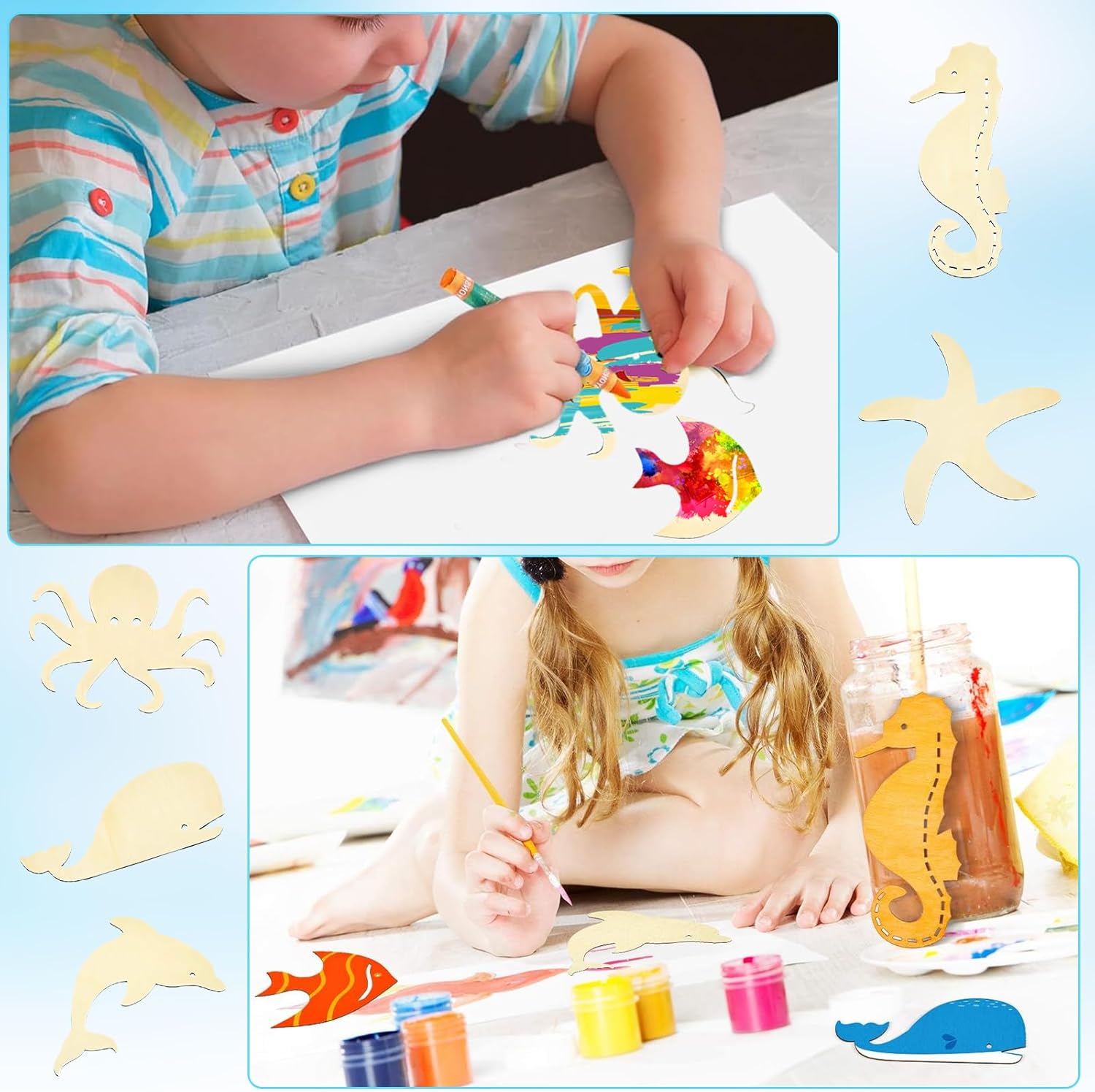 Materiali sicuri: il set di legno decorazione kit creativo con animali marini è realizzato in legno naturale di alta qualità, atossico, inodore, leggero e resistente. La superficie è finemente lucidata e priva di sbavature, consentendo ai bambini di dipingere e applicare con sicurezza, offrendo ai genitori maggiore tranquillità Set completo: il set di ciondoli in legno da di pingere con animali marini include due confezioni da 50 vassoi rotondi in legno naturale (circa 2,5 cm di diametro) con 7 motivi di vita marina. Entrambi i lati sono vuoti, offrendo ampio spazio per molteplici creazioni Creatività stimolante: i v3d legno creativi per bambini presentano pezzi di legno vuoti a doppia faccia che possono essere dipinti, tinti, goffrati o decorati con strass. Abbinati a piastrelle trasparenti a tema marino, i vassoi in legno sono disponibili anche in abbinamento. I contorni degli animali marini (balene, tartarughe, polpi, ecc.) stimolano la percezione dei colori e le capacità manuali dei bambini, raddoppiando il divertimento della collaborazione genitore-figlio Usi multipli: il kit legno pittura bambini con animali marini può essere utilizzato come soprammobile da appendere, decorazione per feste o centrotavola creativo. È perfetto per compleanni,camerette e feste a tema. È un regalo ideale per i bambini durante le vacanze, soddisfacendo le loro esigenze creative e permettendo loro di godersi la gioia dei lavoretti fatti a mano Creazioni fai da te: il lavoretti in legno per bambini con animali marini stimola la concentrazione e l'immaginazione dei bambini attraverso divertenti lavoretti. Usa pennarelli acquerellabili e adesivi glitterati per sviluppare le capacità motorie fini. La creazione finita può essere appesa ed esposta per un senso di realizzazione. È perfetto per la scuola, la casa o le attività estive