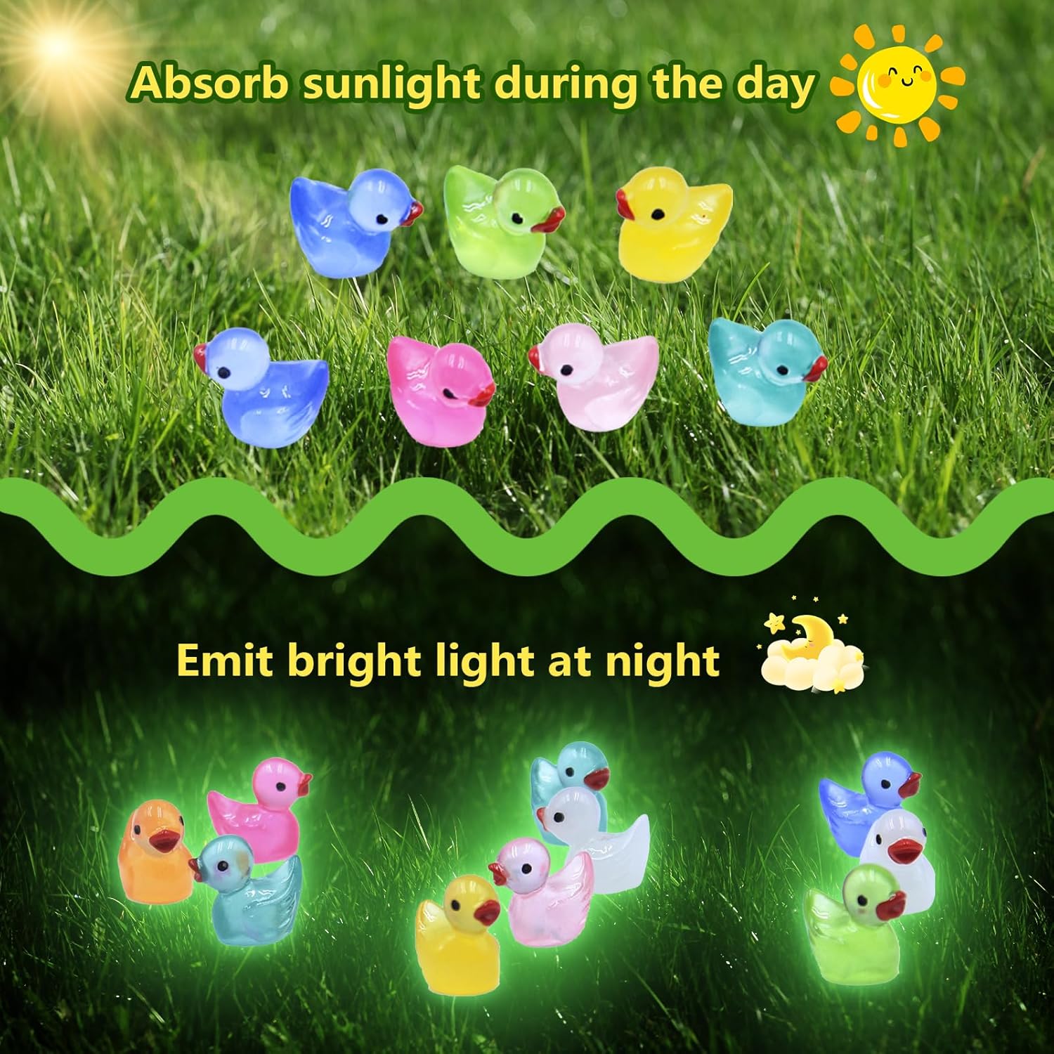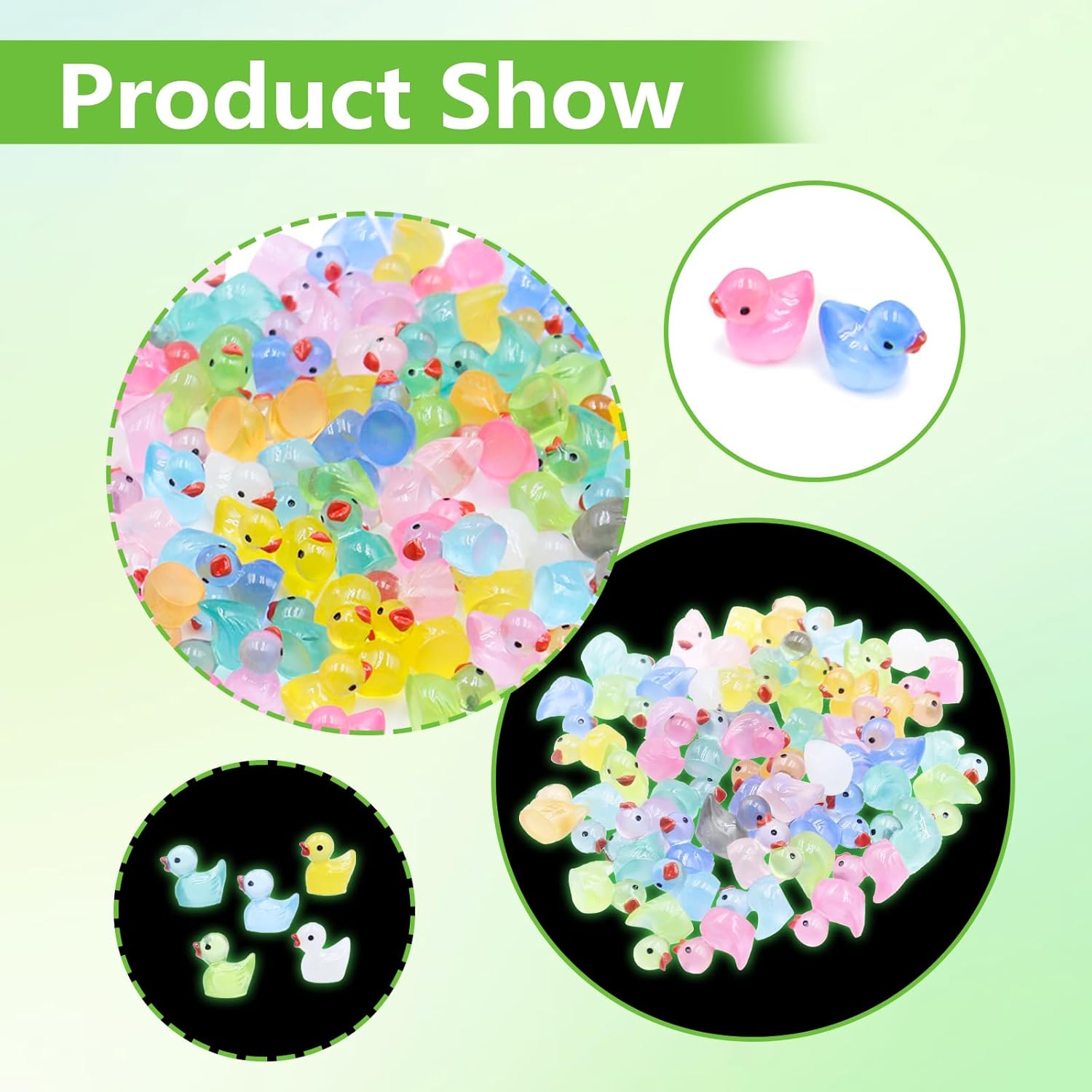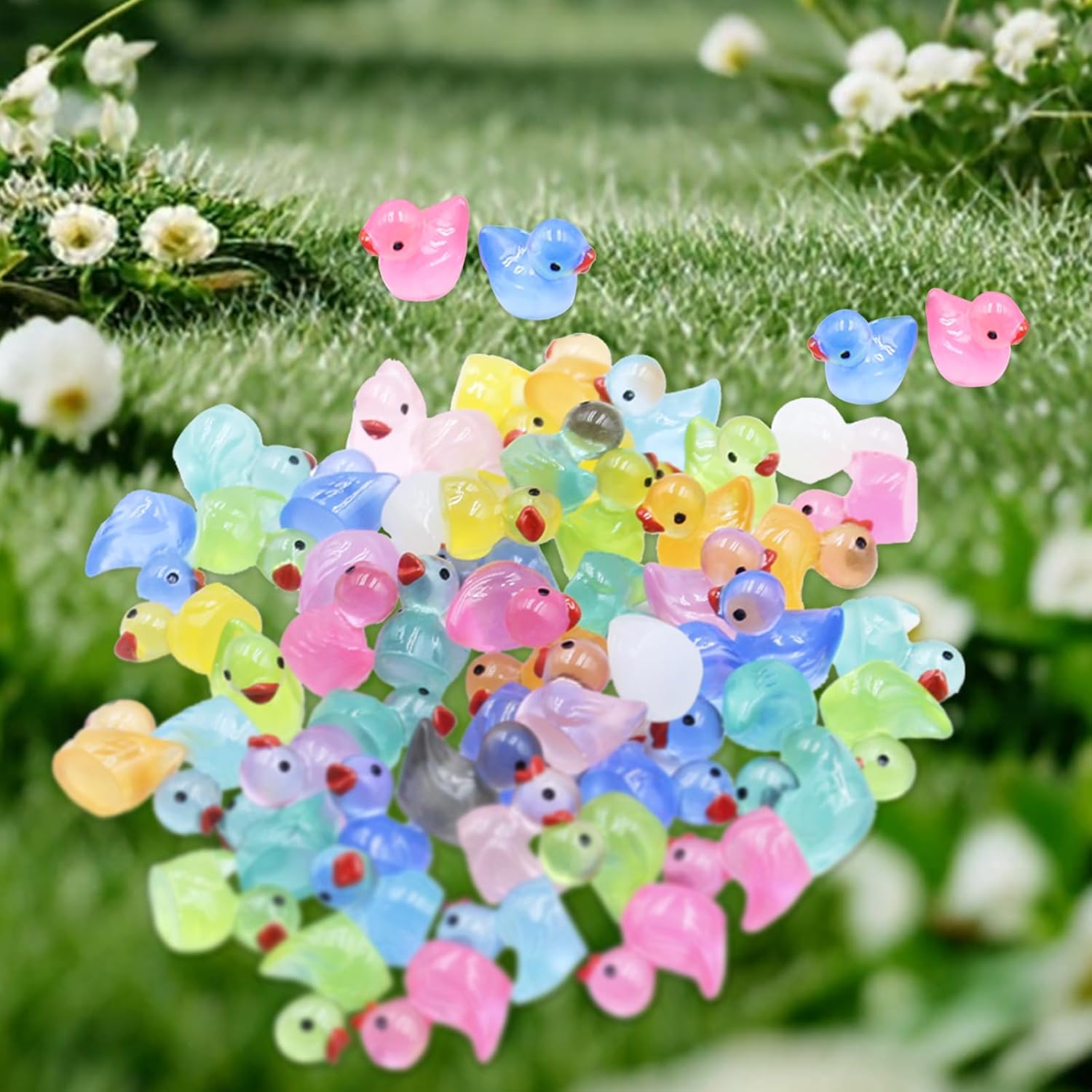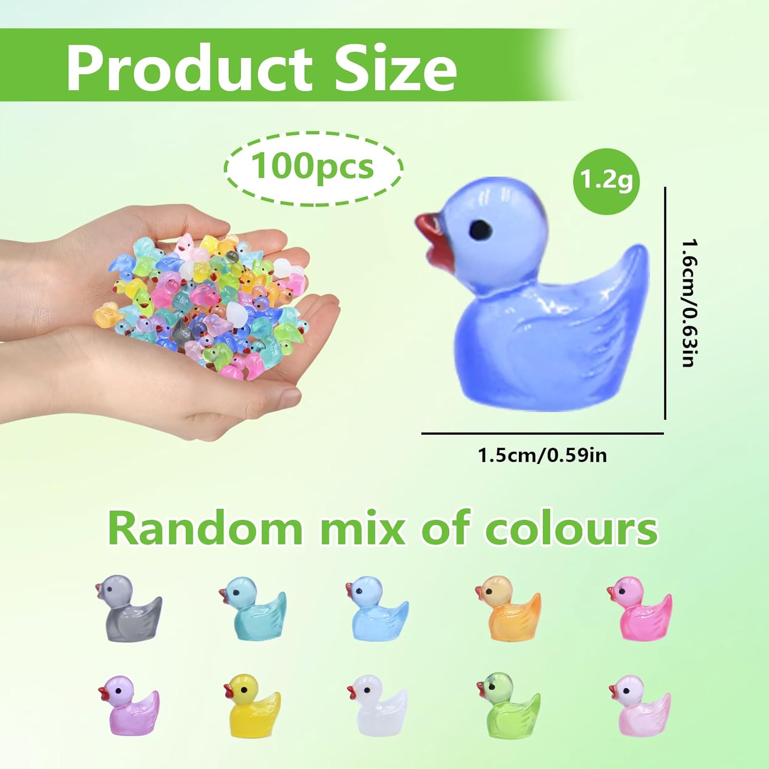 【100 mini anatre colorate in 10 colori】Avete 100 adorabili mini anatre in resina in 10 colori diversi. Queste piccole anatre sono perfette per progetti creativi, decorazioni o come regalo. 【Effetto luce notturna unico】Le nostre mini anatre si illuminano al buio! Si caricano alla luce durante il giorno ed emettono un tenue bagliore di notte: un effetto magico per qualsiasi ambiente. 【Materiale in resina di alta qualità e durevole】 Le mini figure in resina sono realizzate in resina ecologica e impermeabile. Resistenti e robuste - ideali per decorazioni interne ed esterne. 【Pratico formato mini (1,6x1,1x1,5 cm)】Le 100 mini anatre sono compatte, leggere e dettagliate. Perfette per essere conservate e portate con sé. (Nota: non adatte a bambini di età inferiore a 3 anni) 【Vari usi】Sia per acquari, paesaggi in miniatura, decorazioni per l'ufficio, lezioni o come giocattoli - queste 100 piccole anatre portano gioia e creatività ovunque!