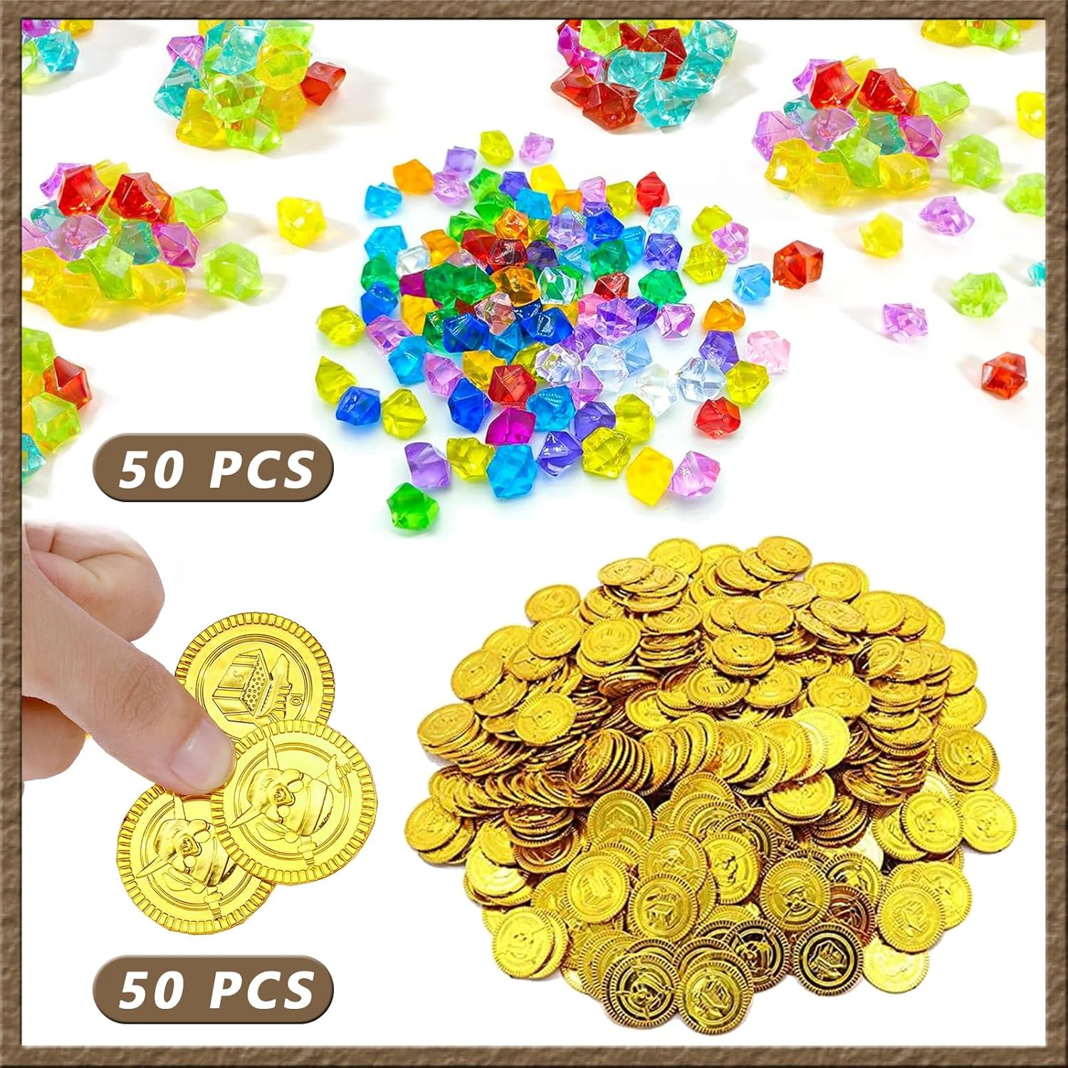 Set di 100 monete d'oro per il tesoro dei pirati: riceverete 50 monete d'oro per bambini, 50 pietre preziose per bambini, per soddisfare il vostro regalo di festa e condividere le vostre esigenze, rendendo il vostro compleanno dei bambini dei pirati reale e interessante Materiale di alta qualità: le monete d'oro sono realizzate in plastica ecologica, con finitura lucida e le gemme in acrilico di alta qualità. Le monete d'oro in spiaggia sono durevoli e sicure da usare, robuste e non tossiche, perfette per decorazioni per feste e giochi per bambini Pietre preziose per feste di compleanno per bambini: ogni accessorio contiene ricchi elementi pirati con dettagli squisiti e colori vivaci. Queste monete d'oro in plastica hanno un motivo a teschio pirata in rilievo, affascinante e brillante; le false gemme dei pirati brillano in colori vivaci, sono delicate e avventurose e completano altri tipi di decorazioni con motivi pirati Ampia gamma di utilizzi: questo set di gioielli può essere utilizzato anche per riempire la decorazione della casa con personaggi luminosi, paesaggistici per acquari, giocattoli da palcoscenico, nonché idee per costumi da pirata, sfondi di film, tesori, sacchetti di caramelle, un bel regalo per feste, decorazioni e prezzo. Il bell'aspetto e la buona qualità portano un'esperienza eccellente per tutti voi Ideale per accessori per feste: queste monete e gioielli del tesoro dei pirati possono essere utilizzati per feste di compleanno dei pirati, feste di Halloween, feste di compleanno, caccia al tesoro d'oro, giochi di ruolo pirata, oggetti di scena per spettacoli sul palcoscenico, carnevale, decorazione da tavola, scrigno del tesoro, ecc