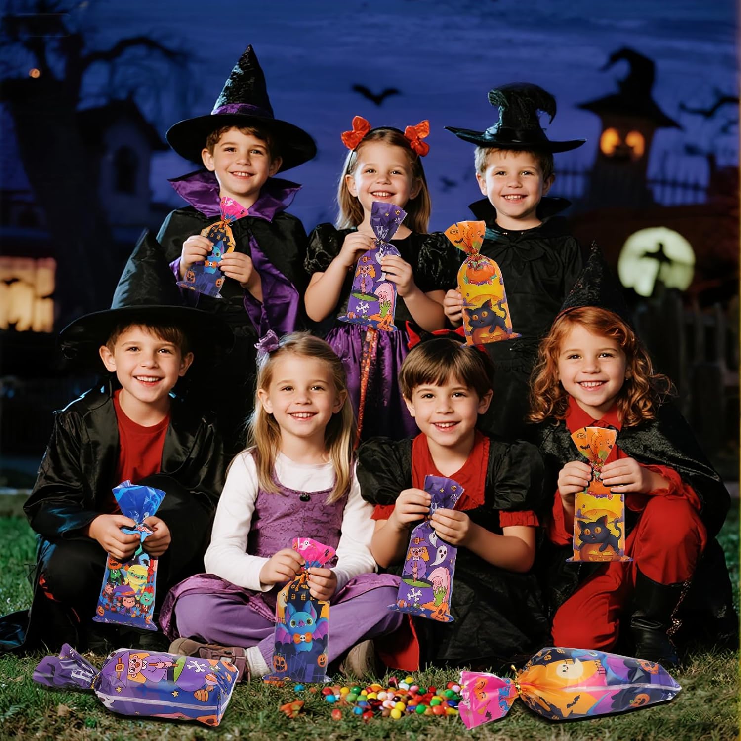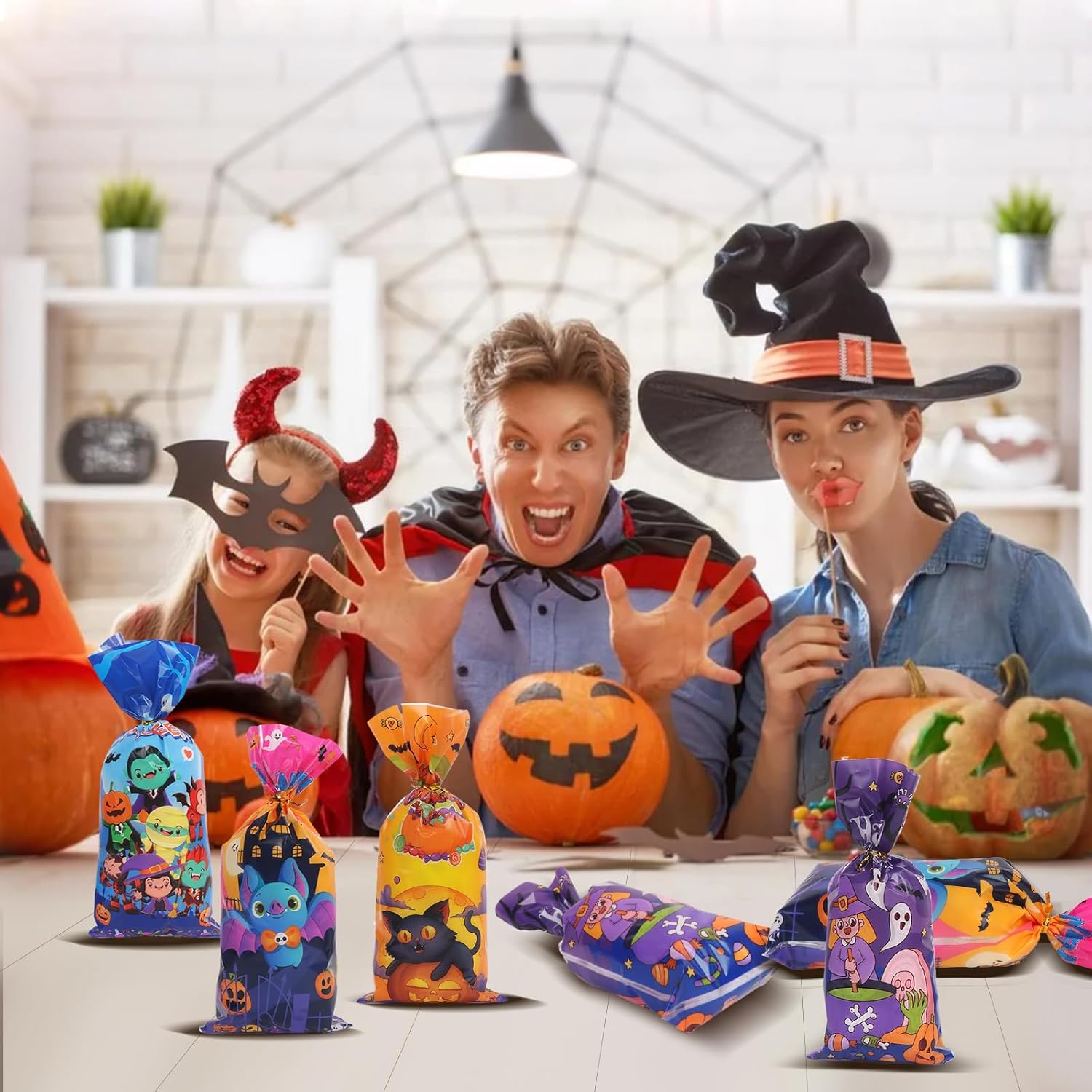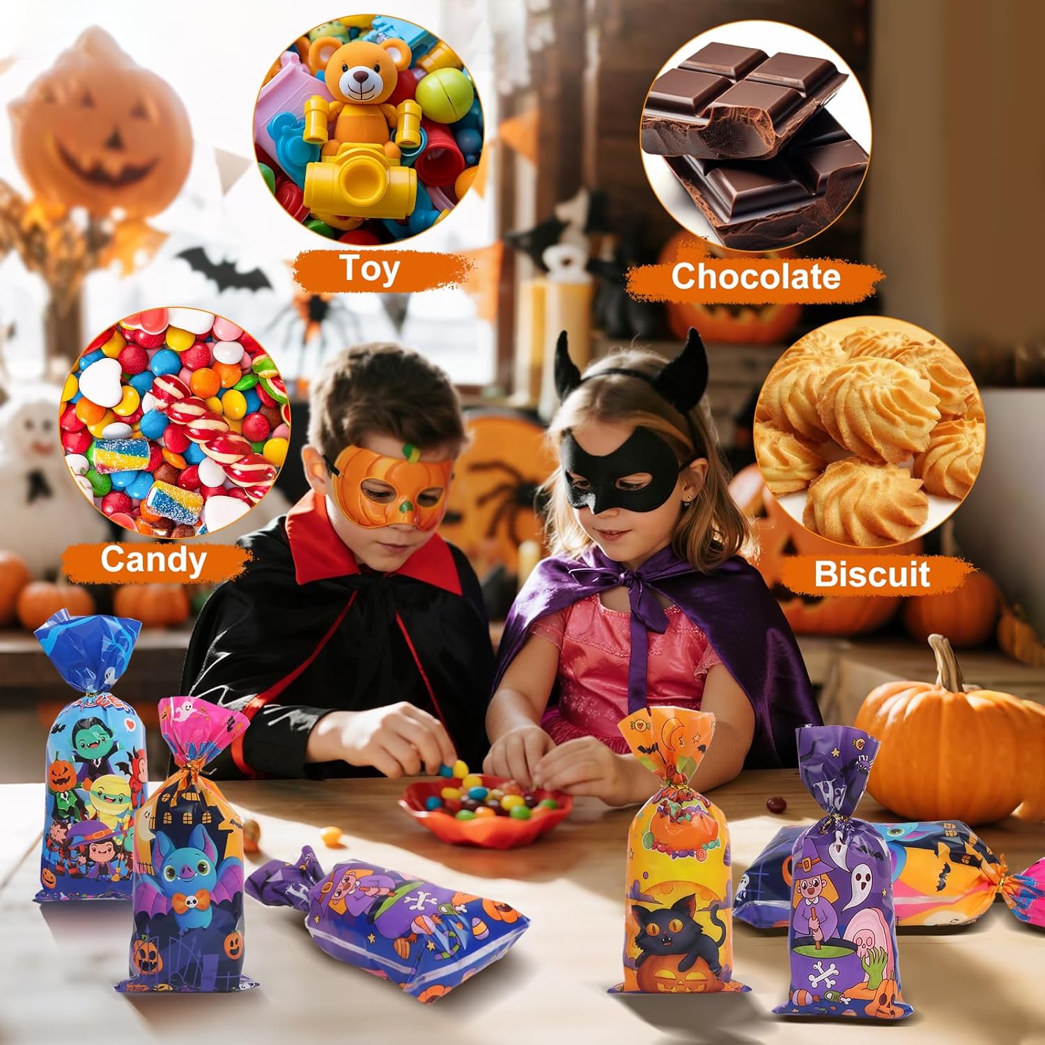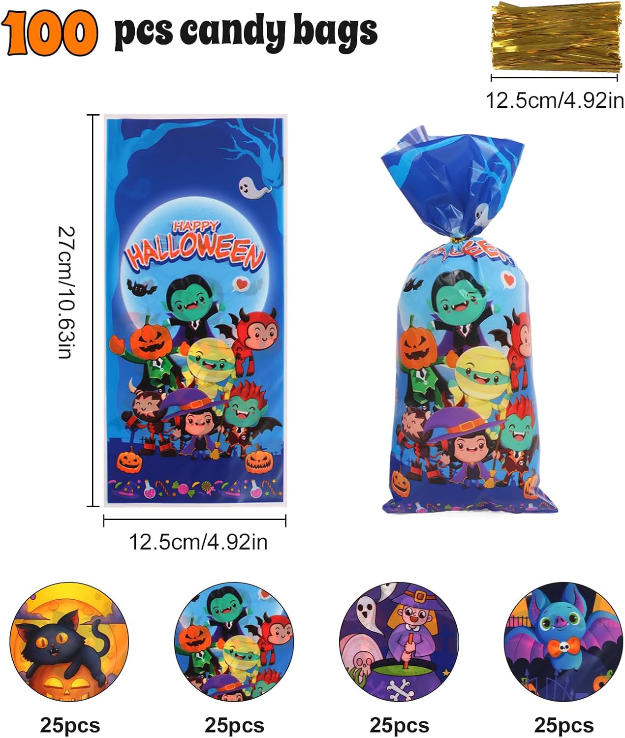 100 sacchetti di caramelle di Halloween: un set di 100 sacchetti di cellophane di Halloween richiudibili con cinghie di imballaggio dorate per una facile apertura e servizio Dimensioni: i sacchetti di Halloween misurano circa 12,5 x 7 cm e sono adatti per biscotti, caramelle, pane, gomme da masticare, snack, dessert, ecc. Materiale ecologico: i sacchetti di caramelle di Halloween sono realizzati in polipropilene, che soddisfa gli standard di sicurezza alimentare; Sono atossici, resistenti agli strappi e riutilizzabili Design versatili: questi sacchetti di caramelle autoadesivi di Halloween sono stampati con 4 design festivi tra cui zucche, pipistrelli, fantasmi e altri design stagionali che delizieranno i bambini e li renderanno ancora più divertenti da collezionare. Regalo perfetto: i sacchetti regalo di Halloween non sono ideali solo per dolcetto o scherzetto e aggiungono stile e divertimento alle feste di Halloween, ma possono anche essere utilizzati a casa, a scuola, nelle panetterie e molto altro ancora.
