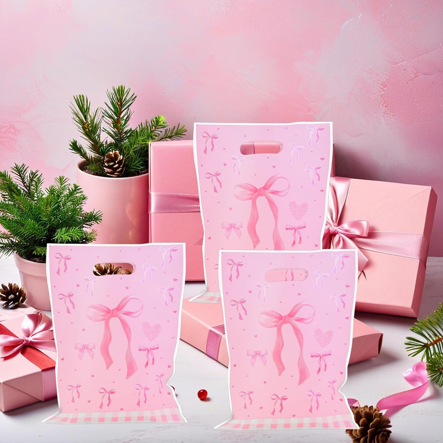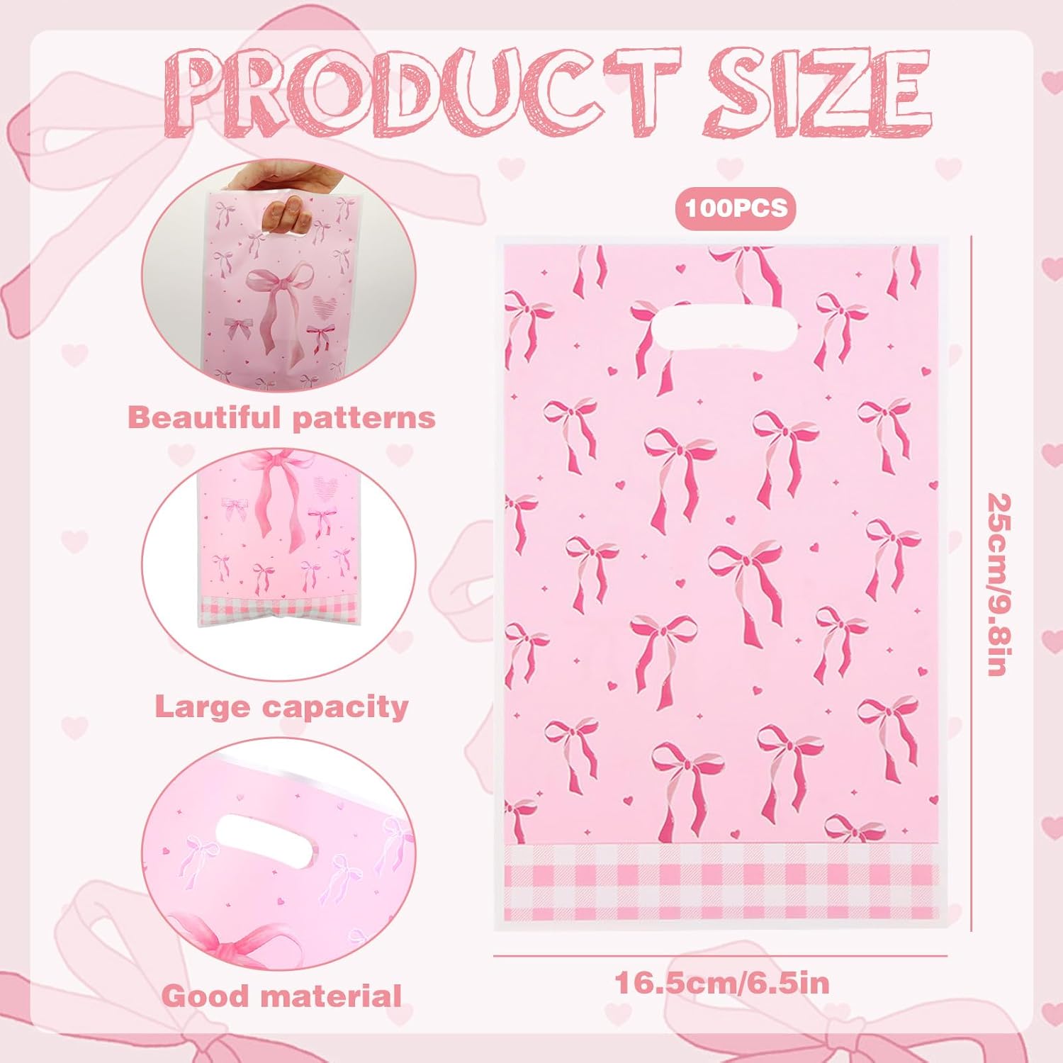 【Materiale di alta qualità】 Questo sacchetto regalo rosa è realizzato in plastica resistente e può sopportare un certo peso. Grazie all'alta qualità della nostra borsa con nastro rosa, potrai usarla a lungo e senza preoccupazioni. La dimensione della borsa con fiocco rosa è moderata e facile da trasportare, il che ti offre grande comodità. Offre spazio per molti piccoli oggetti ed è molto resistente. 【Caratteristiche】La borsa con fiocco rosa colpisce per il suo design con un cuore femminile e un colore dolce e bellissimo. Non importa quale sia l'occasione, la borsa con fiocco attira l'attenzione. È alla moda e bello allo stesso tempo e mette in risalto il tuo gusto e il tuo temperamento. È stampato con vari fiocchi, cuori e altri motivi, trasuda romanticismo e dolcezza e colpisce per il suo design. 【Facile da usare】 Questo sacchetto di caramelle rosa è facile da usare e offre un'esperienza eccezionale. Sono adatti per confezionare regali e come decorazioni per feste. Ad esempio, per incartare regali di compleanno, gioielli e altri regali, è sufficiente inserirli nella borsa. Come decorazioni per le feste, possono ravvivare l'atmosfera della festa o confezionare piccoli regali e distribuirli agli ospiti. 【Ampie applicazioni】 I nostri sacchetti di caramelle per bomboniere sono versatili e adatti per occasioni romantiche, suggestive e felici come feste di compleanno, matrimoni, San Valentino, addii al nubilato, addio al nubilato, lauree, ecc. Questo sacchetto di plastica rosa con fiocco è particolarmente adatto come confezione regalo per donne come fidanzate, madri e amiche. Può essere utilizzato come sacchetto regalo, ma anche come sacchetto regalo. 【Pacchetto incluso】Riceverai 100 sacchetti rosa con fiocco. I nostri prodotti sono versatili. Puoi regalarli agli amici bisognosi per rafforzare l'amicizia ed enfatizzare i sentimenti. Se hai domande sulle nostre borse da festa rosa durante l'uso, faccelo sapere. Risolveremo il problema il più rapidamente possibile. Speriamo sinceramente di offrirti un'esperienza piacevole.