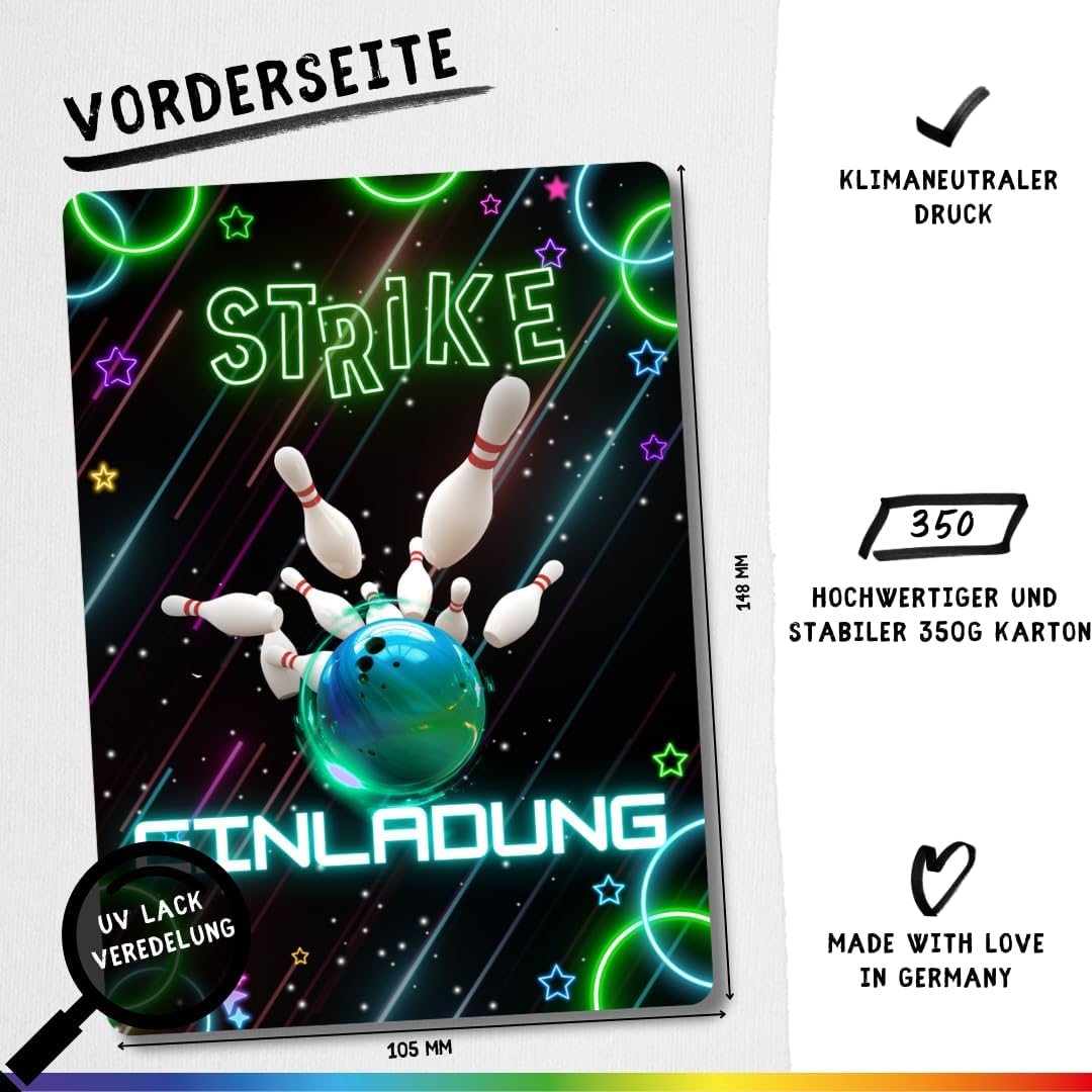 🎳 BOWLING MOTIV - Per tutti gli amici del bowling che amano questo sport! Ispira tutti gli ospiti del compleanno con questo fantastico design. 🎳 FACILE E VELOCE DA COMPILARE - Compilato molto facilmente grazie ai campi forniti! Ciò significa che anche gruppi più grandi di bambini possono essere invitati in modo rapido e semplice! 🎳 MATERIALE DI ALTA QUALITÀ - stampato su robusta carta da 350 g. La parte anteriore ha una finitura lucida, mentre la parte posteriore è scrivibile con tutte le penne standard! 🎳 ECCO COSA RICEVERAI - 11 biglietti d'invito per bowling, stampati di alta qualità in formato cartolina DIN A6 (148 x 105 mm). Made in Germany – stampato in modo ecologico. 🎳 BUSTE + ADESIVI + BORSE - Offriamo set di diverse dimensioni. Espandi i tuoi biglietti d'invito con buste, adesivi coordinati e sacchetti souvenir!