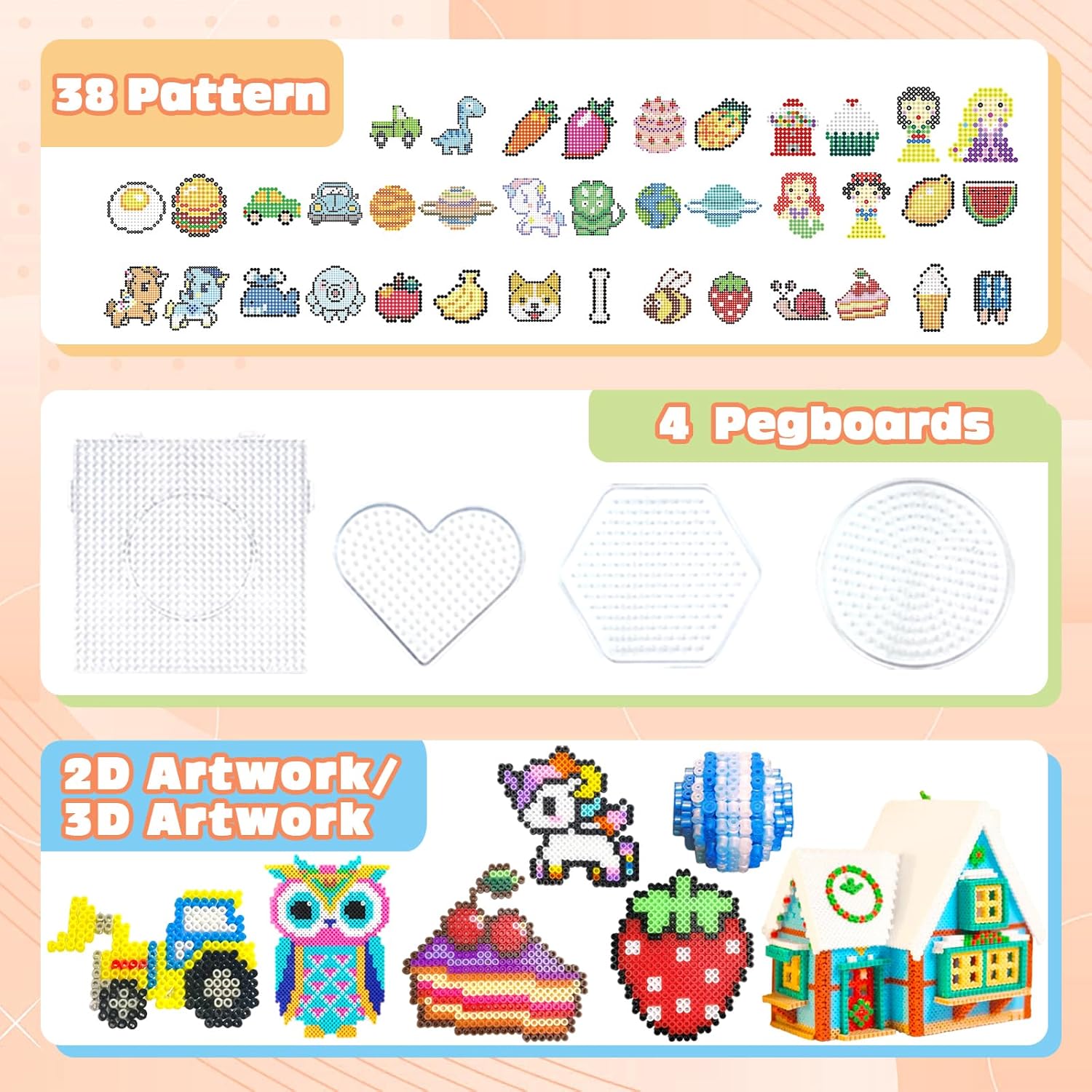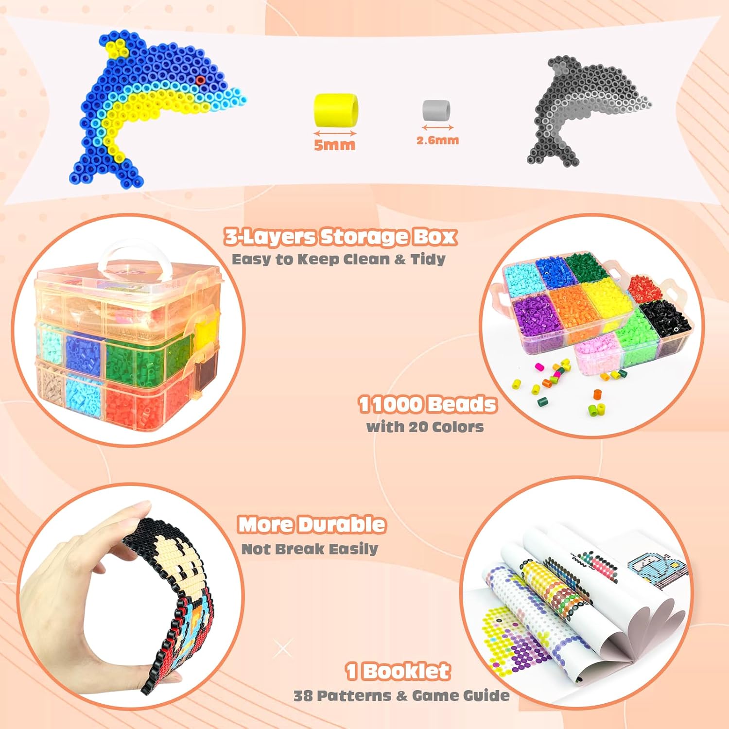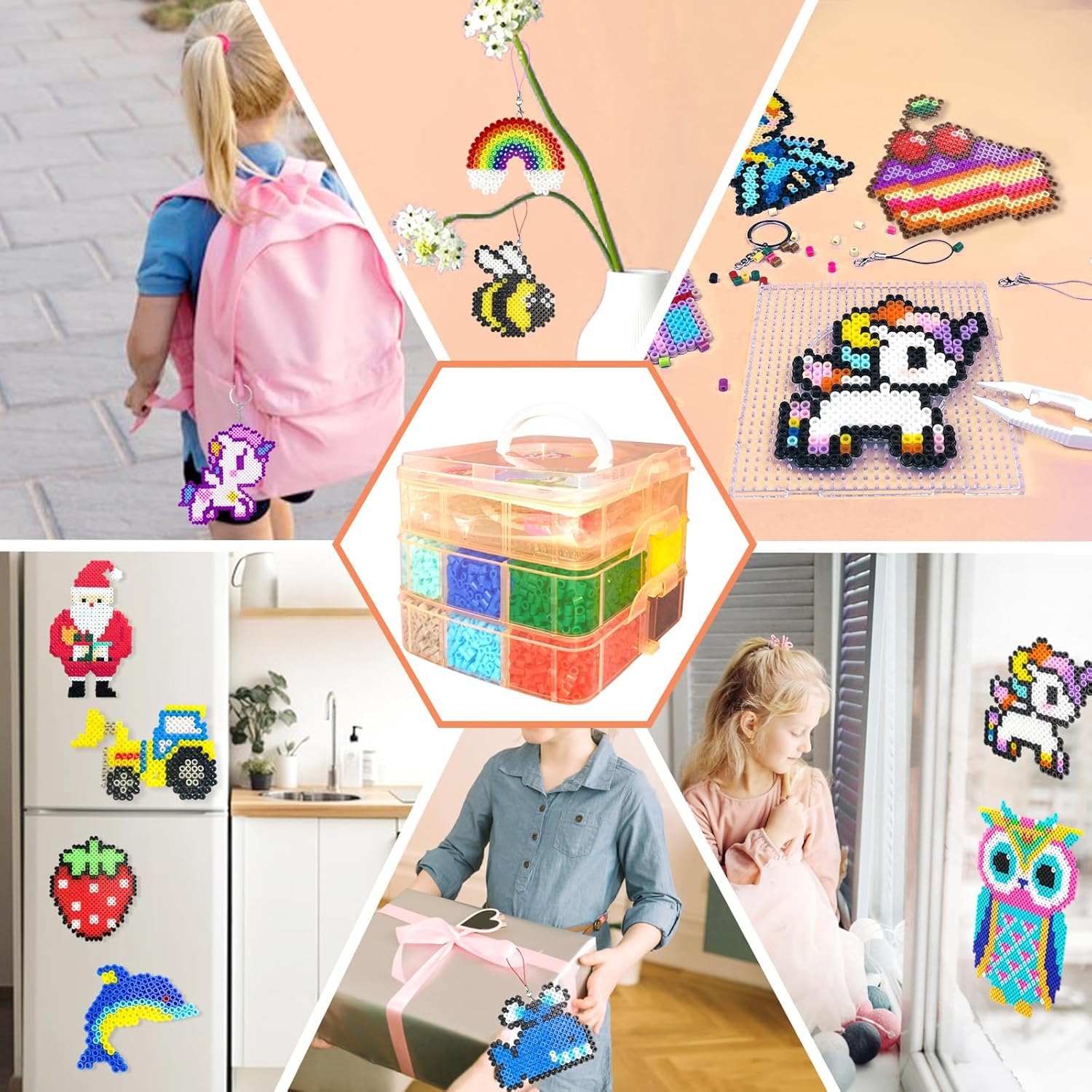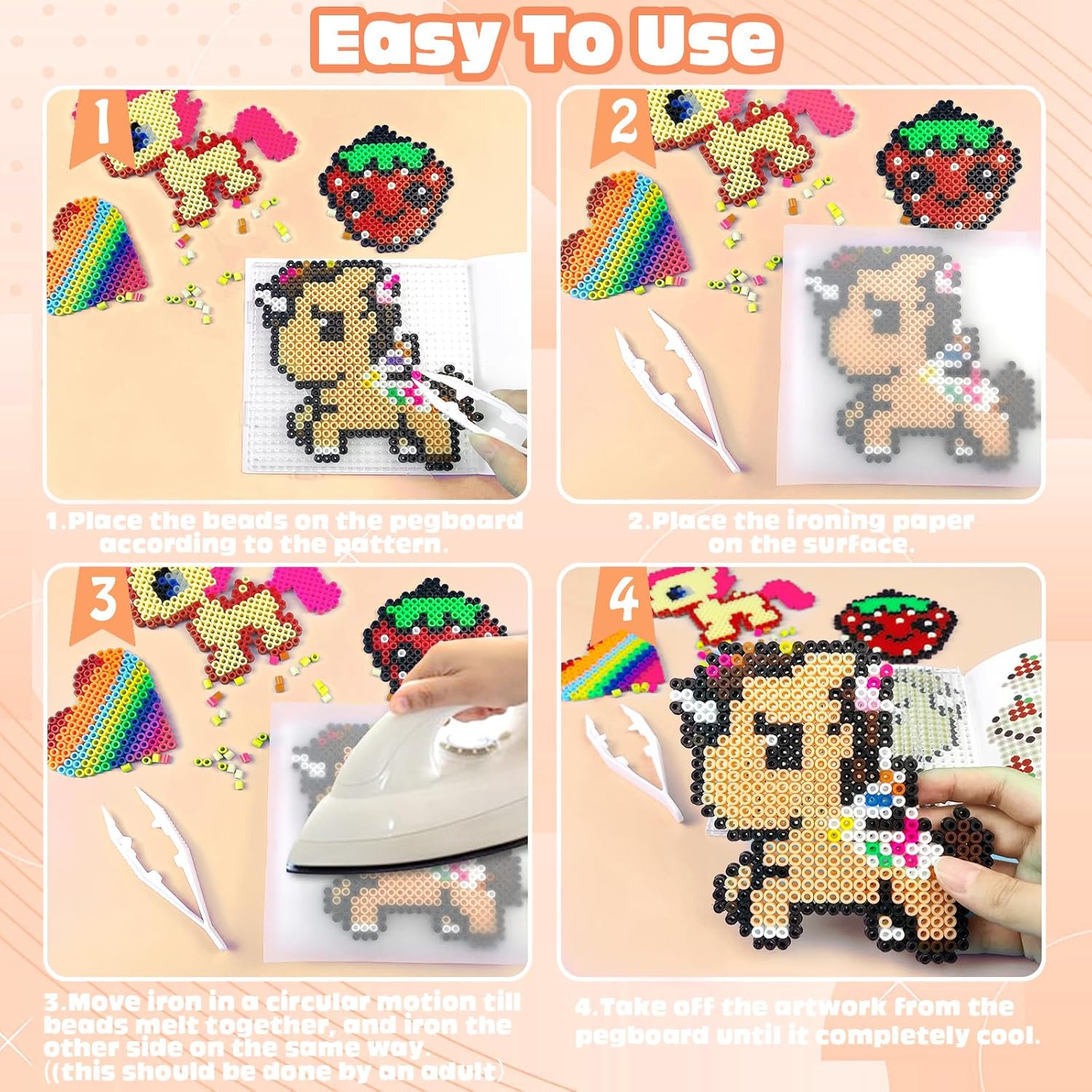 Kit completo di Perline da Stirare: Questo kit contiene 11000 perline in 20 colori diversi, 4 piastre per perline (esagono, quadrato, cuore, cerchio), 5 carte da stiro, 2 pinzette, 5 portachiavi, 5 ganci di plastica, 5 cordini di metallo, 1 opuscolo, scatola di immagazzinaggio Triplo Scatola Portaoggetti: Il set di perline da stirare di ferro viene fornito con una scatola di immagazzinaggio che mantiene facilmente il kit di perline in ordine, organizzato e conveniente per la selezione dei colori, e il manuale di istruzioni incluso. Un eccellente mestiere e regalo per i bambini, che possono anche migliorare la loro abilità manuale, la concentrazione e la pazienza, e state certi che lo adoreranno! Regalo ideale per il kit di artigianato: Il nostro kit di perline da stirare artigianali è il regalo perfetto per le ragazze e i ragazzi che amano fare i propri mestieri. Questo kit di perline viene fornito con una squisita confezione regalo, perfetta per compleanni, Natale o qualsiasi altro regalo di Natale per bambini di età superiore ai 5 anni. Regali di artigianato ideali per bambini di età compresa tra 6 -12 anni Creatività illimitata: Queste kit di perline da stirare possono distogliere l'attenzione del bambino dall'elettronica e concentrarsi sull'attività artigianale, e si può completare un mestiere fatto a mano con i bambini in un'attività familiare. Si tratta di un'eccellente attività artigianale che stimola la creatività e l'immaginazione del bambino, oltre a fornire a voi e al vostro bambino un ottimo ricordo! Alta qualità: Il nostro set di perline da stirare artigianali è realizzato con materiali di alta qualità, non facili da rompere. Perline di fusione da 5 mm, più grandi di quelle comuni e più facili da raccogliere. Si prega di assicurarsi che un adulto gestisca o guidi la fase di stiratura.