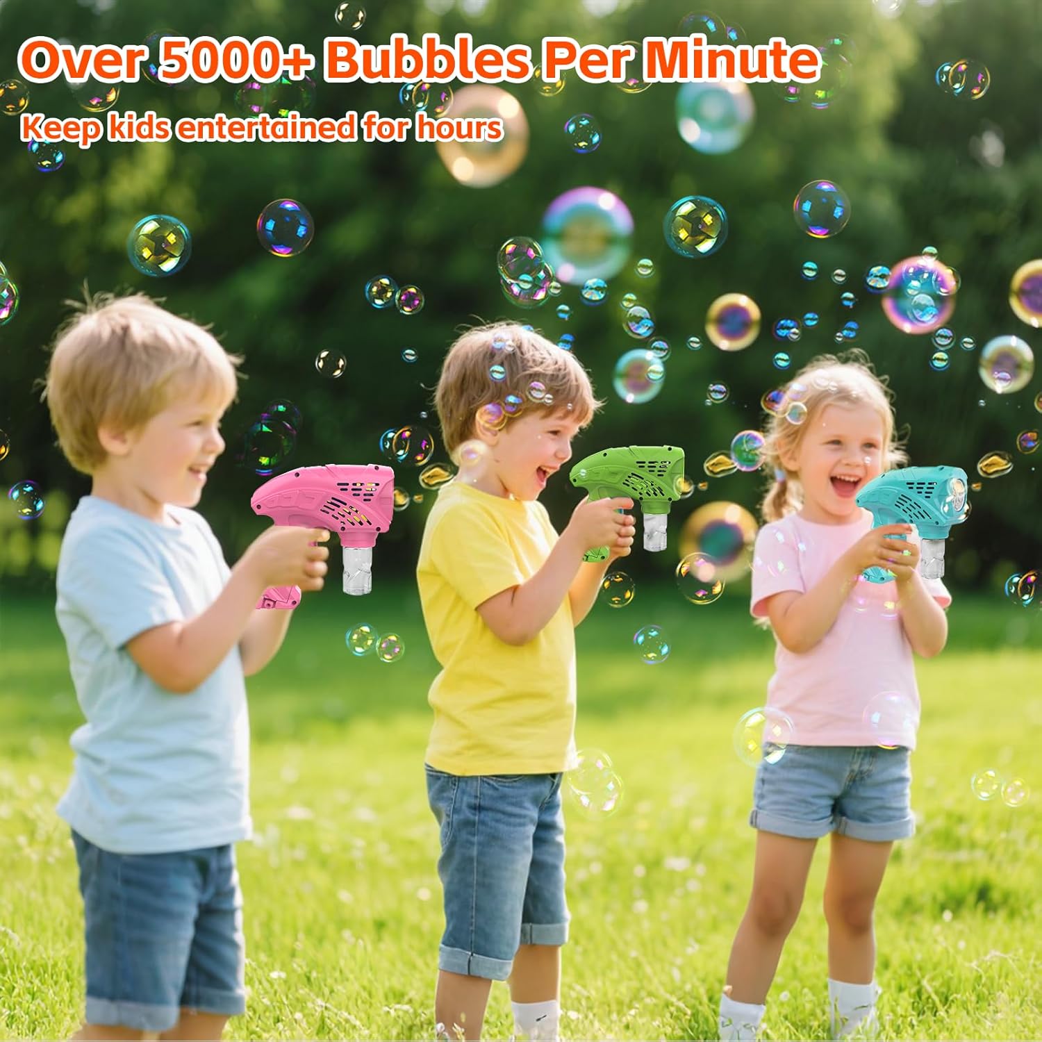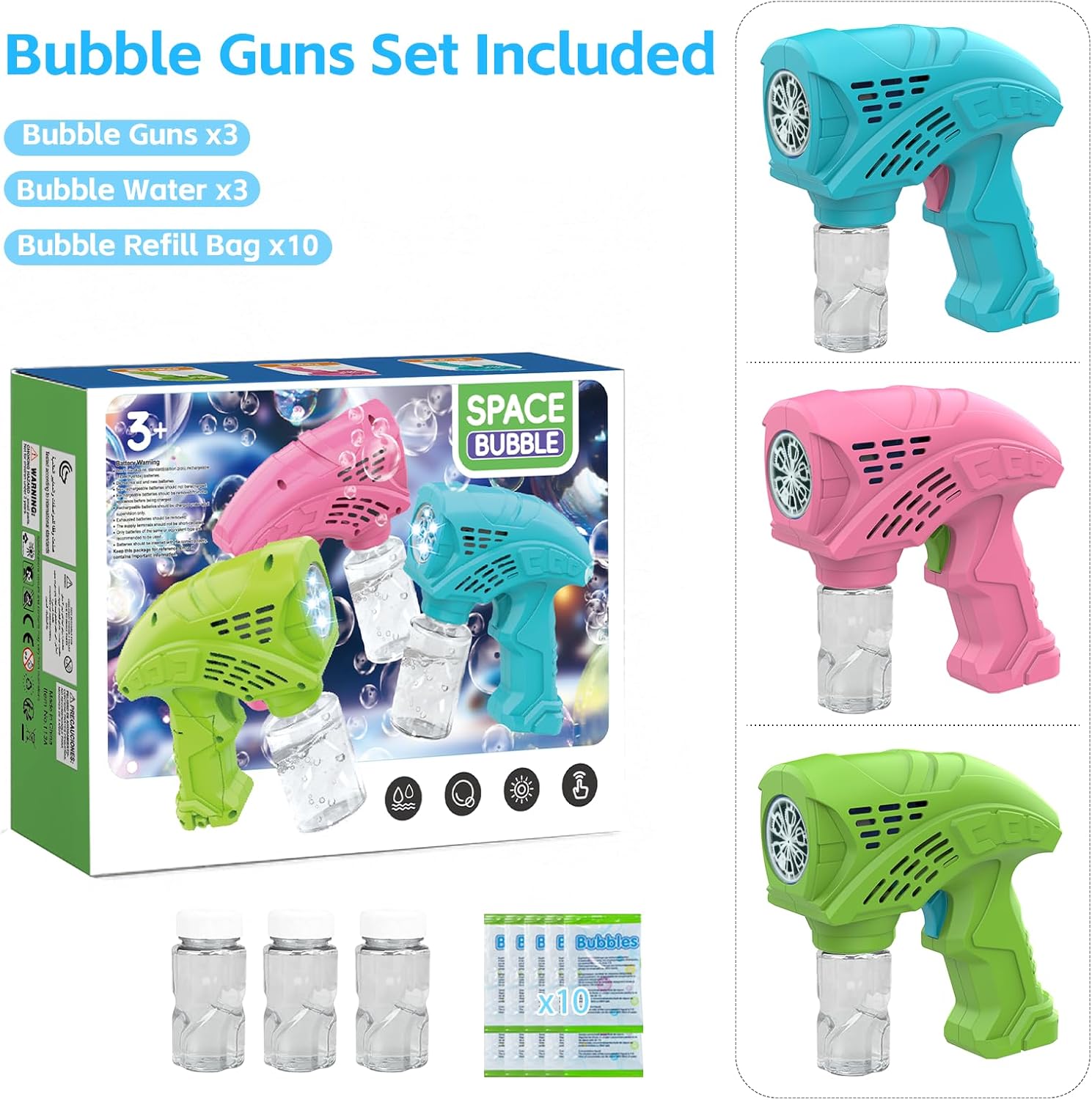 Pistola per bolle automatica migliorata: avvio con una sola pressione, questa pistola per bolle per bambini può produrre oltre 6.000 bolle al minuto. Grandi e piccini amano giocare e offrono divertimento illimitato ai bambini! Ideale per matrimoni, parchi, giardini e giochi interni ed esterni. Luci a LED alla moda: questa pistola elettrica per bolle è dotata di luci a LED luminose che brillano anche di notte, aggiungendo un'atmosfera magica alla festa delle bolle dei bambini. È il compagno perfetto per tutti i tipi di feste e attività all'aperto! Regala ai tuoi bambini una notte di bolle da sogno. Design impermeabile a 360 gradi: questa pistola a bolle per feste indispensabile è dotata di un'impostazione del liquido ultra impermeabile, che risolve completamente il problema delle perdite accidentali d'acqua. Più sicuro e pratico, permette ai bambini di giocare felici e ai genitori di rassicurarsi. Leggero e portatile, questo giocattolo a bolle ti consente di creare un gran numero di bolle sempre e ovunque. Materiali sicuri per i bambini: la nostra macchina per bolle per bambini è realizzata con materiali atossici di alta qualità e componenti sicuri. Robusto e durevole, permette ad ogni bambino di utilizzarlo in tutta sicurezza. La sua soluzione atossica ha superato tutti i test di sicurezza ed è sicura per la pelle e il viso dei bambini. È un regalo ideale per i bambini. Confezione: questo prodotto include tre pistole per bolle dai colori vivaci (rosa, verde, blu), 3 bottiglie di acqua per bolle e 10 bustine di liquido per bolle concentrato, per un'esperienza senza preoccupazioni. Non c'è più bisogno di preoccuparsi di rimanere senza bolle d'acqua. Gioca quanto vuoi senza fermarti! Condividilo con i tuoi amici e crea meravigliosi ricordi insieme.